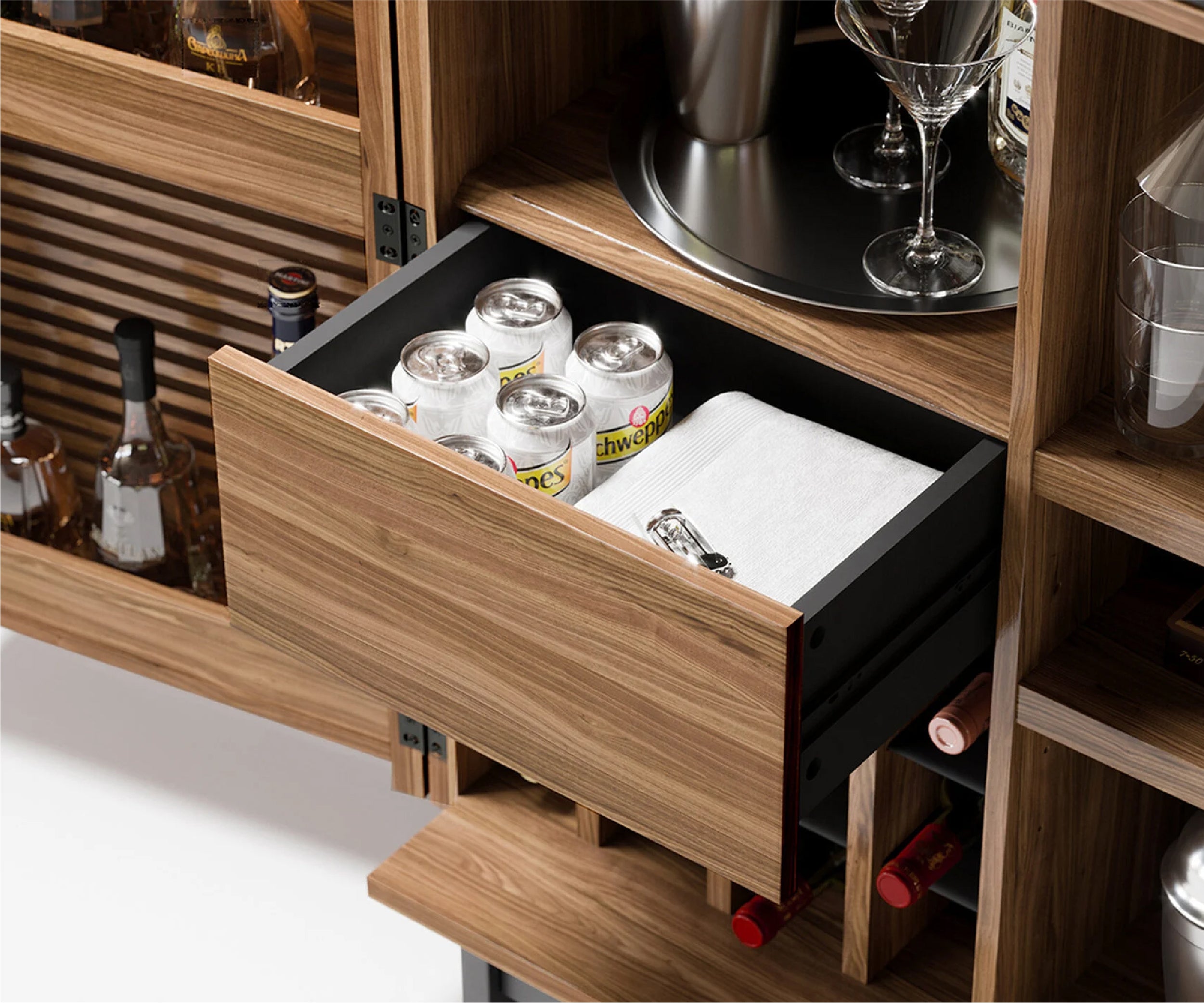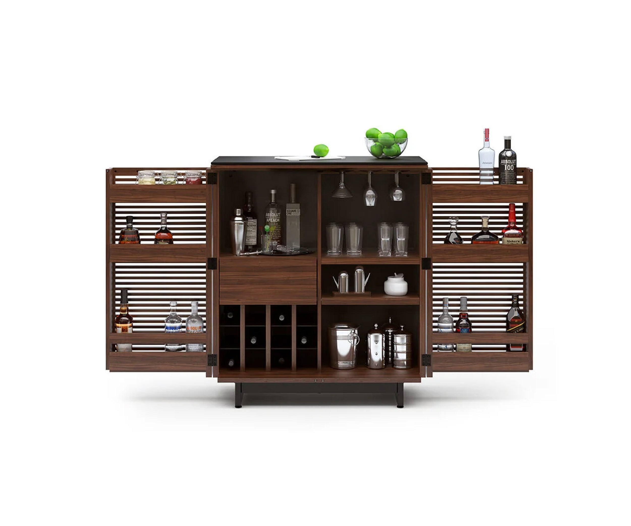 The Corridor Bar is the perfect cocktail of style and function. Double louvered doors open fully, revealing ample bottle and glassware storage and providing easy access to everything a stocked bar cabinet needs.