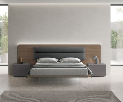 Leonardo is an authentically decorative piece of furniture: its headboard extends beyond the width of the bed frame, becoming an integral part of the wall. The textured cognac oak finish paired with fabric upholstery make this bed comfortable and refined.