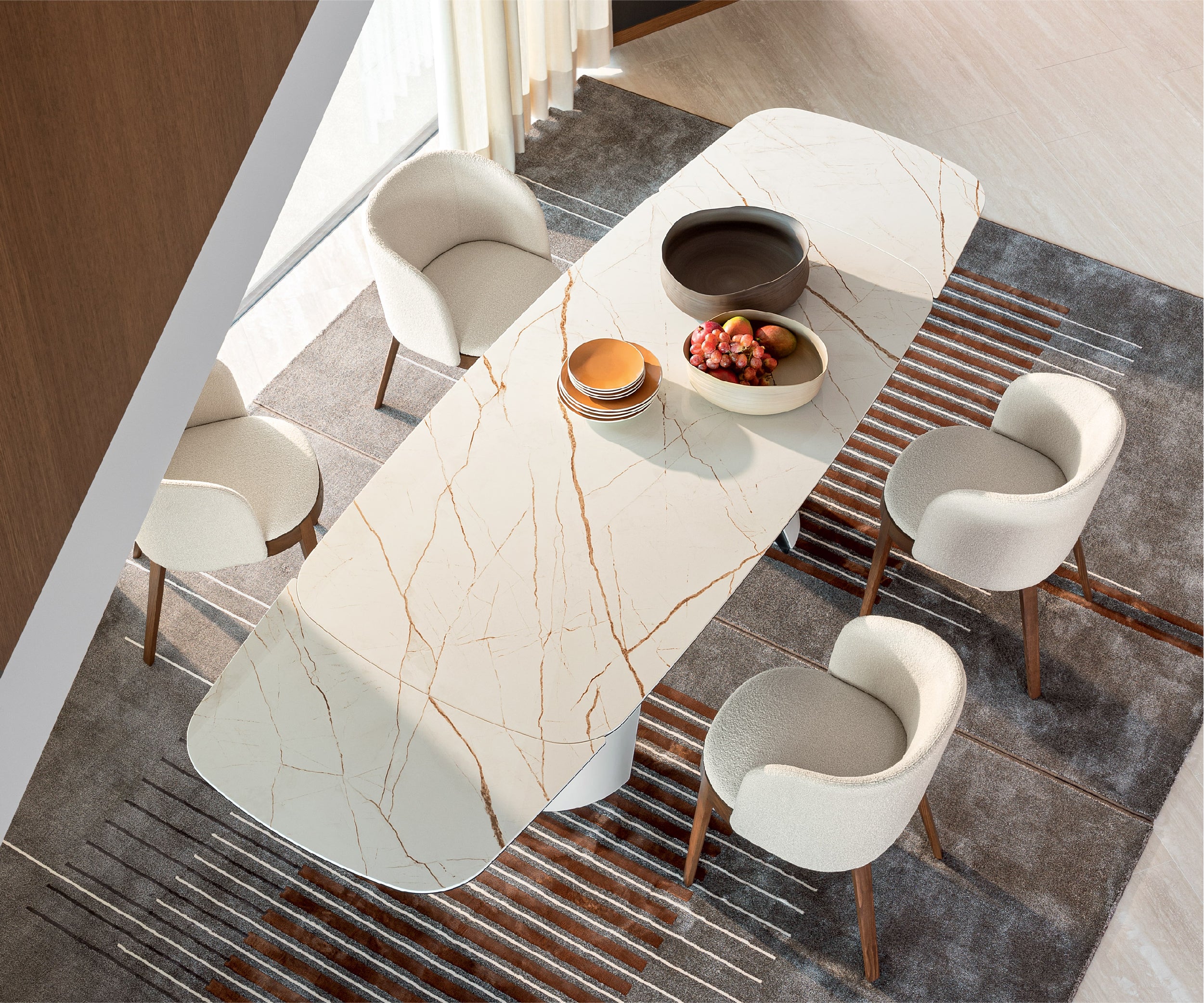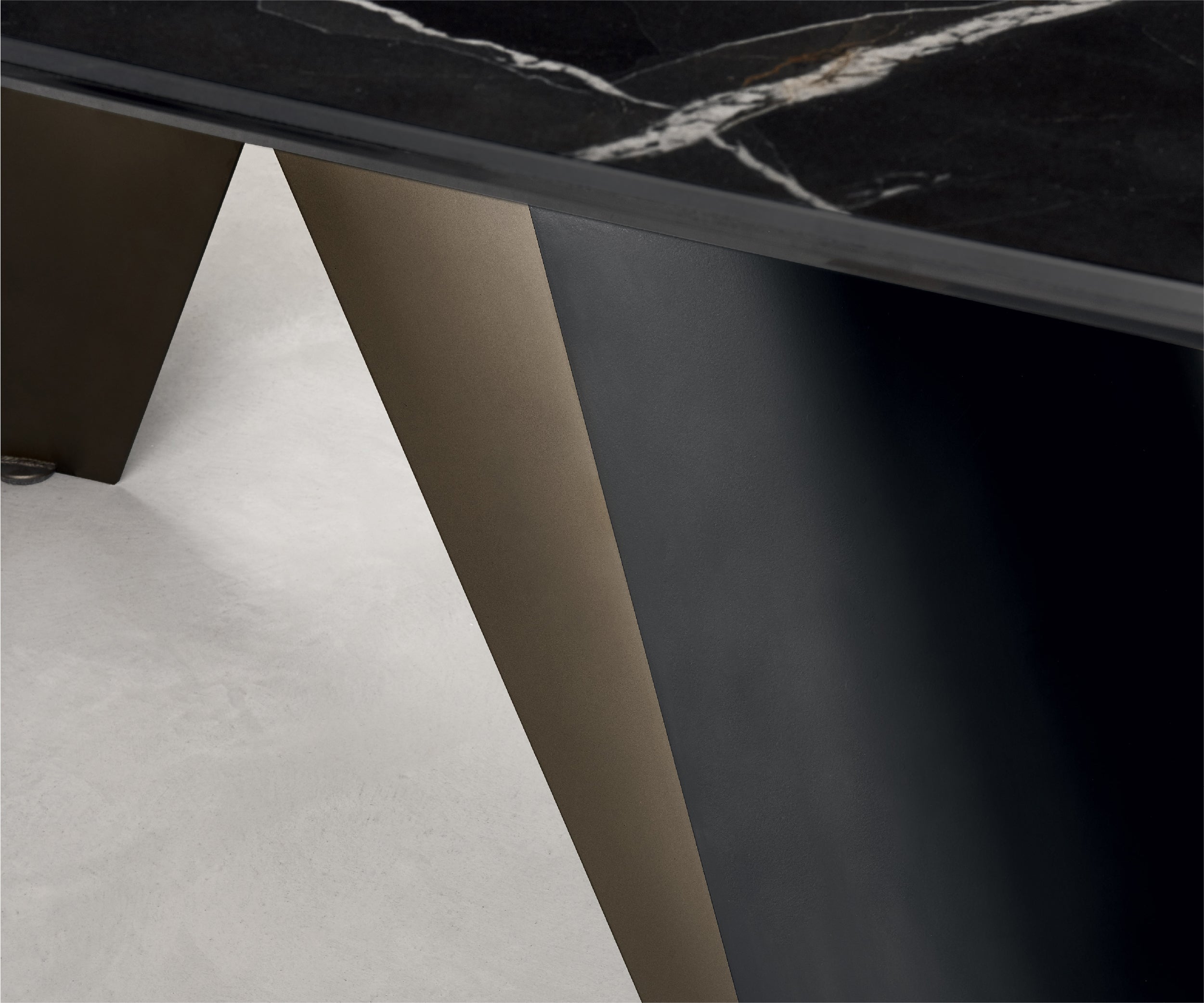 With its thoughtful proportions, the Apian table epitomises a design approach that sets great store by architectural stylishness and is underpinned by meticulously processed materials. Its airy aesthetic draws inspiration from the sheet metal bent into a semi-cylindrical shape and gently slanted upwards, creating a sharply defined base upon which the manually-extendable top rests (two side leaves mean that Apian can be pulled out to a length of 3 metres in total). One delightful detail on the pedestal base is the coating on the double sheet metal which catches the light and throws it back on an area that would otherwise be in dark shadow. Apian is one of those distinctive pieces that will instantly turn around an interior-design project.