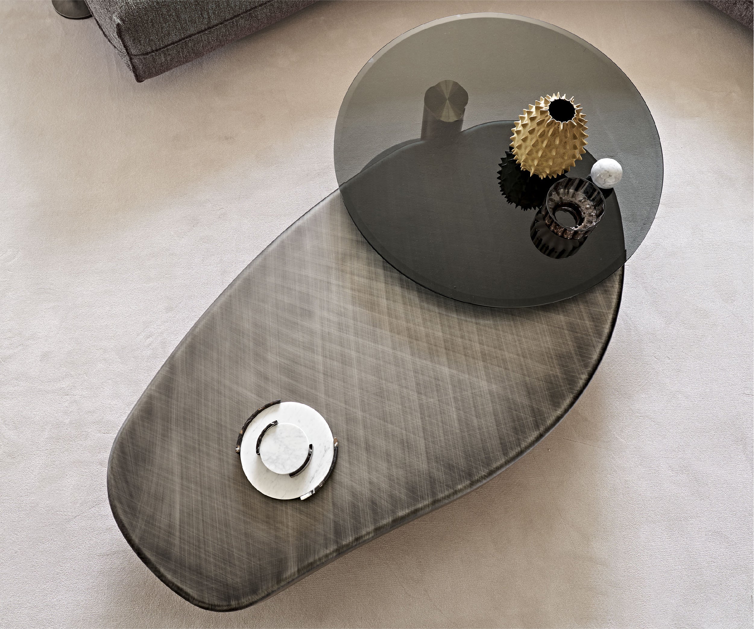 The line of Arena design coffee tables completes a modern and elegant living room, highlighting the precious hand-brushed finish. Skilled craftsmen print delicate and imperceptible scratches to create a weft and warp pattern.