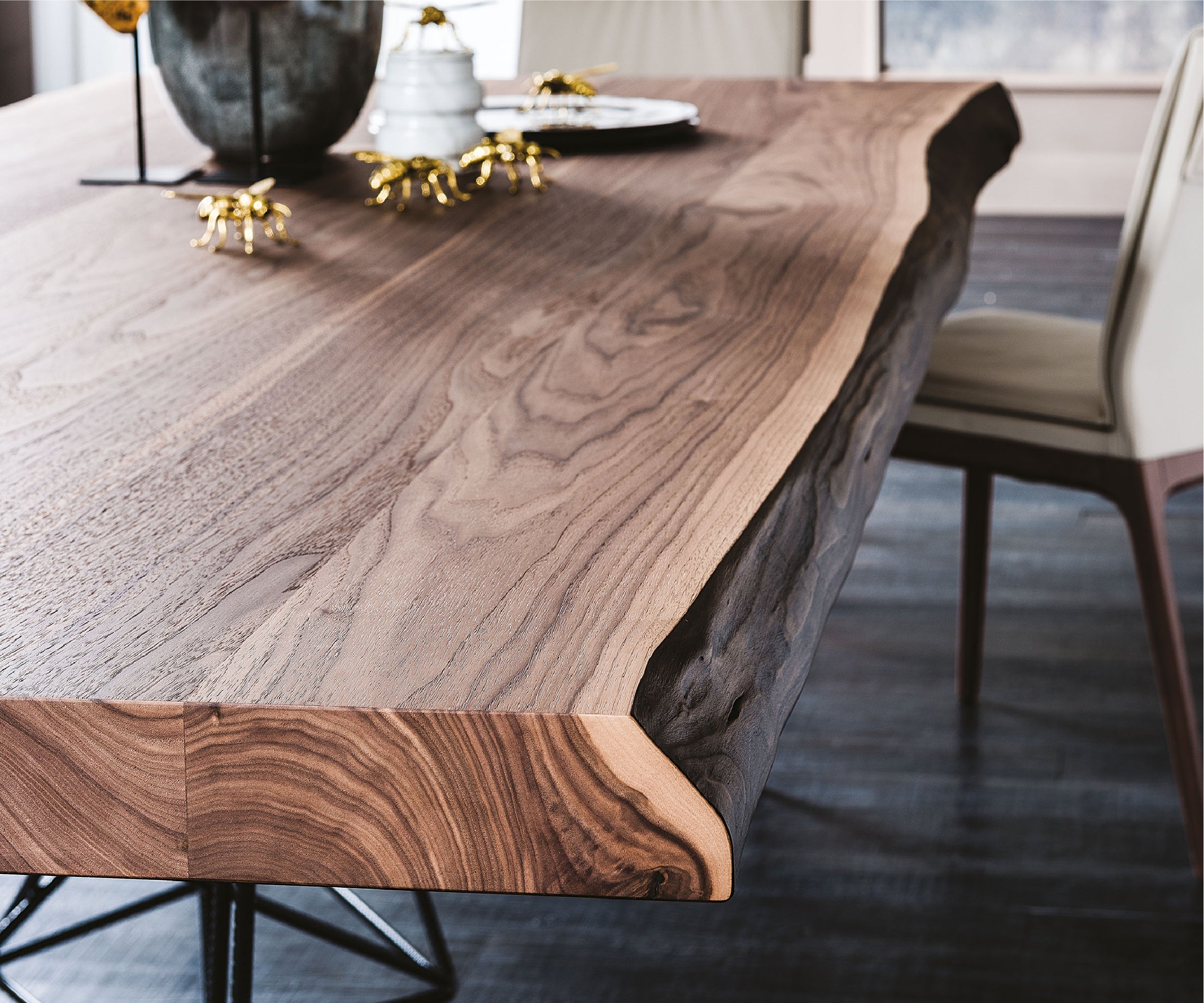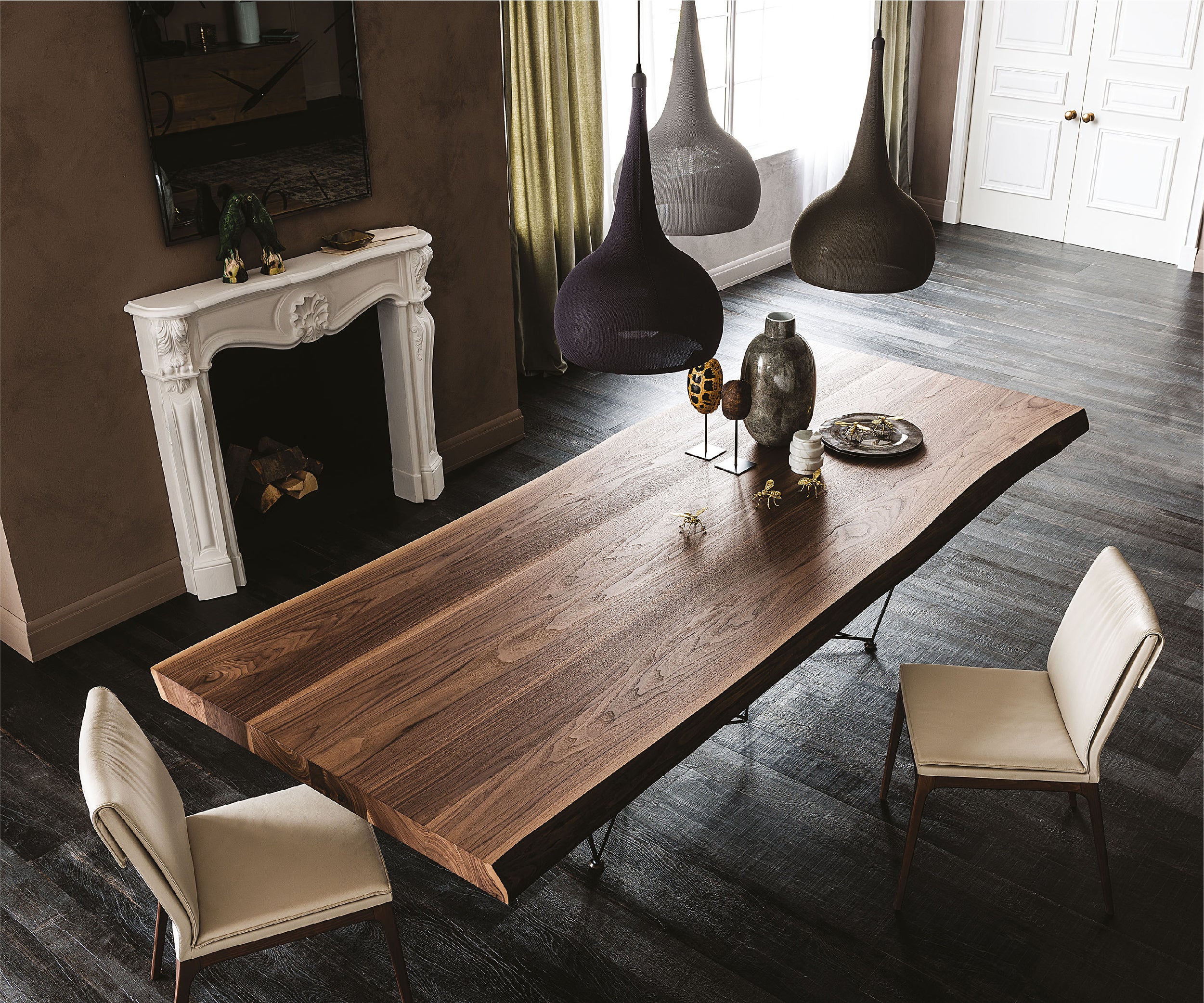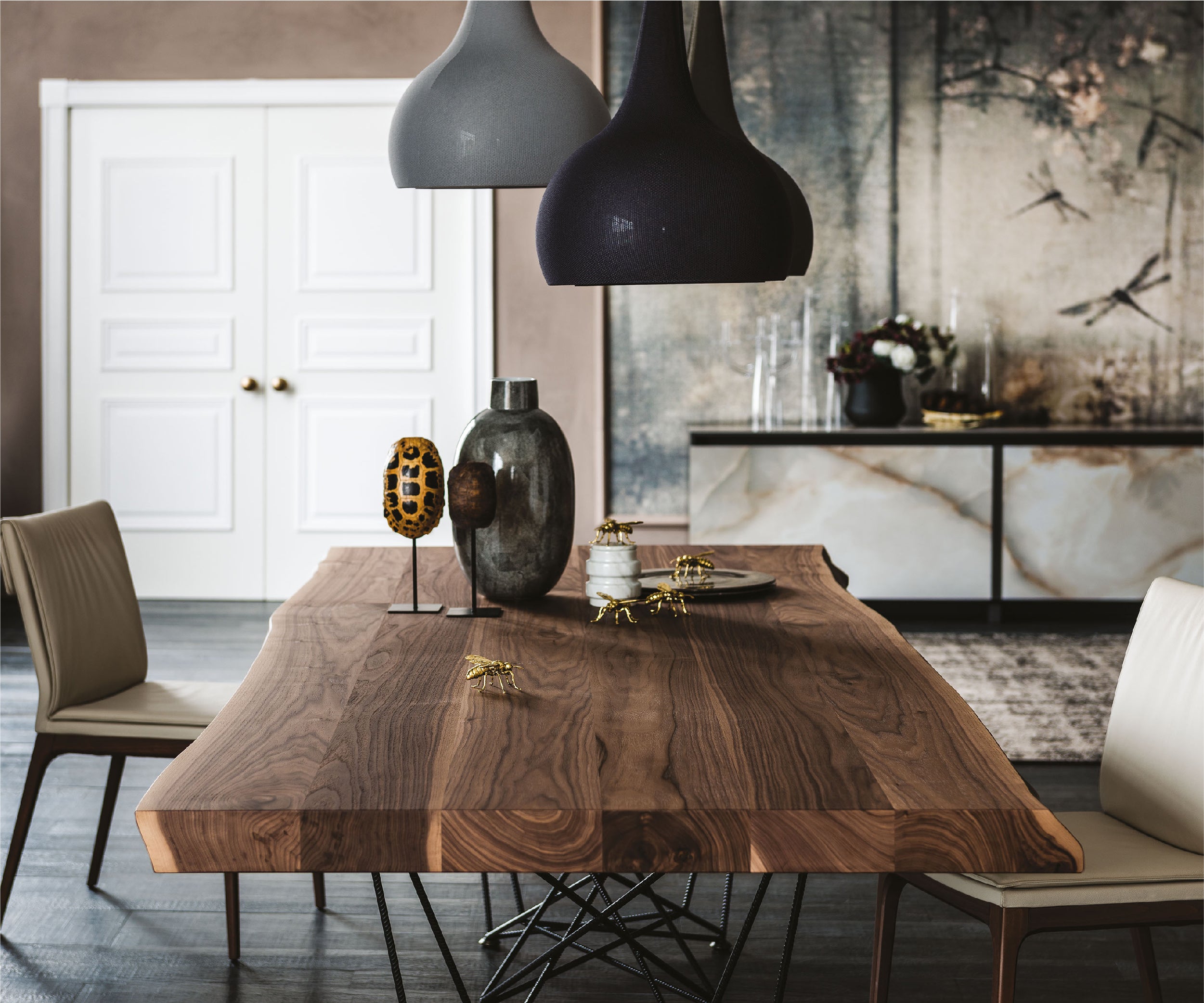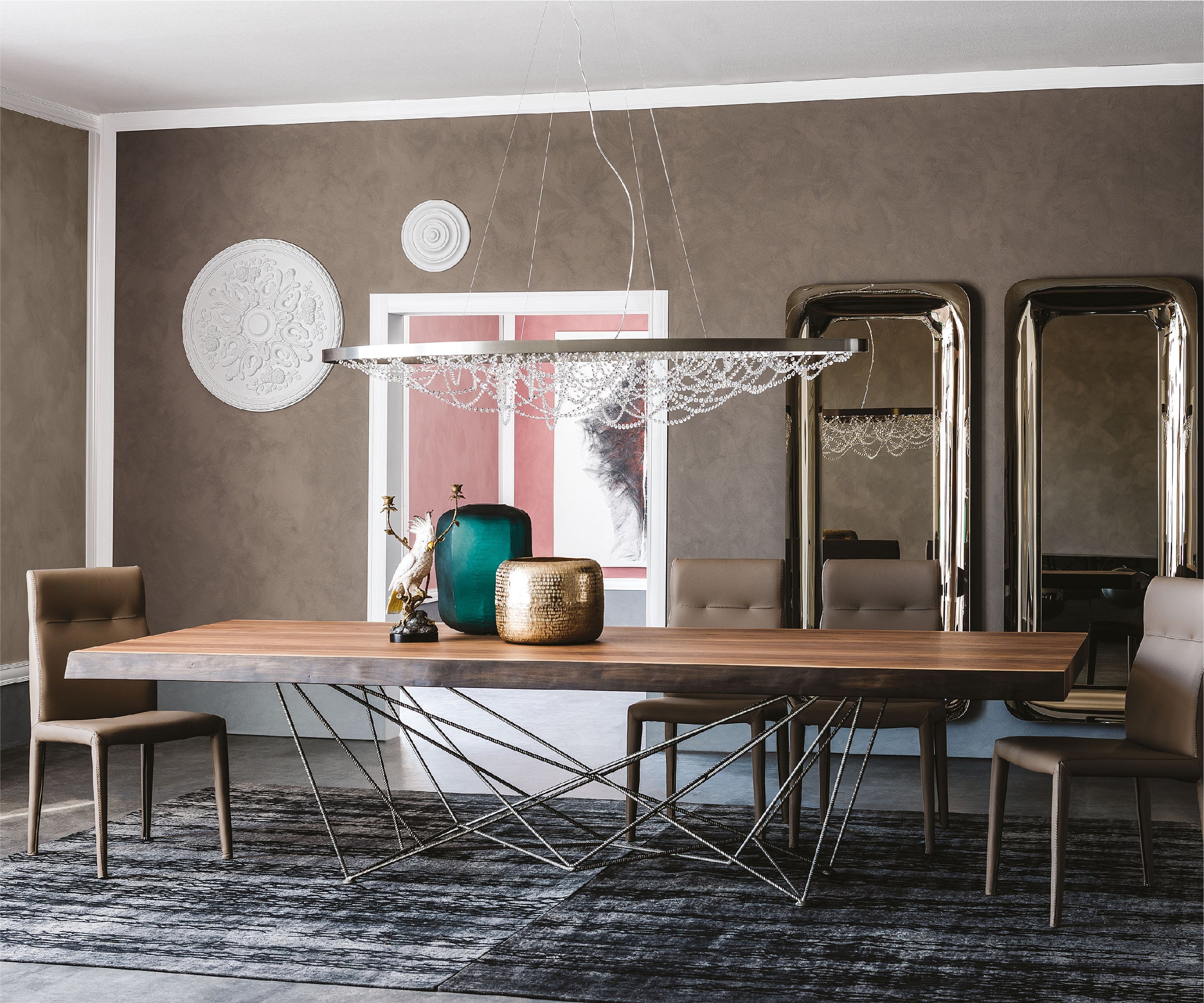 The family of modern tables Gordon, designed by Giorgio Cattelan, looks like a cross of geometric lines that move in an apparently chaotic way yet, instead, order and planning create perfect symmetry. This play is even more evident in the round model of the glass table, which is also available in ceramic, where, when viewed from above, the shape of a three-dimensional star is recognisable. The Gordon Deep Wood with wooden top has great strength and grandeur
