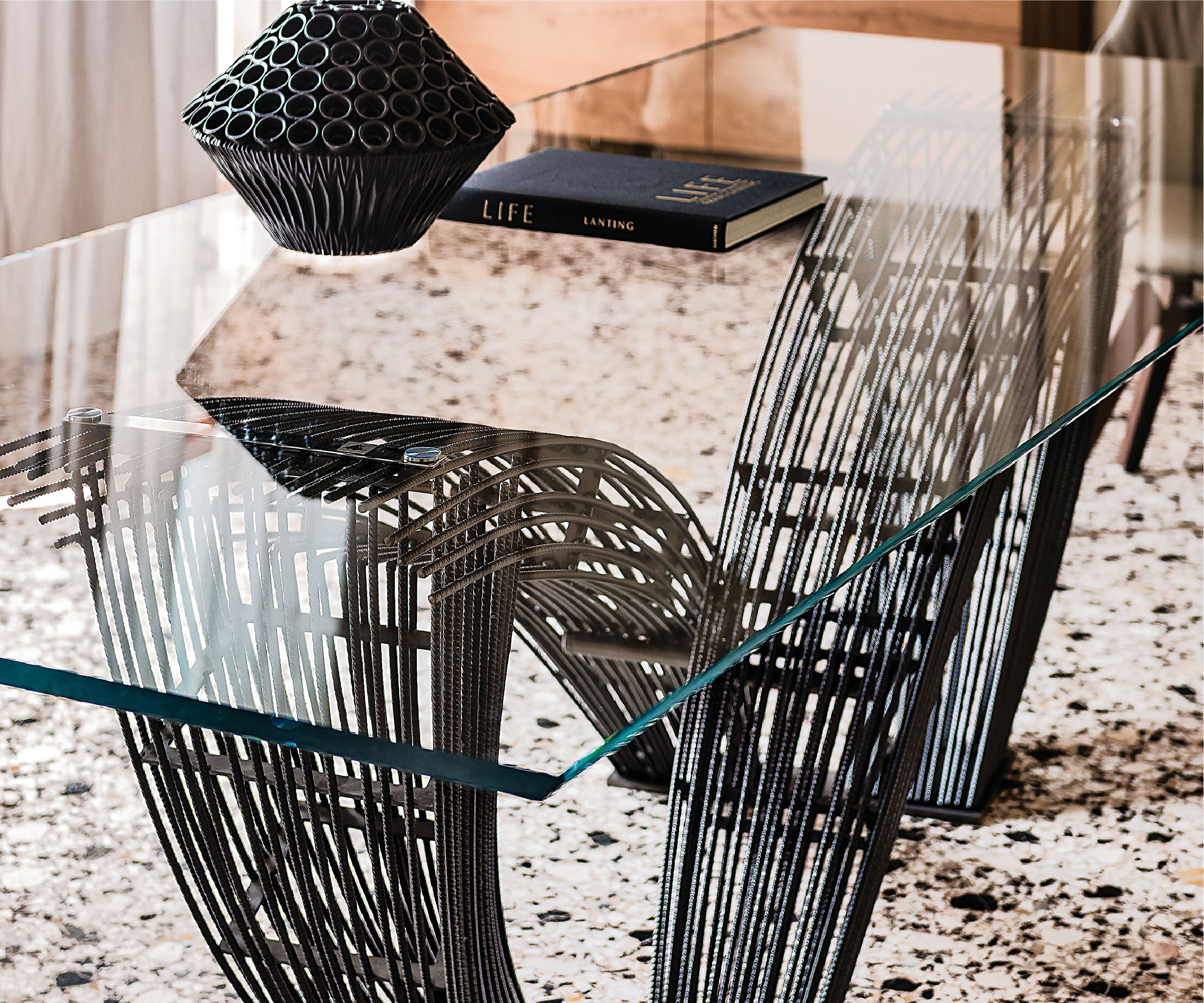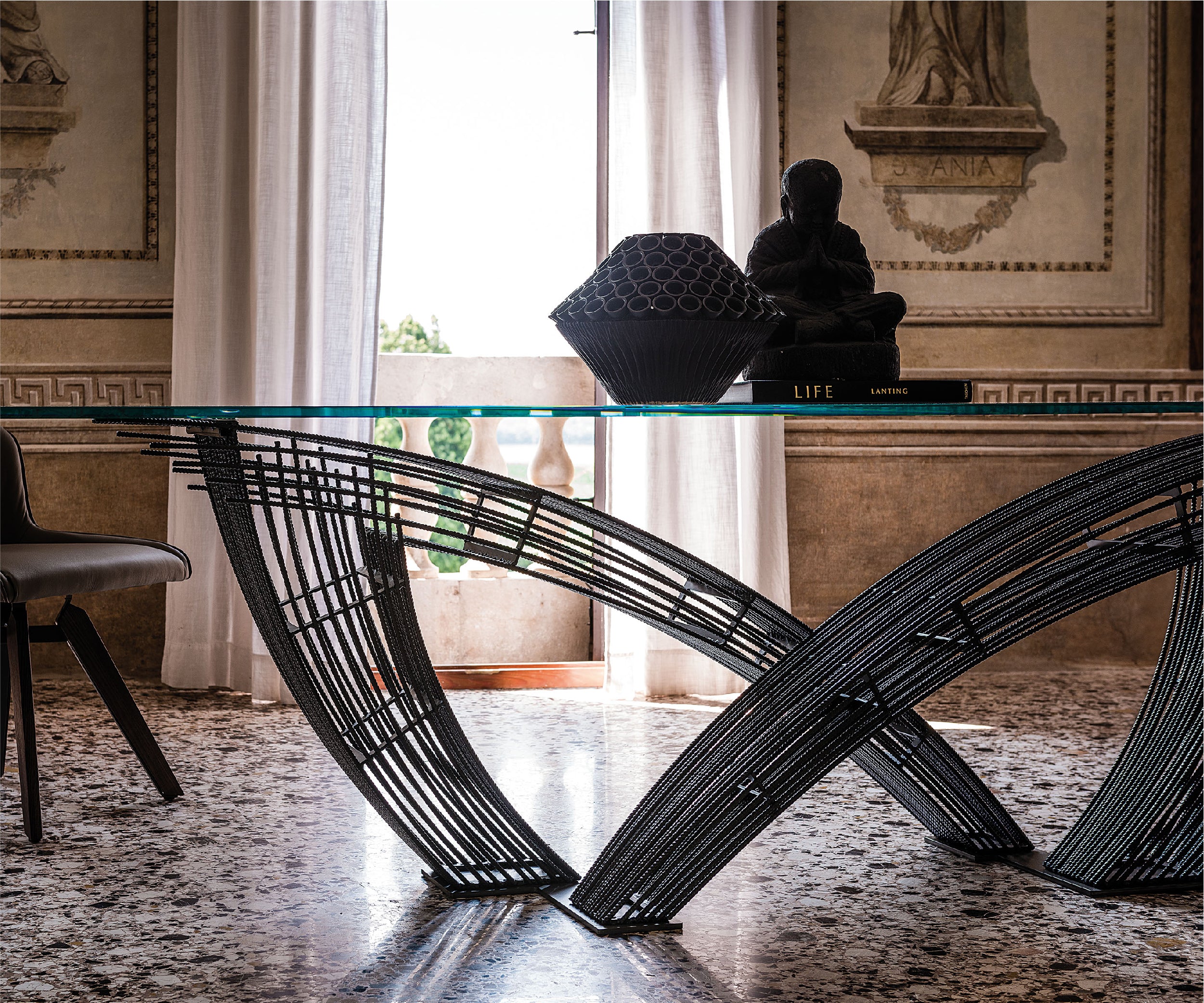 The modern table Hystrix, designed by Giorgio Cattelan, is the harmonious encounter between strength and refinement in a modern dining room. The metal shapes extend and intersect creating an intense composition, in stark contrast to the horizontal glass top, which allows you to appreciate the base in its entirety. This design glass table is an inimitable sculptured product, made unique by the crossed legs with unusual interweaving of threads, like the quills of a porcupine.