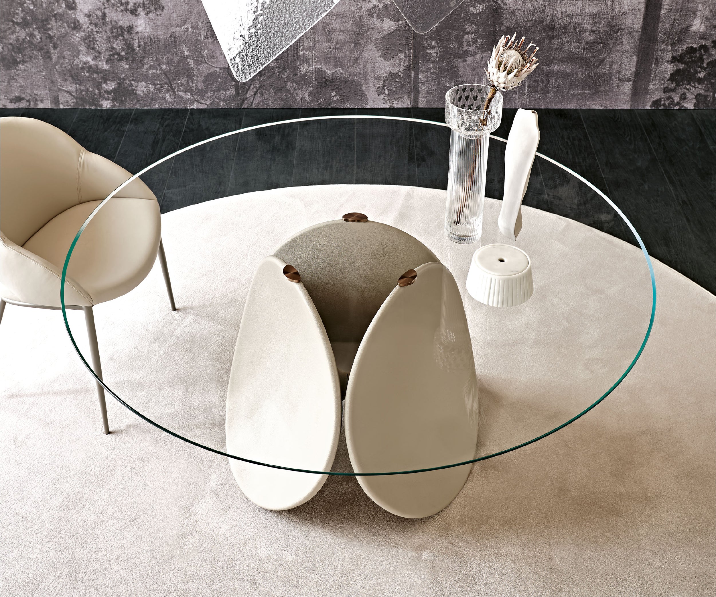 The design of the Maxim table-sculpture stems from the seamless link between its shape, consisting of three petals, and the material it is made from. Just as a sculpture emerges from the material in the hands of the master, likewise by looking at this round design table you can perceive the effort and time taken by man to shape it.