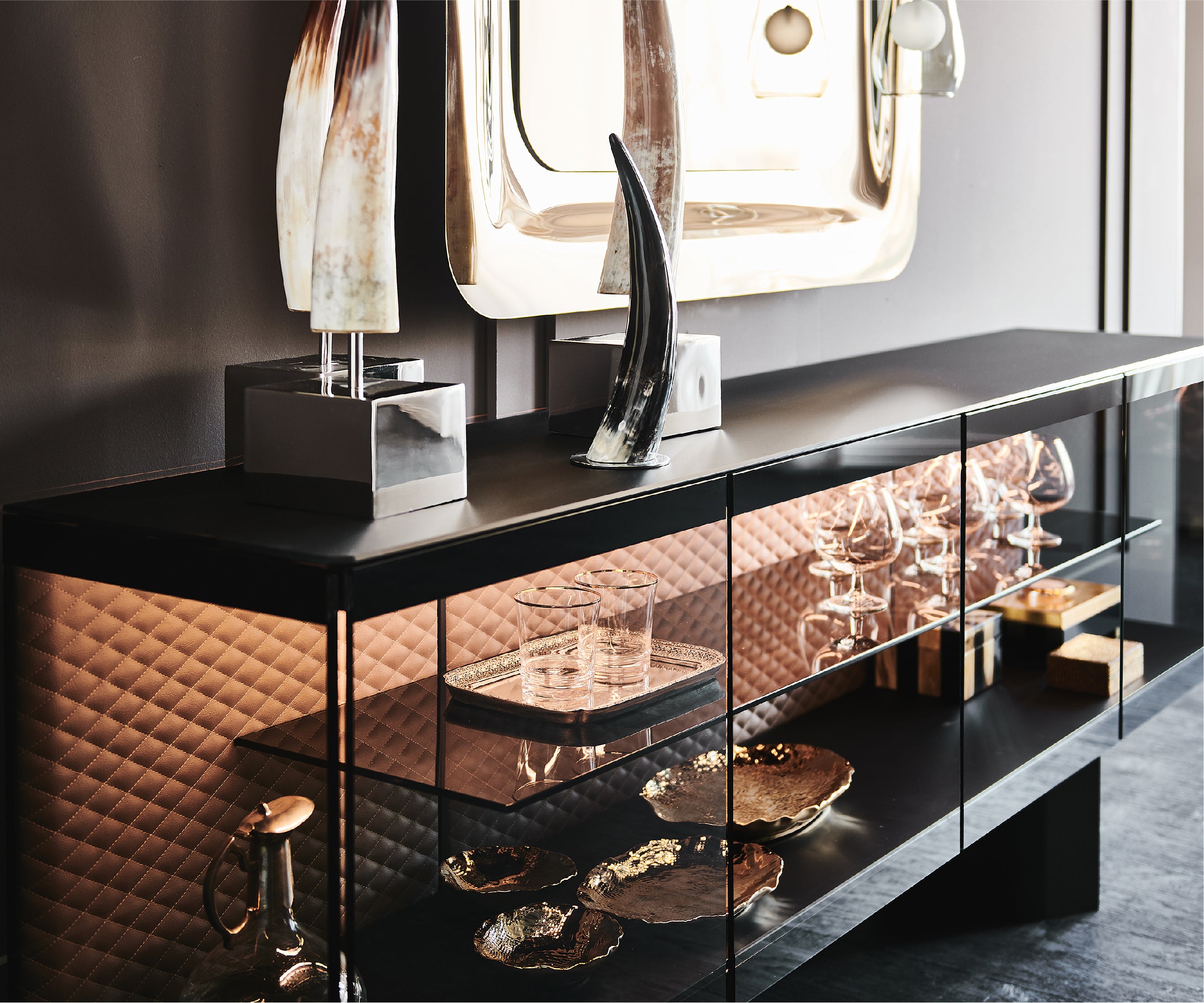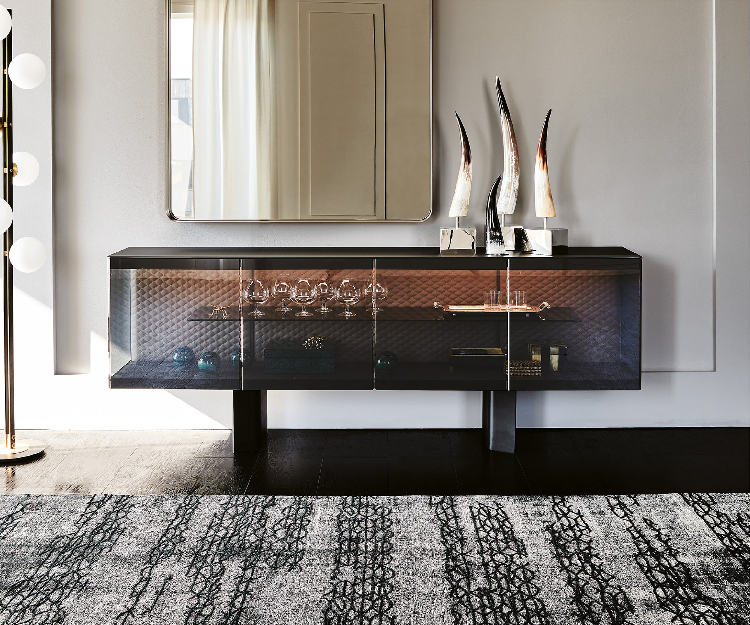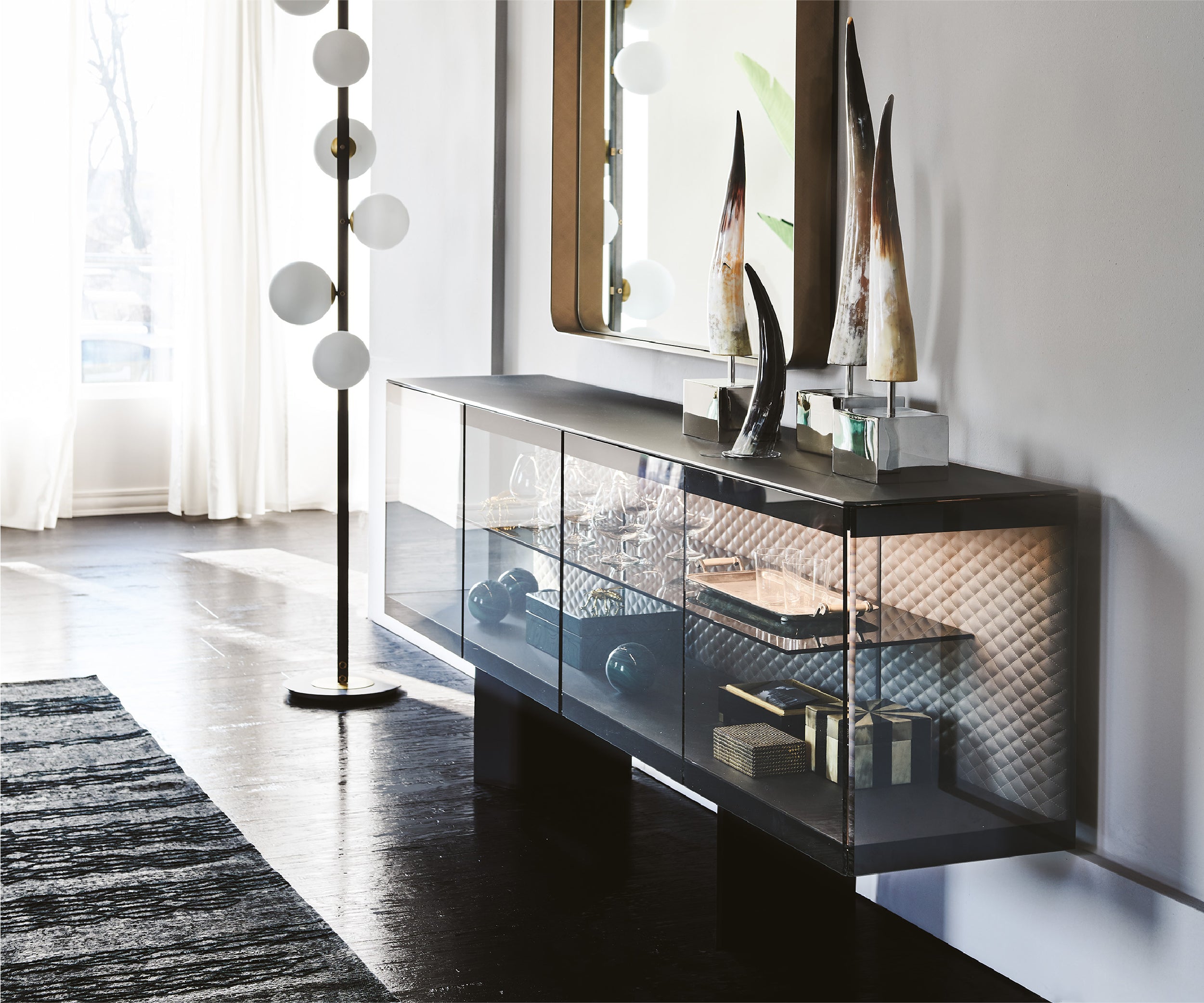 The most valuable items are displayed and preserved at once by the exquisite Boutique sideboard, conceived by Alberto Danese. The internal glass shelves, the quilted upholstered backrest, and the LED lights are all details desiged to valorize the objets that are kept inside this design cabinet, that decorates the living area with refined taste.