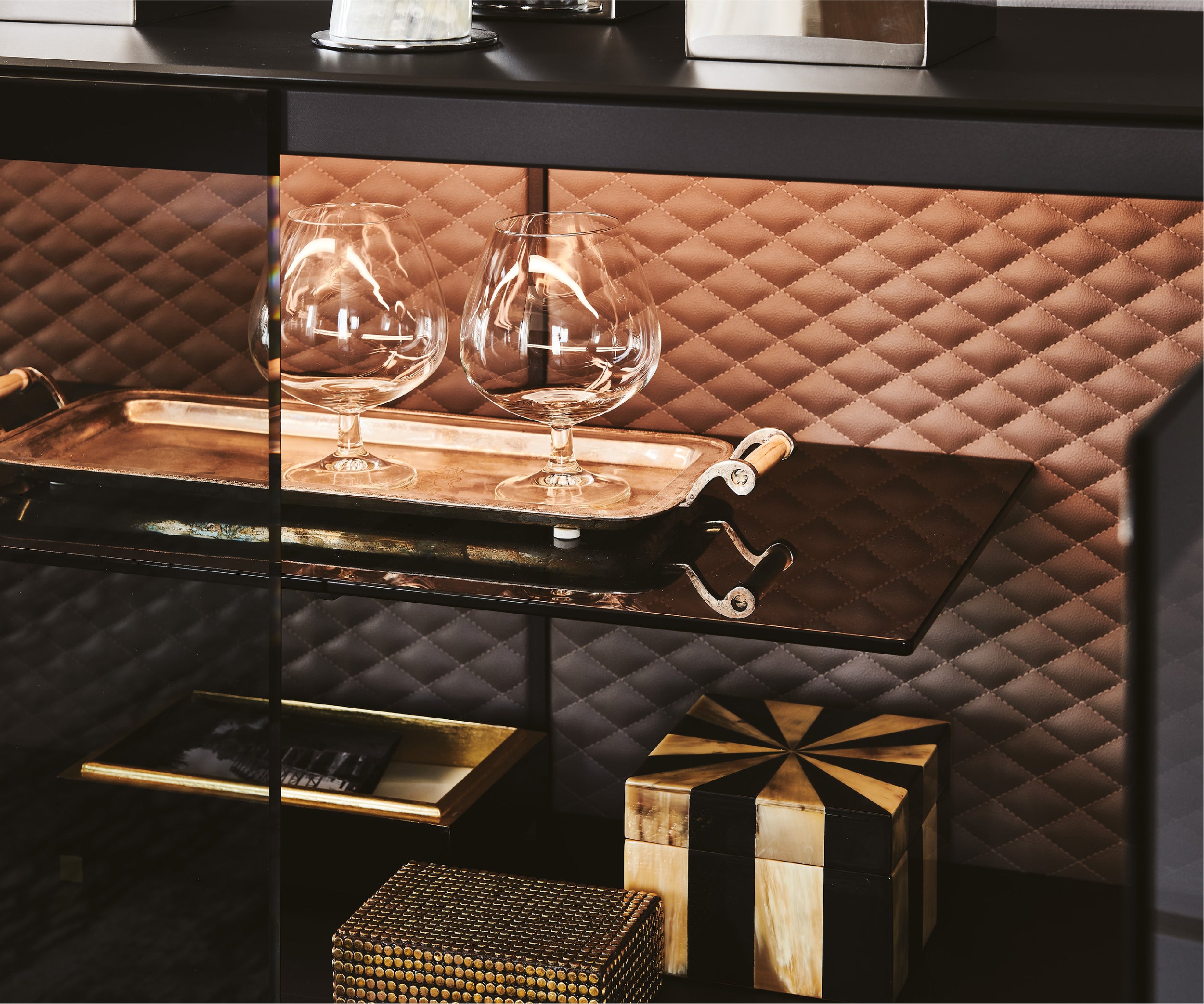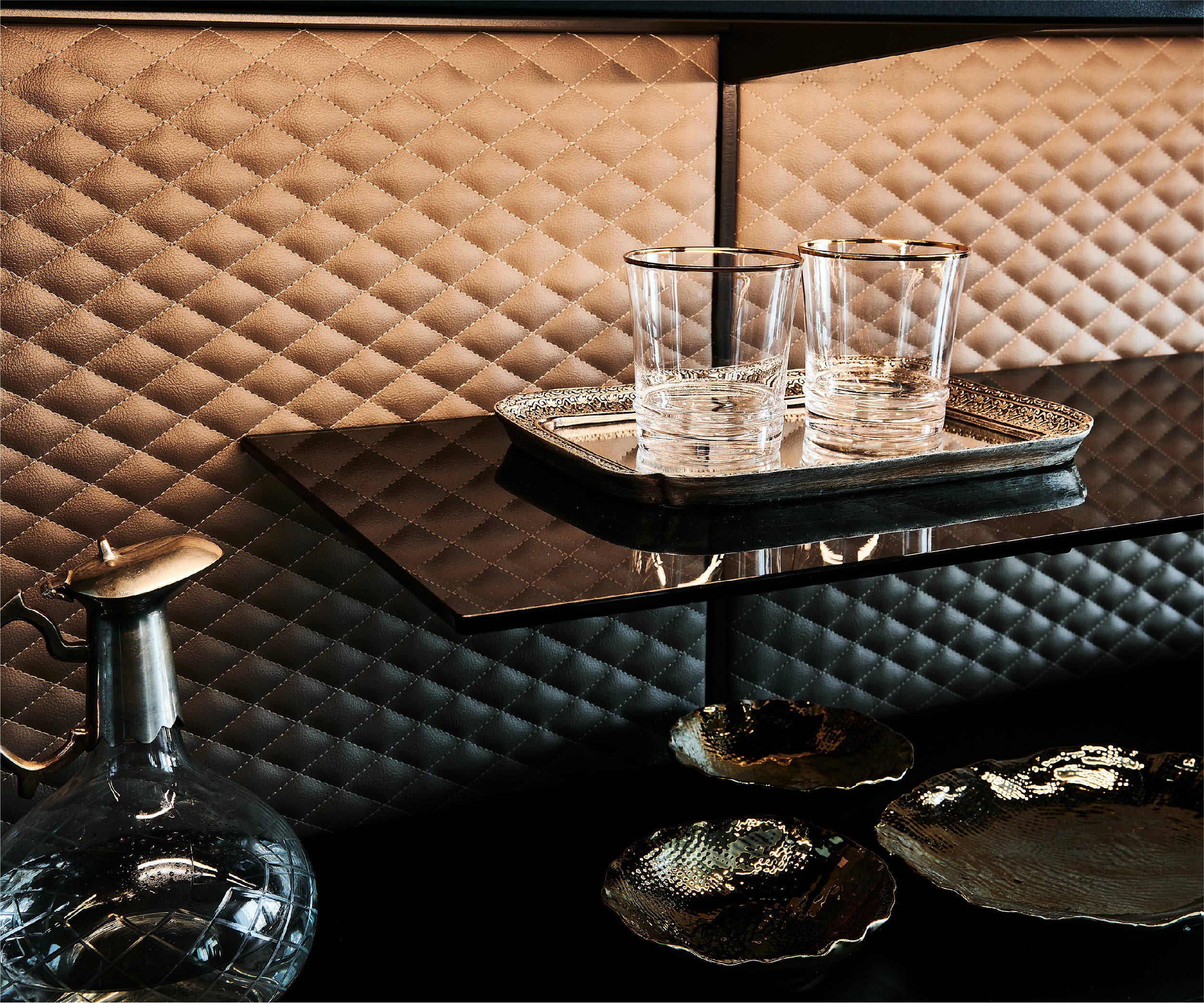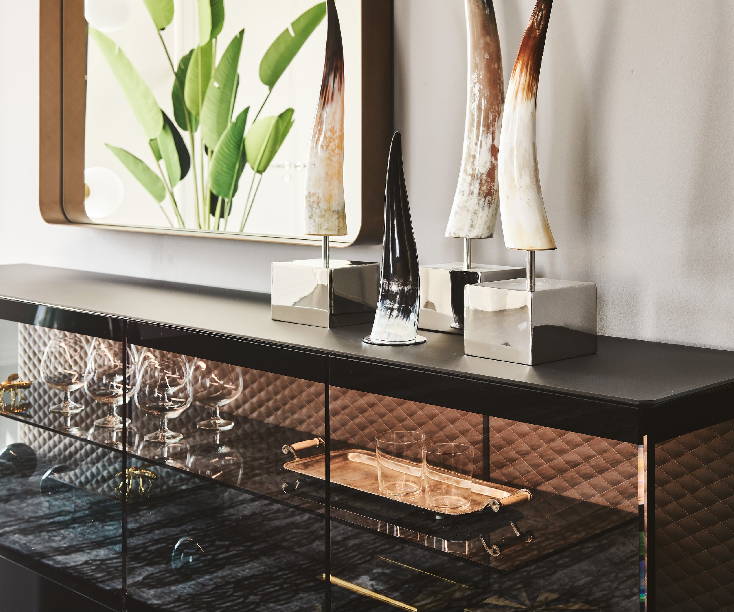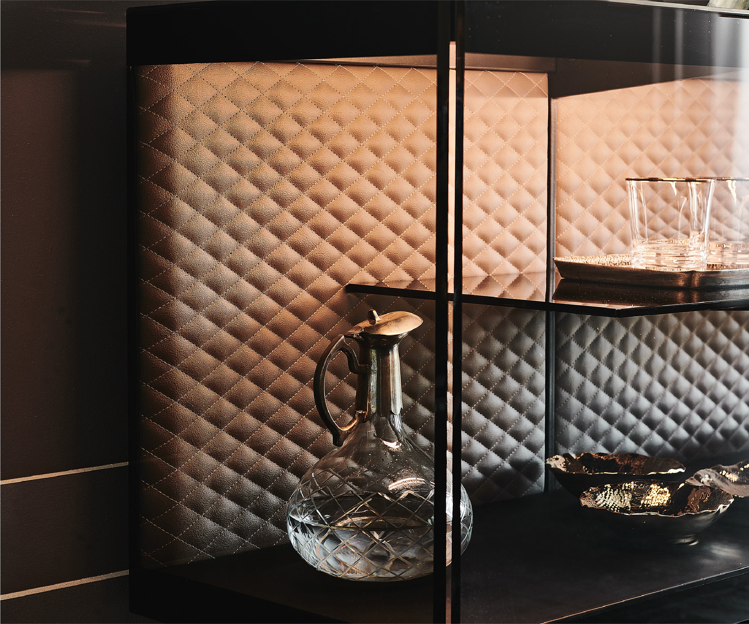The most valuable items are displayed and preserved at once by the exquisite Boutique sideboard, conceived by Alberto Danese. The internal glass shelves, the quilted upholstered backrest, and the LED lights are all details desiged to valorize the objets that are kept inside this design cabinet, that decorates the living area with refined taste.