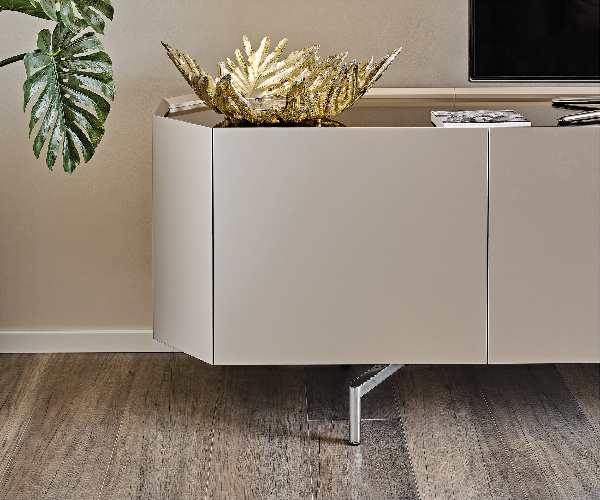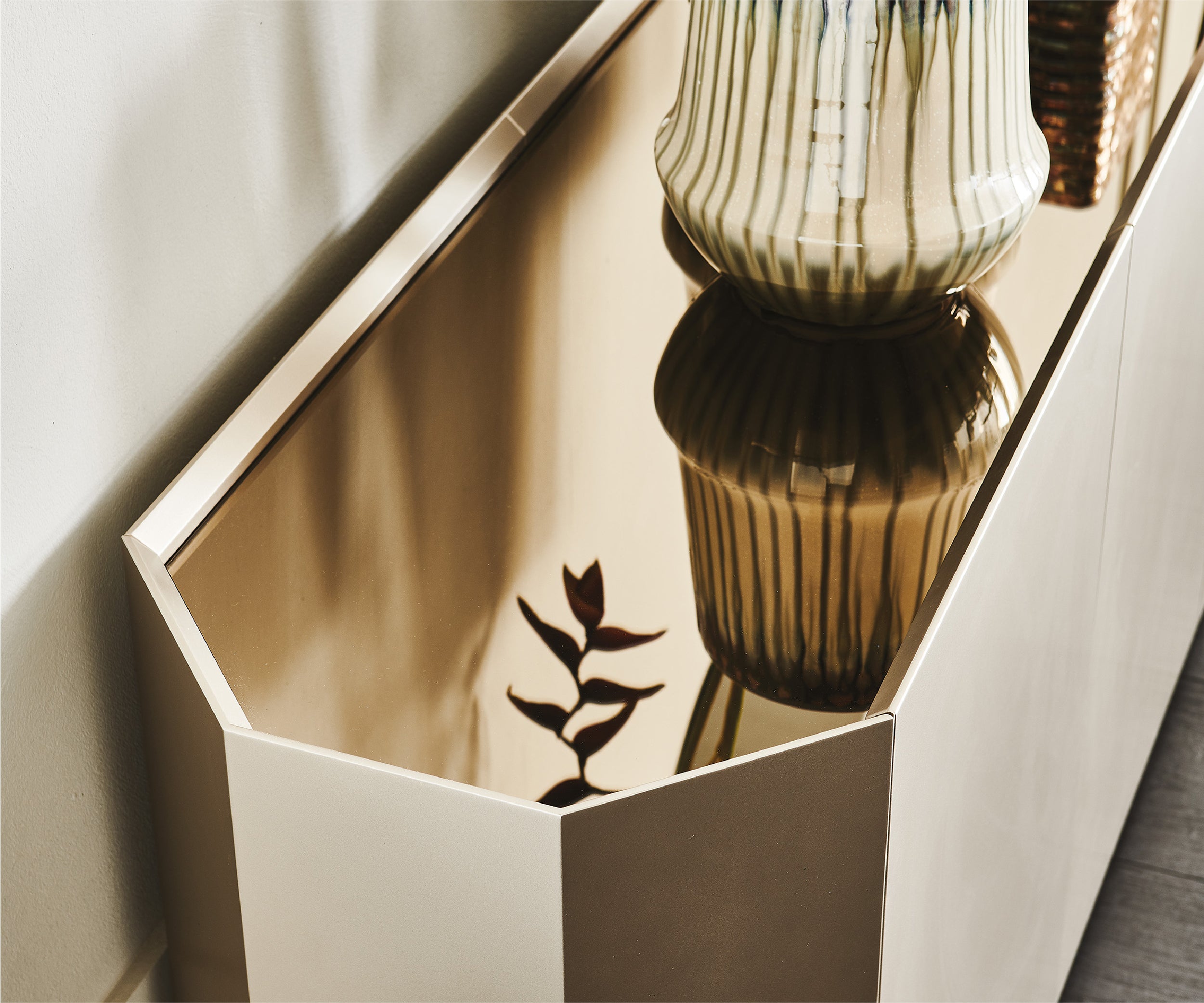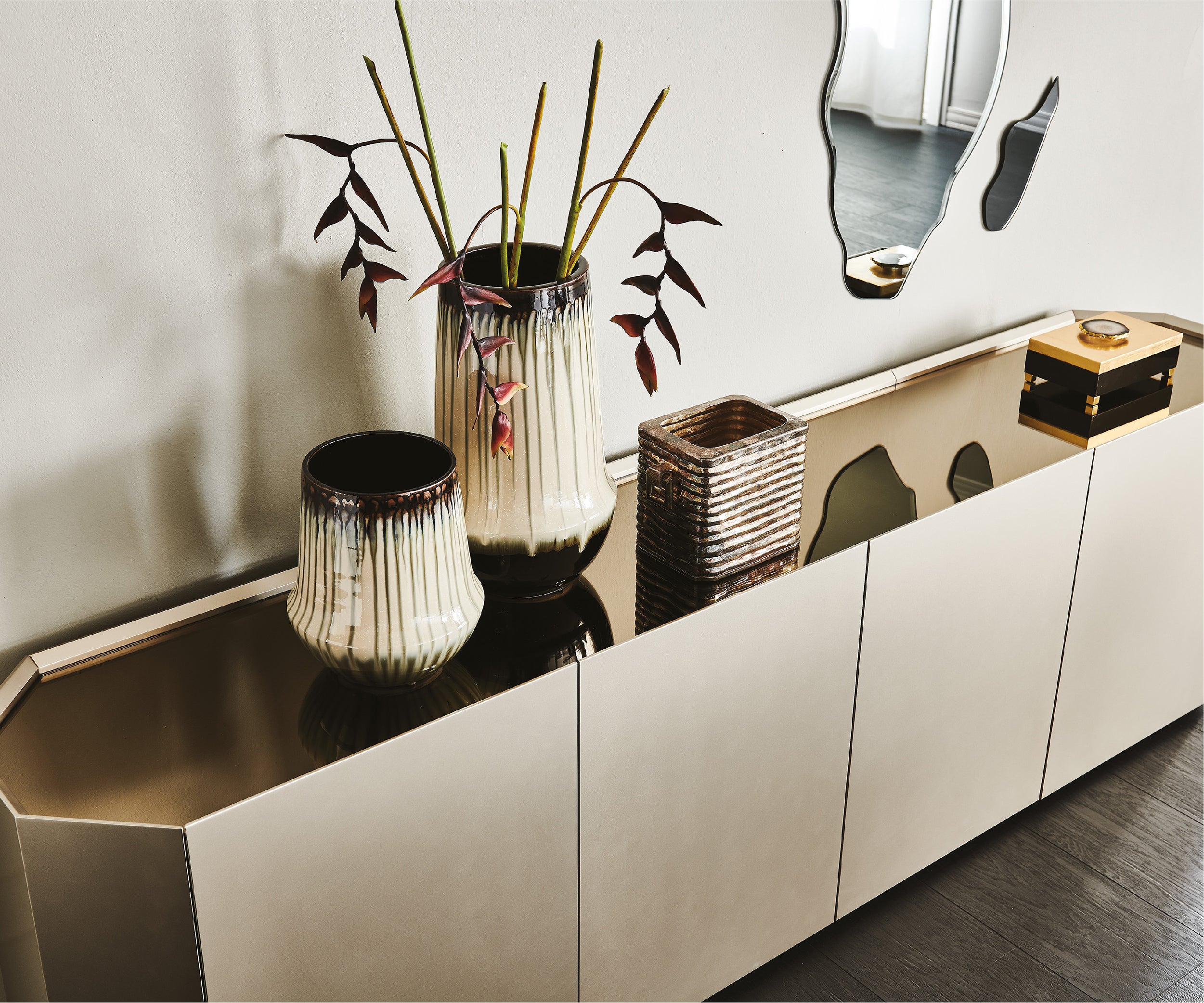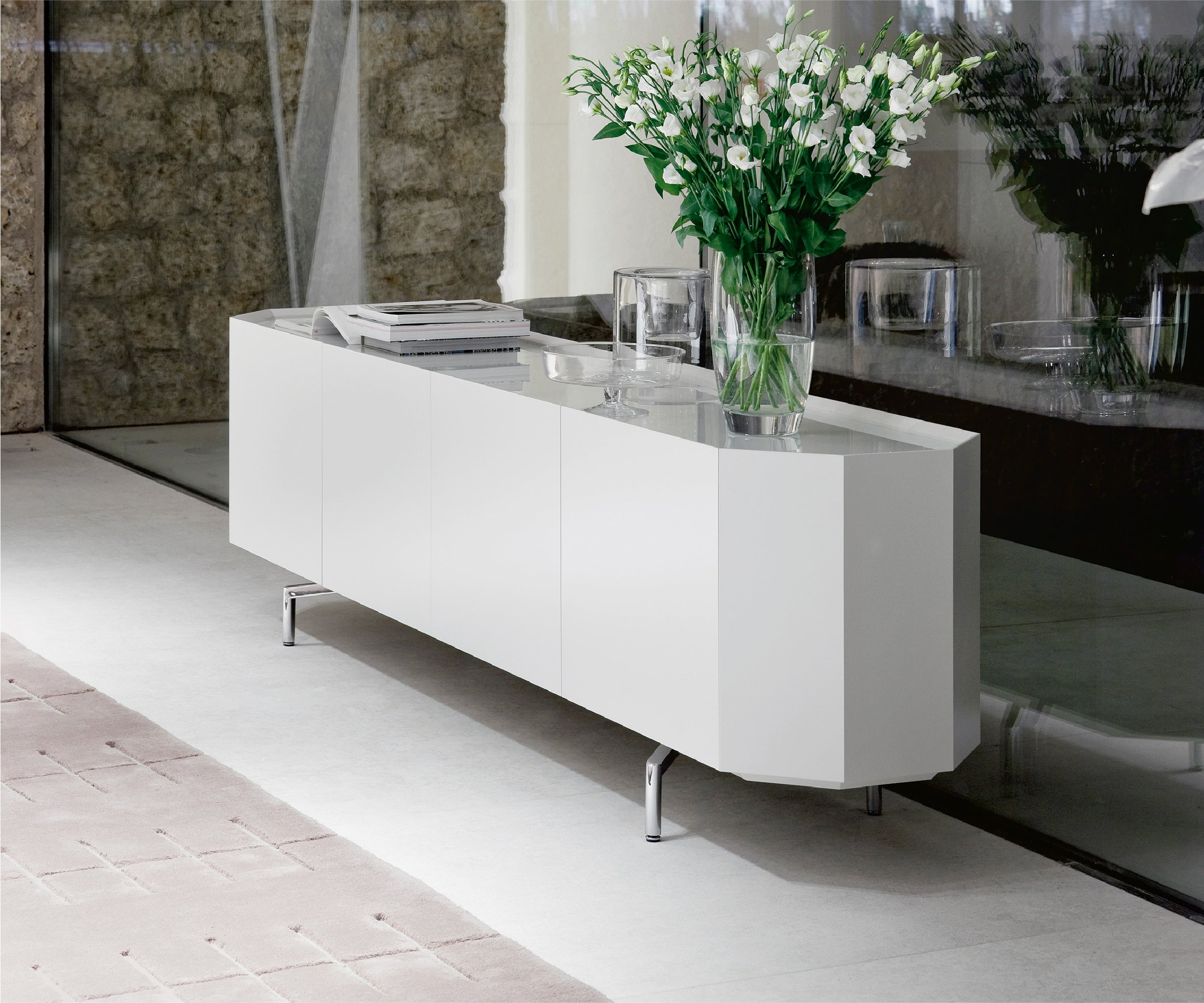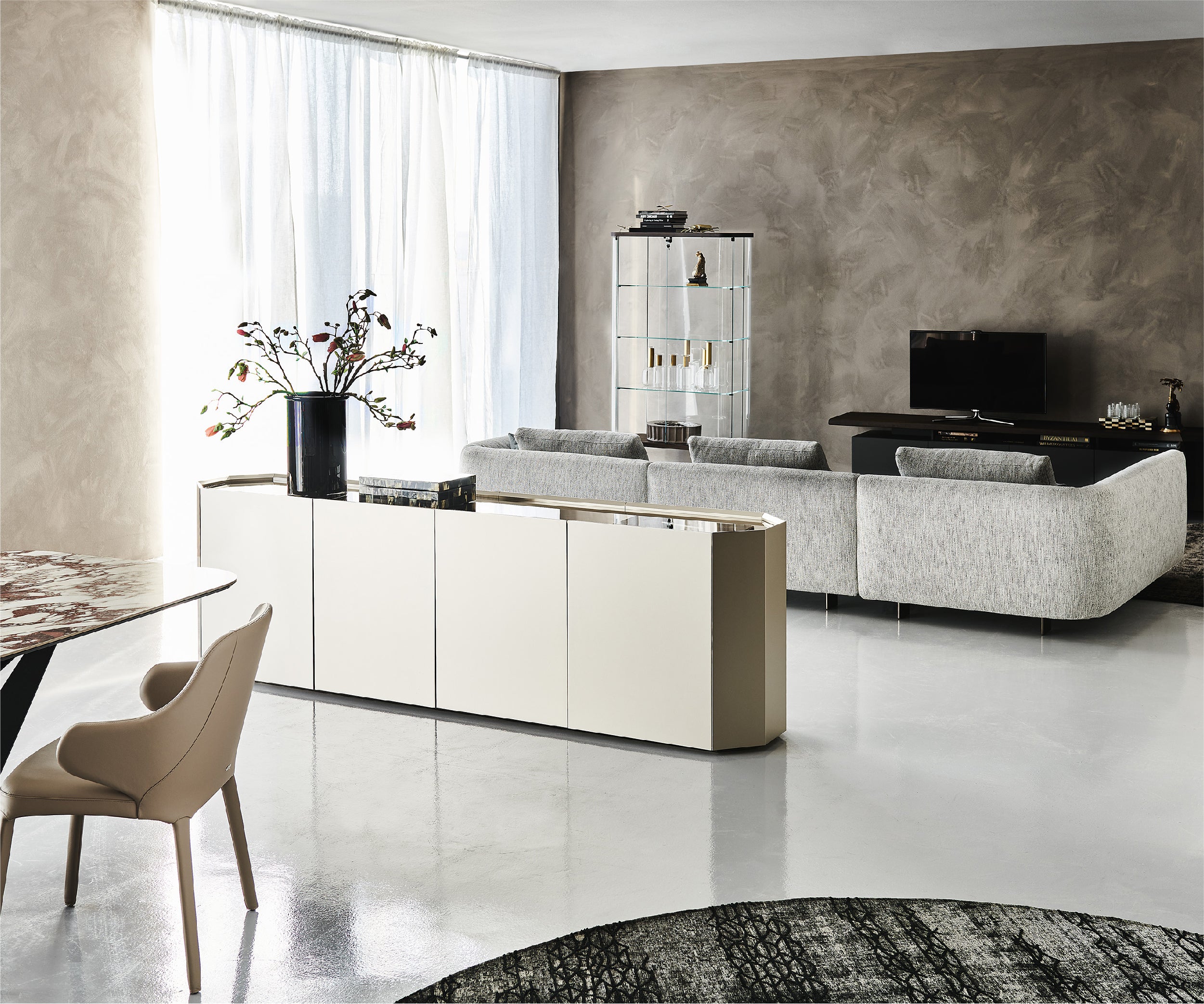 The sculptural and geometrical Chelsea modern sideboard, designed by Alessio Bassan, integrates harmoniously into the living room style, both in residential and contract interior design projects. This minimalistic cabinet with an eclectic taste is enriched by fine details and exclusive finishes, such as the transparent glass top. Chelsea is equipped with fine shelves in transparent glass with the purpose of storing the most valuable and exquistite objects.