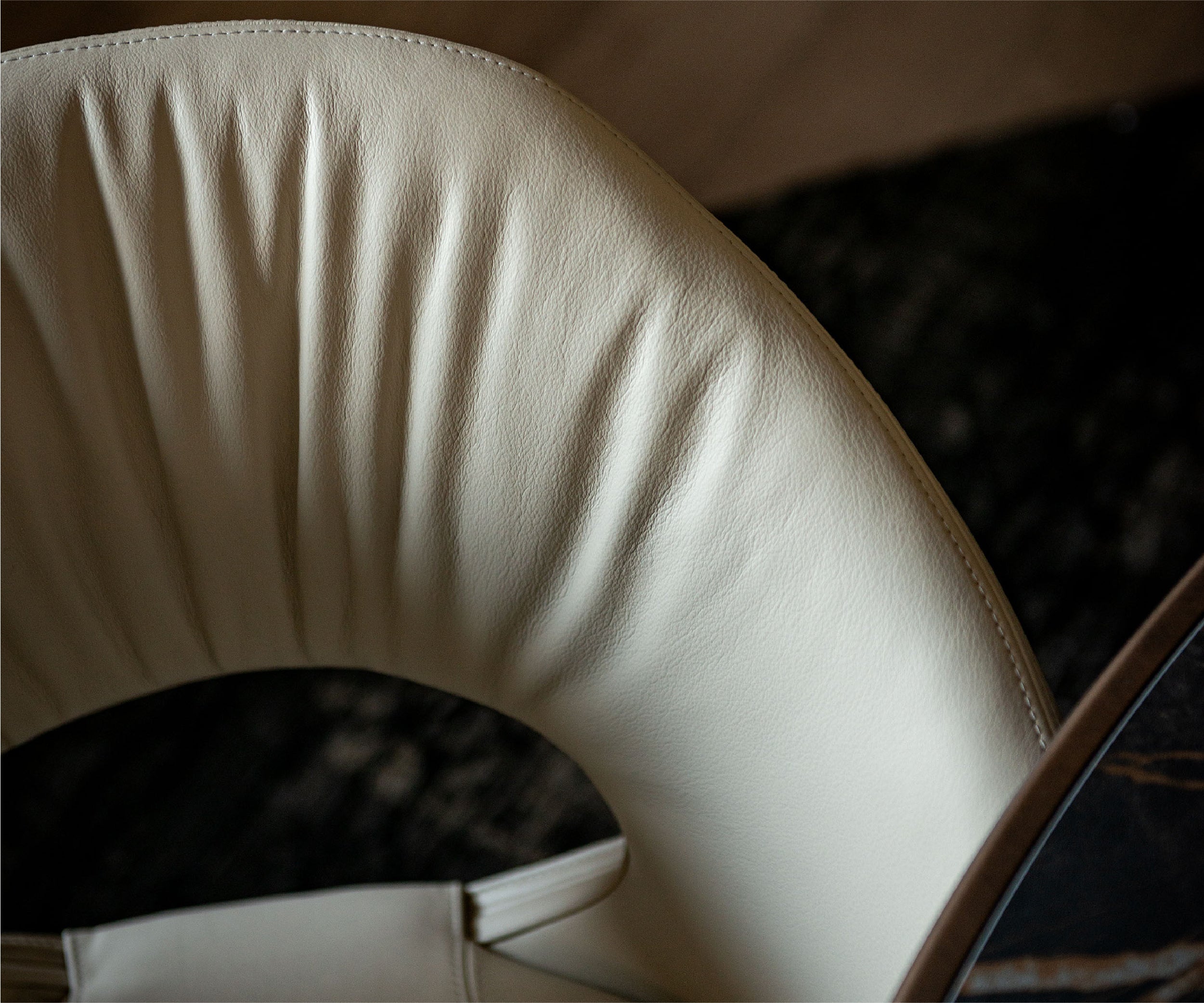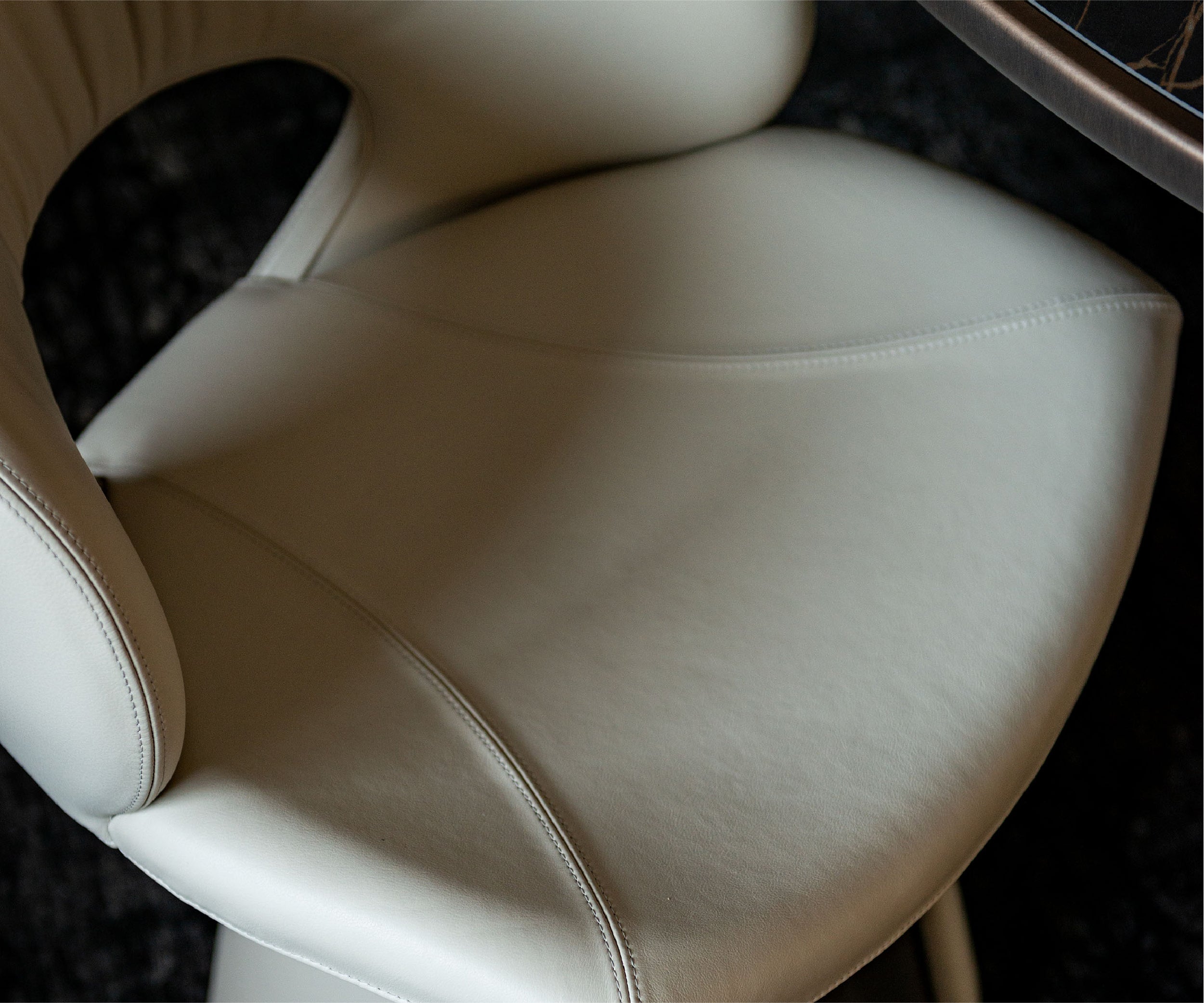 Dafne is a unique and distinctive chair with a perforated backrest that is the result of the creativity and stylistic research carried out by CS LAB. The structures of the cone-shaped base and body are rich in bespoke details, crafted with the utmost care and precision. The upholstery, which can be chosen from a wide range of fabrics and leathers, wraps around the base like a cloak, revealing a brilliantly finished metal breastplate on the front.