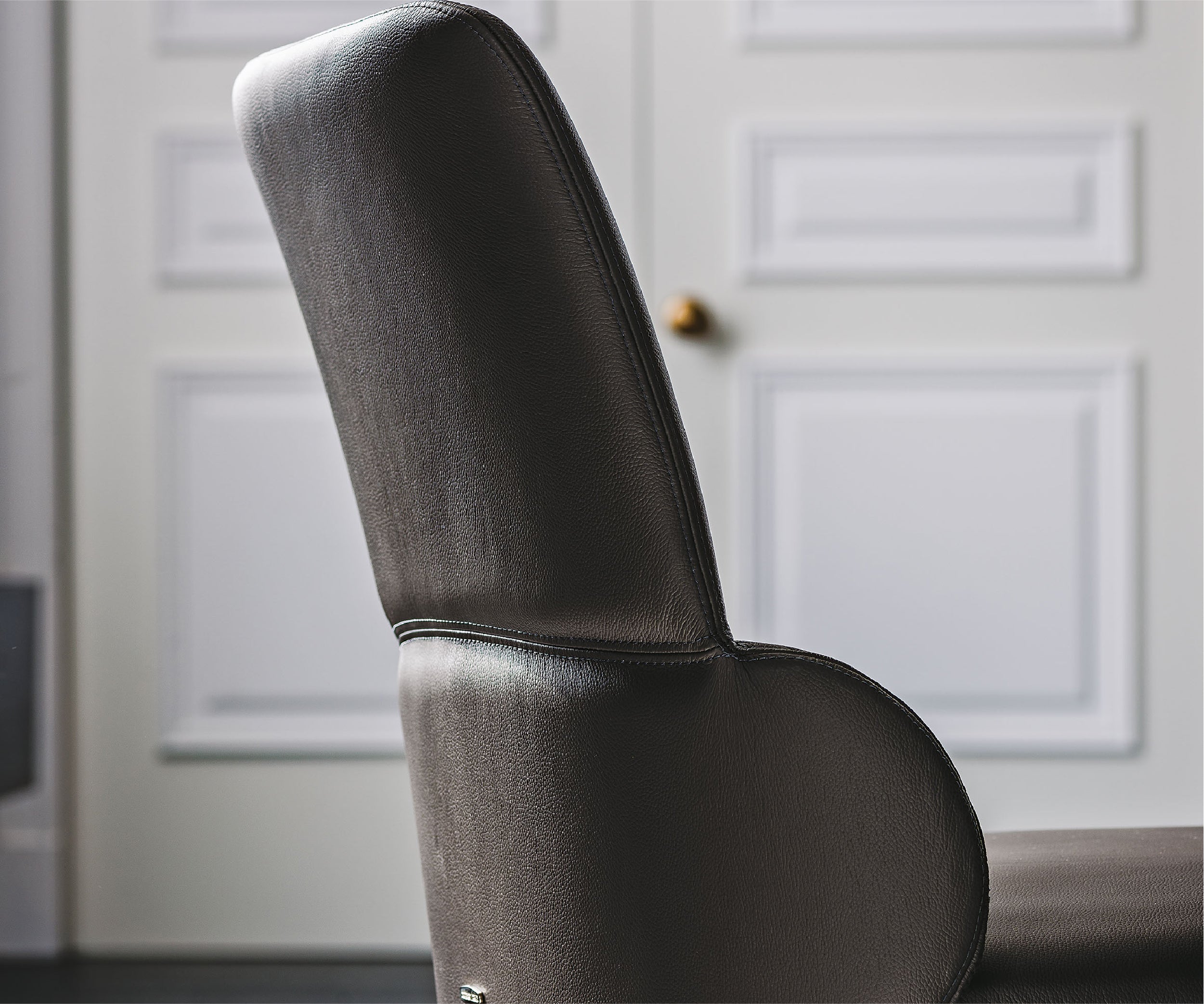 The modern kitchen chairs Ginger are the expression of a comfortable and enveloping design. With soft folds on the backrest and a rounded shell with two overlapping horizontal bands, Ginger is suitable as a designer chair for an elegant and comfortable dining table. Thanks to the metal structure, fully upholstered according to choice from a wide range of fine leathers and fabrics, it is light and easy to handle, suitable for contract interior design projects.