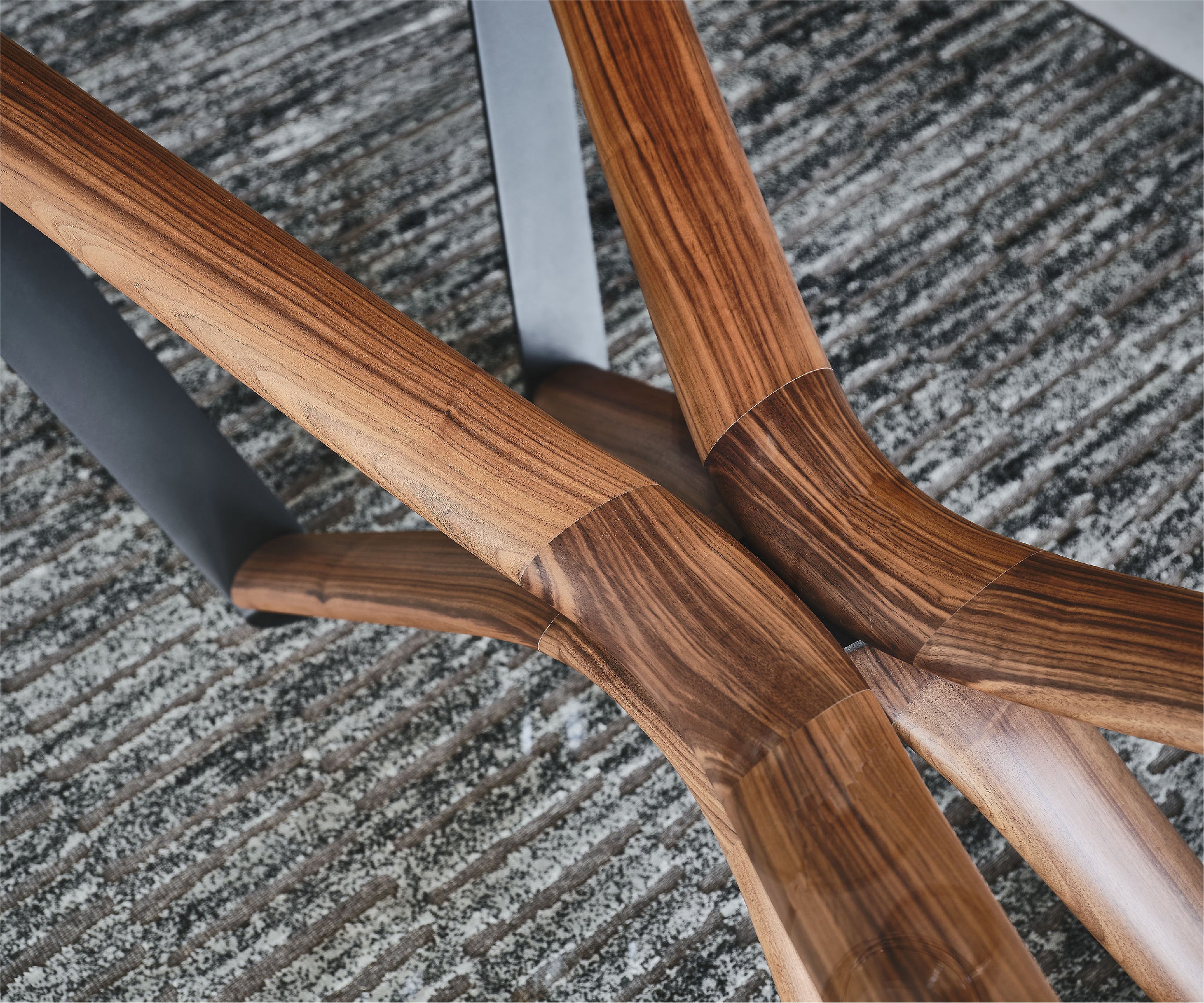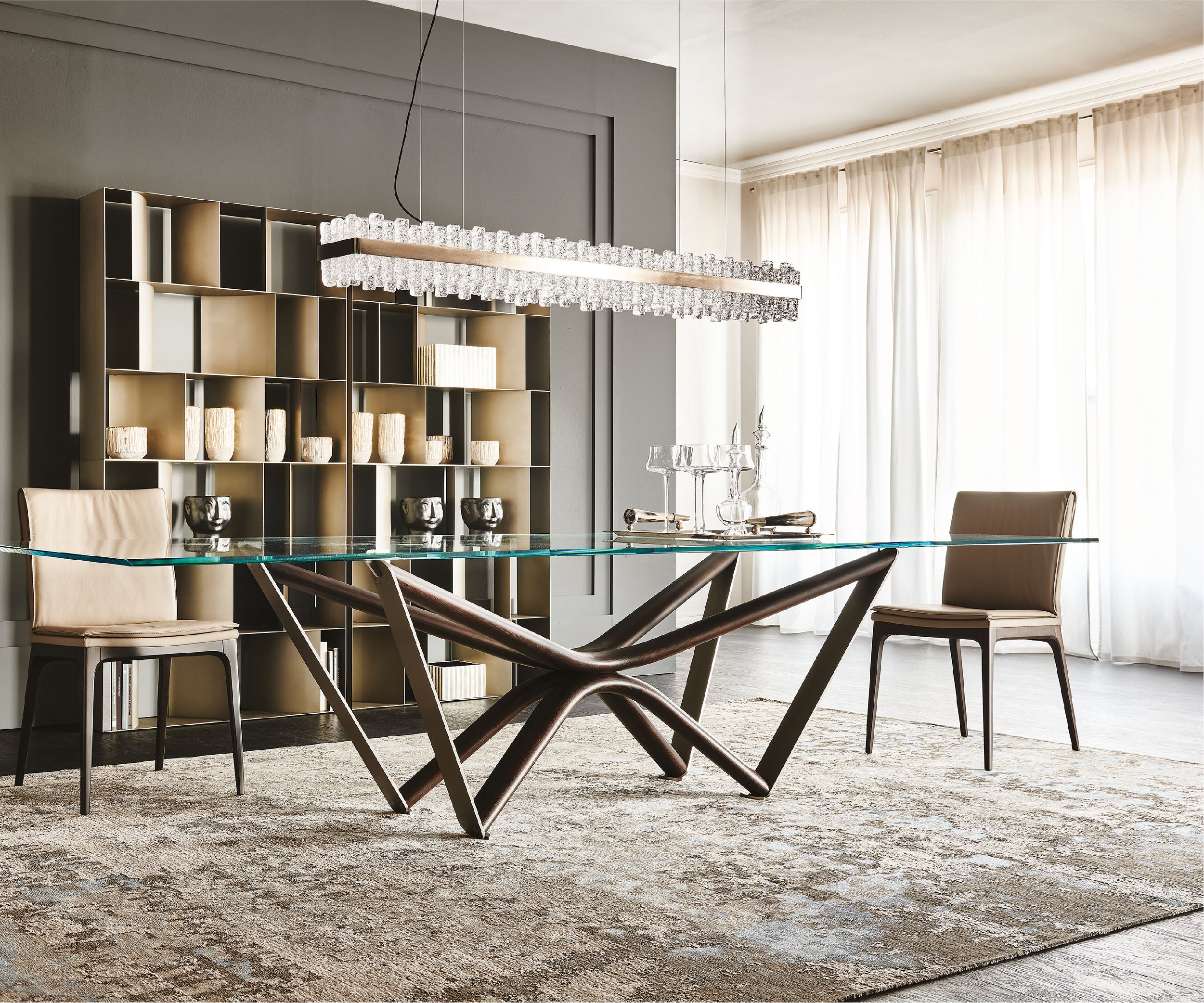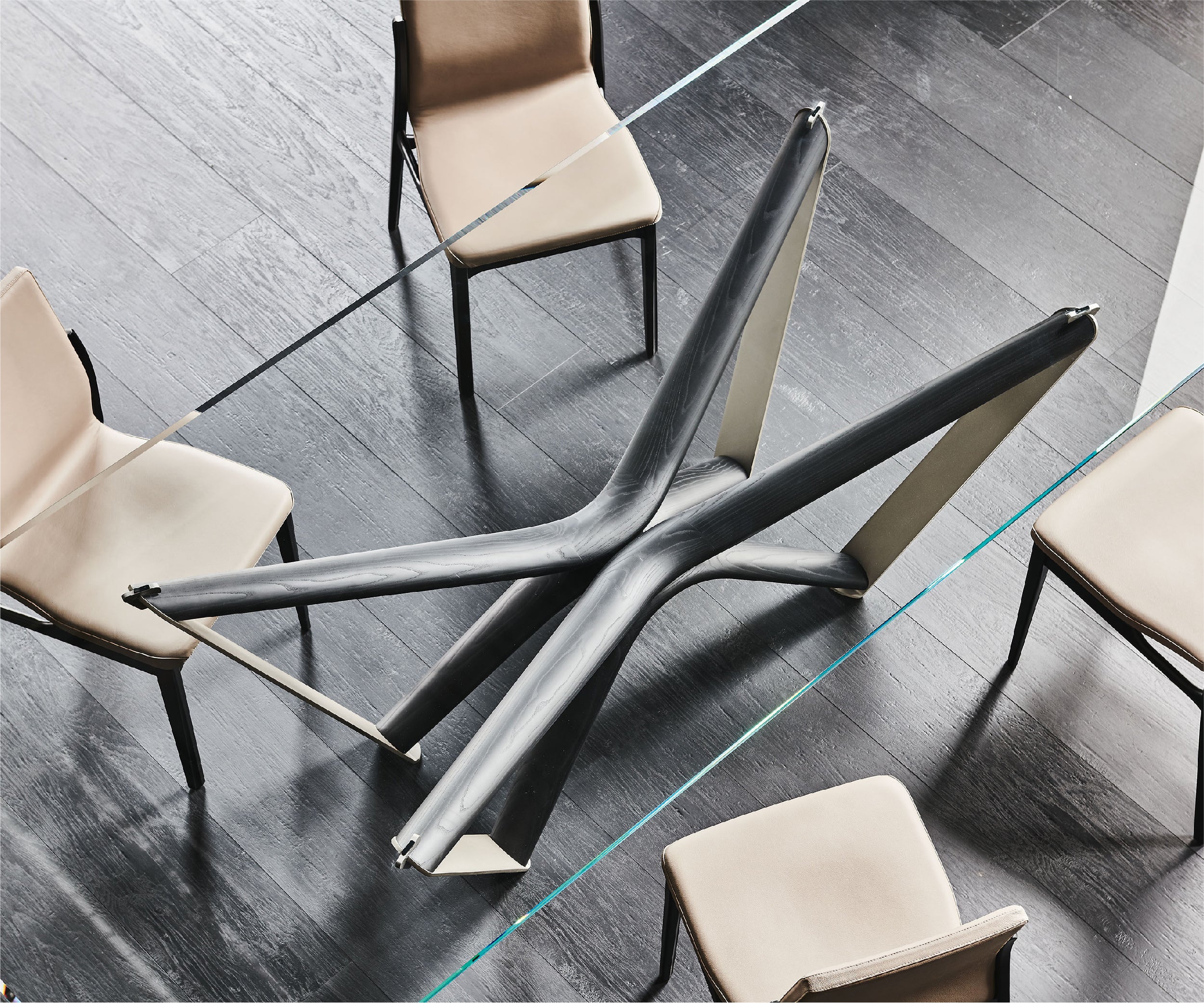 The Marathon table is a tribute to dynamism and flexibility. A glass table of pure architecture inspiration.The base of this glass dining table becomes the main protagonist of the modern dining room. The wooden legs are like flexible branches, creating sinuous and elegant curves that bend in the center. The structure is strengthened by four laquered steel supports, which enhance the wood natural veins by contrast. The extra-clear transparent glass top allows to appreciate the refined details of this modern table, from all points of view.