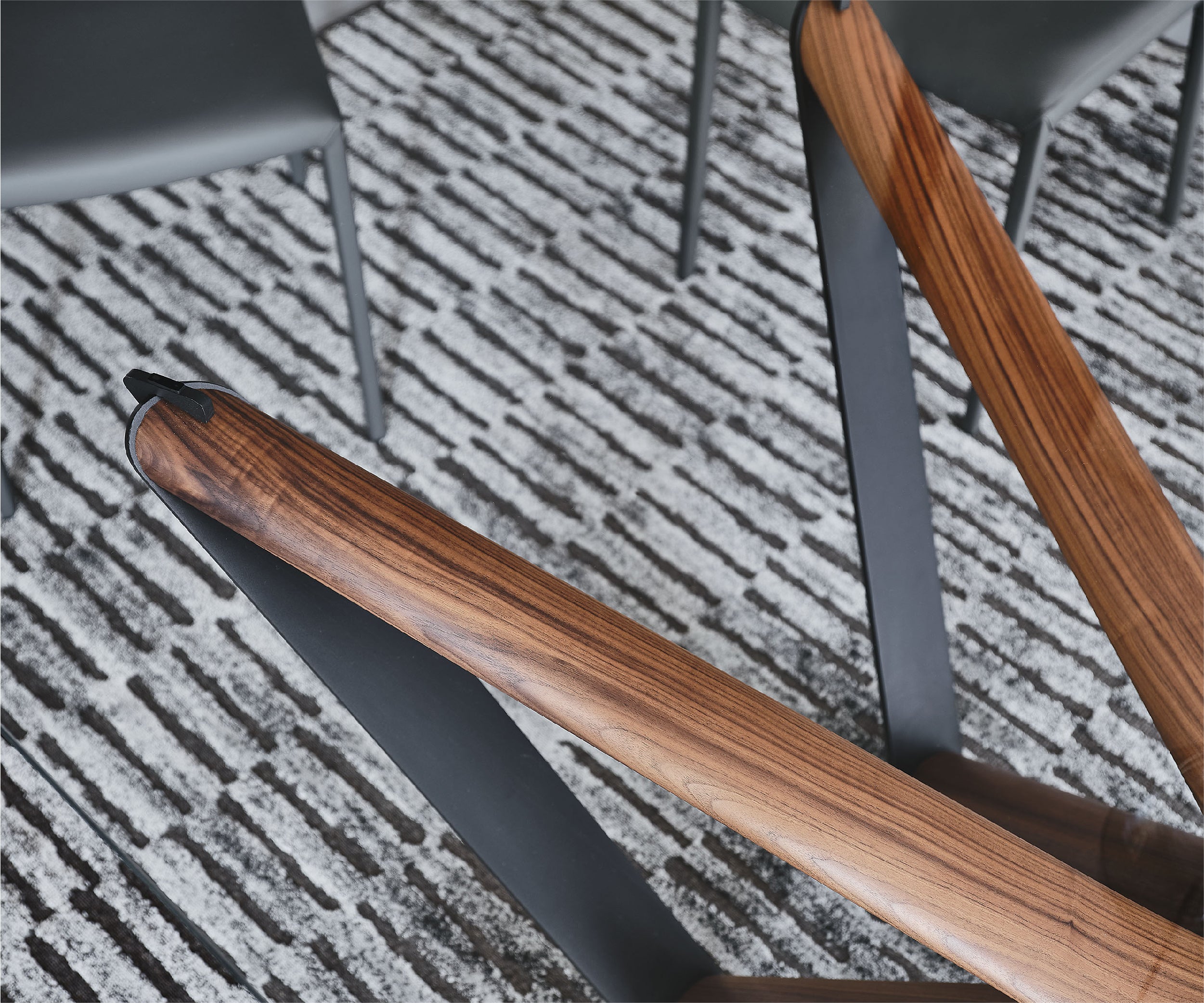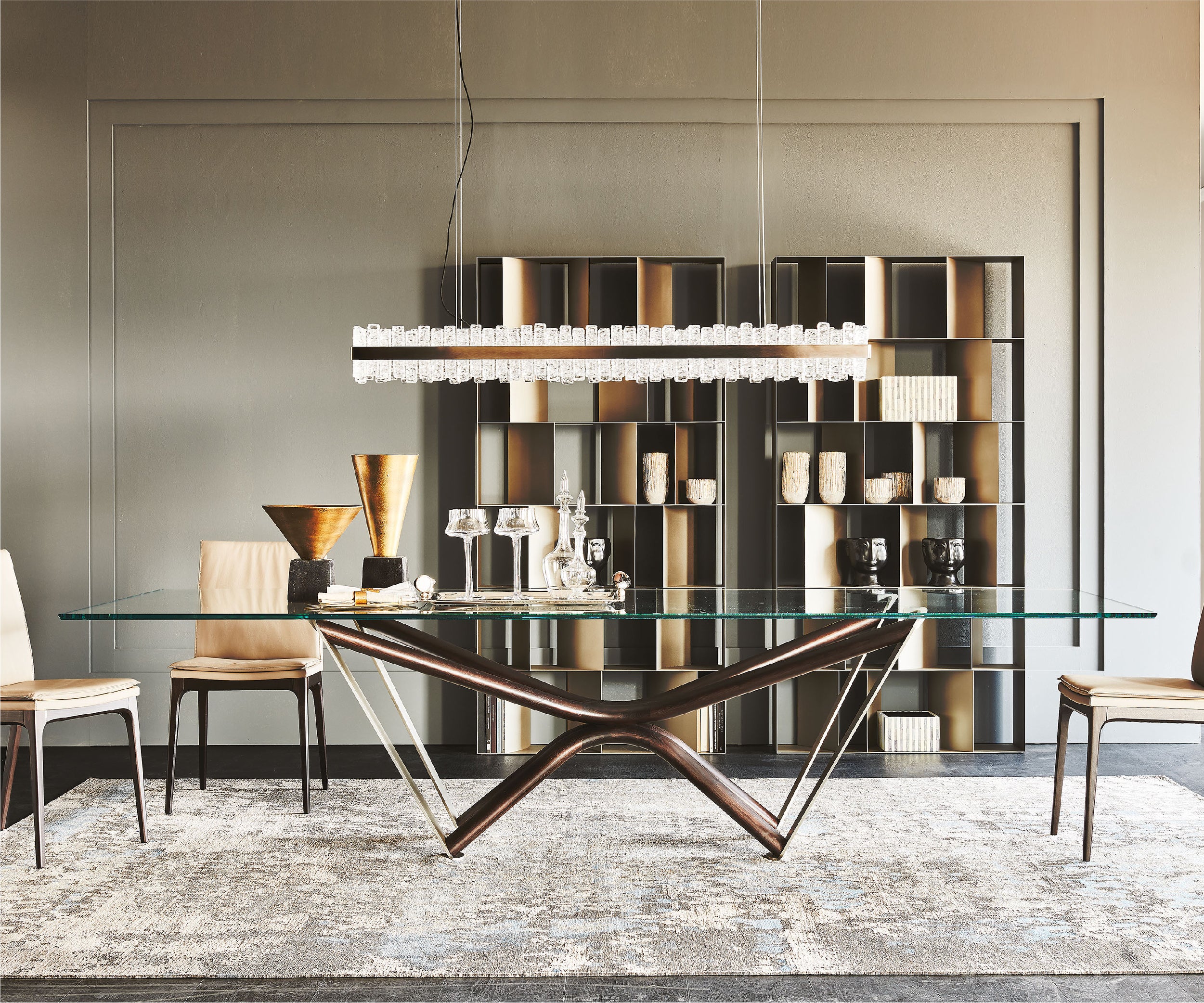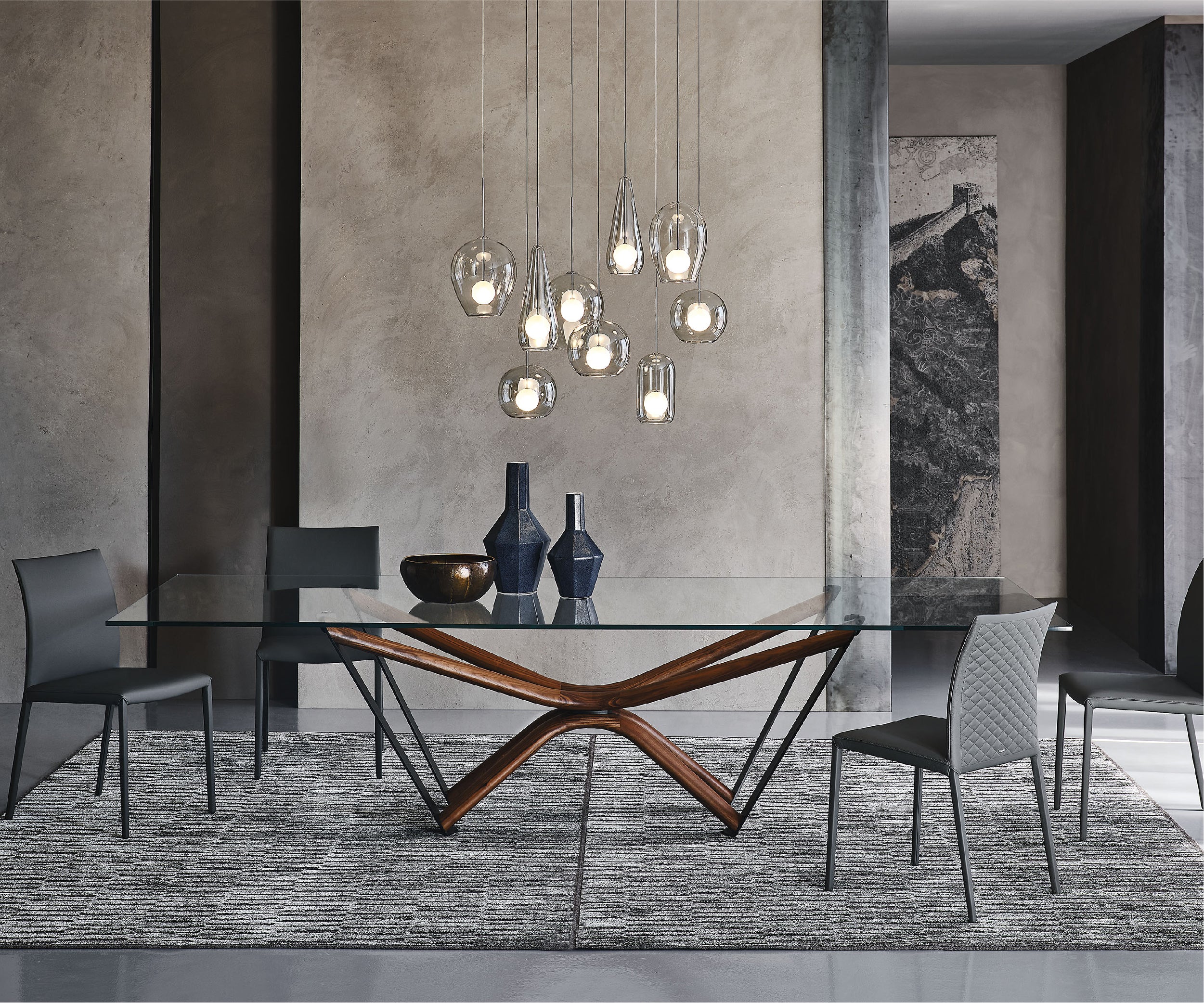 The Marathon table is a tribute to dynamism and flexibility. A glass table of pure architecture inspiration.The base of this glass dining table becomes the main protagonist of the modern dining room. The wooden legs are like flexible branches, creating sinuous and elegant curves that bend in the center. The structure is strengthened by four laquered steel supports, which enhance the wood natural veins by contrast. The extra-clear transparent glass top allows to appreciate the refined details of this modern table, from all points of view.