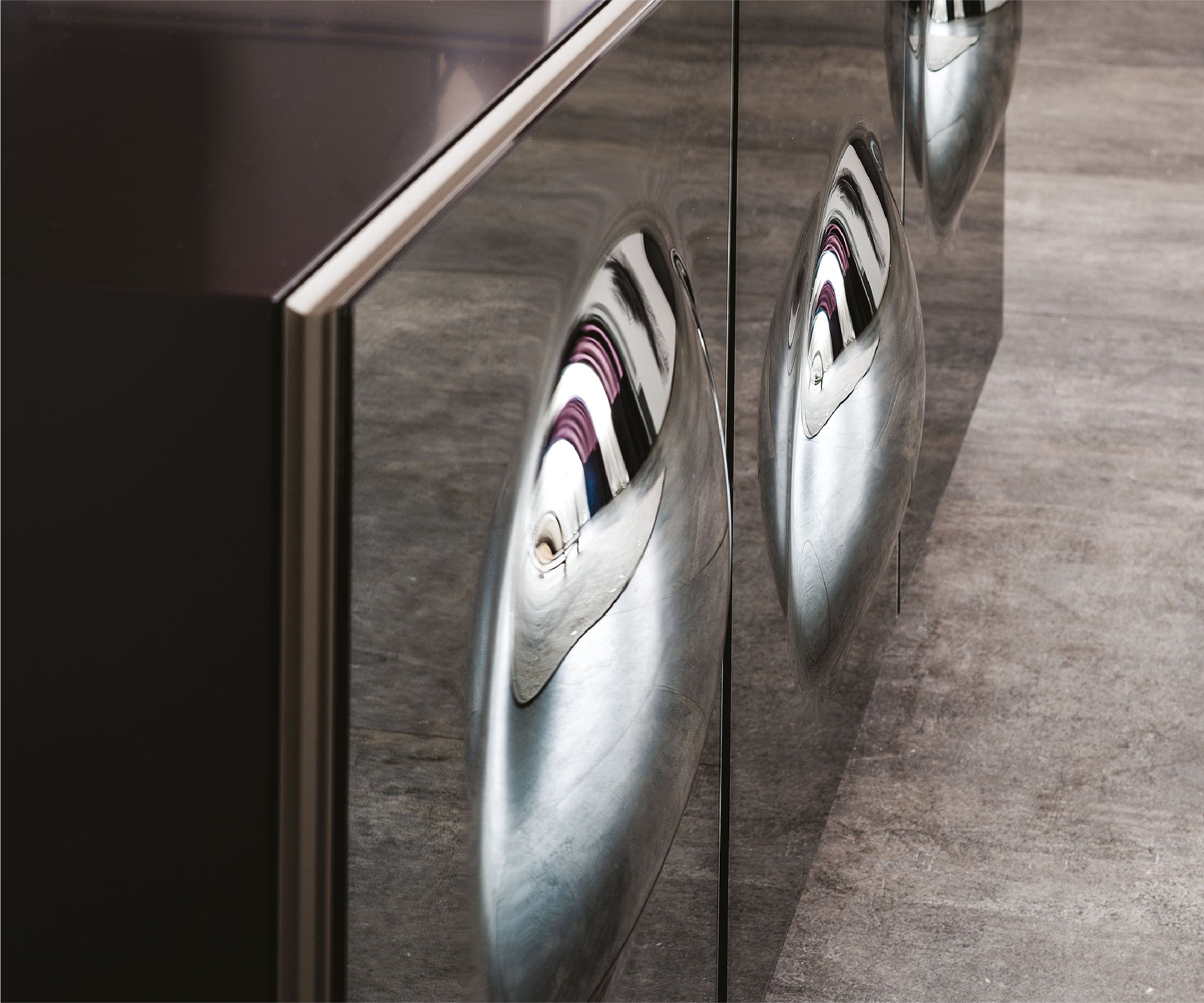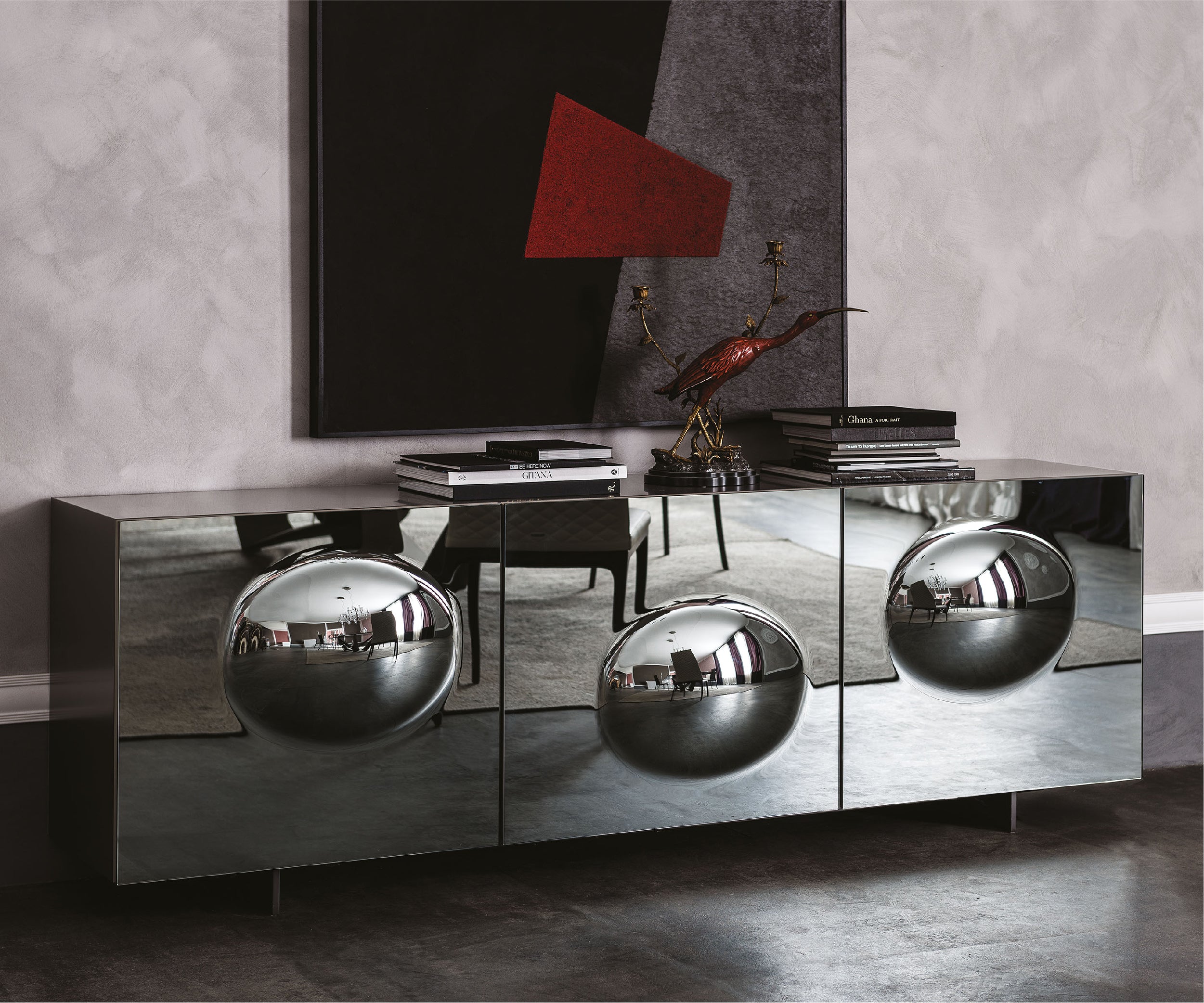 Paramount has an irreverent yet refined design, conceived by Andrea Lucatello. The doors shape gives volume and rhythm to the structure. They are made of convex mirrored glass, thanks to skillful manufacturing techniques. Paramount is a modern sideboard that can be covered in multiple finishes, matt or glossy; the latter reflecting the surrounding environment with a surreal mirrored effect. The precious materials, which make up the internal and external shelves and the base, underline that this contemporary glass sideboard is the putput of the high quality Italian manufacturing.