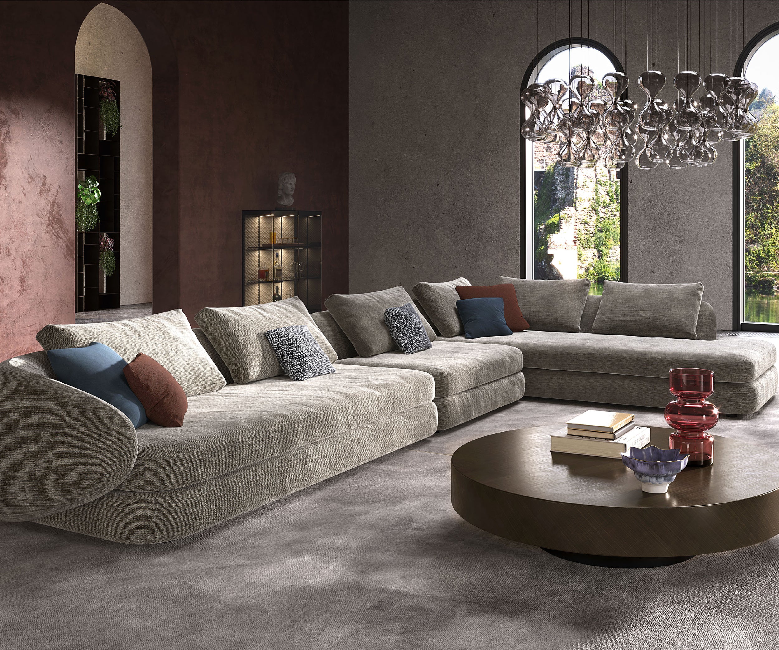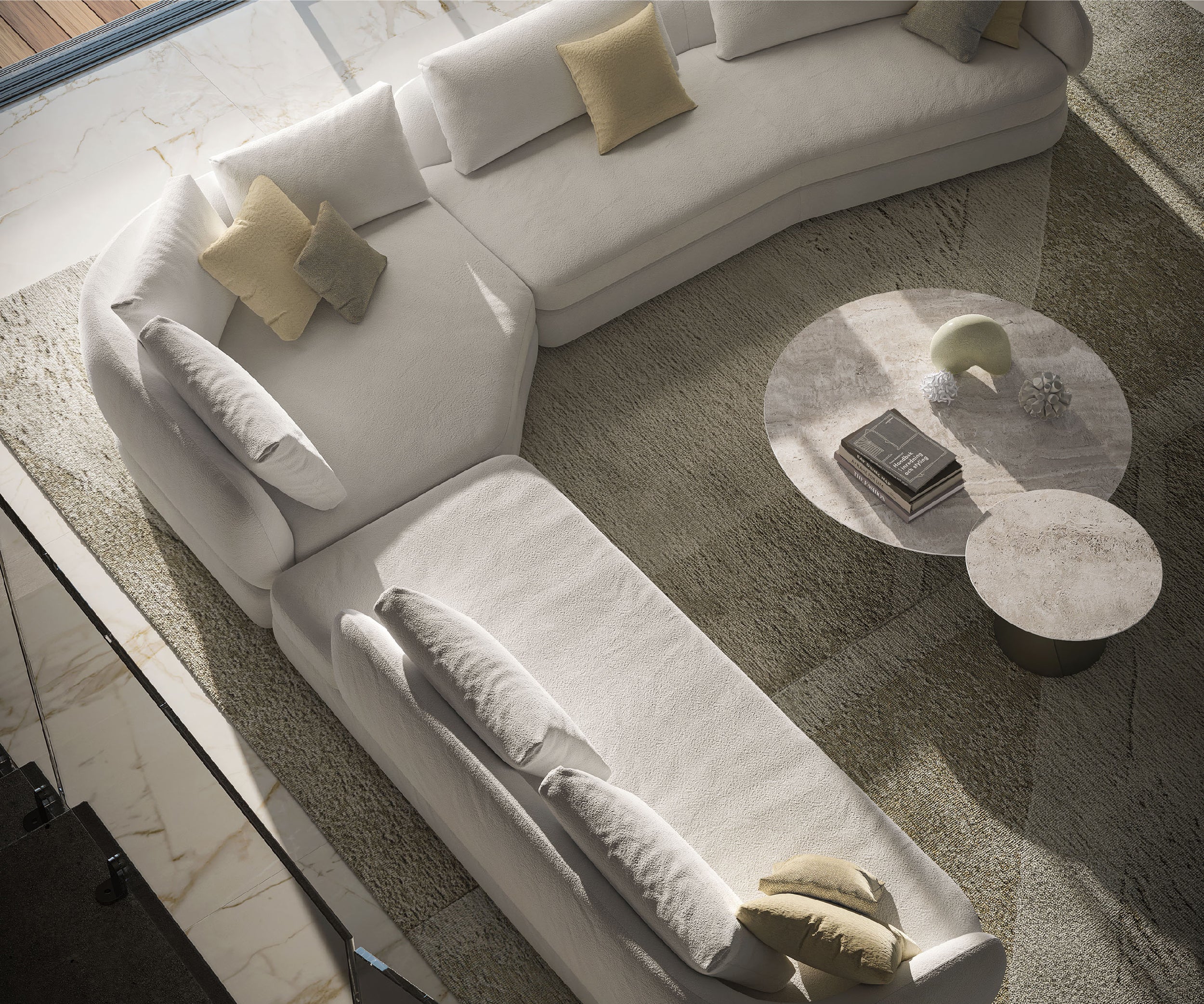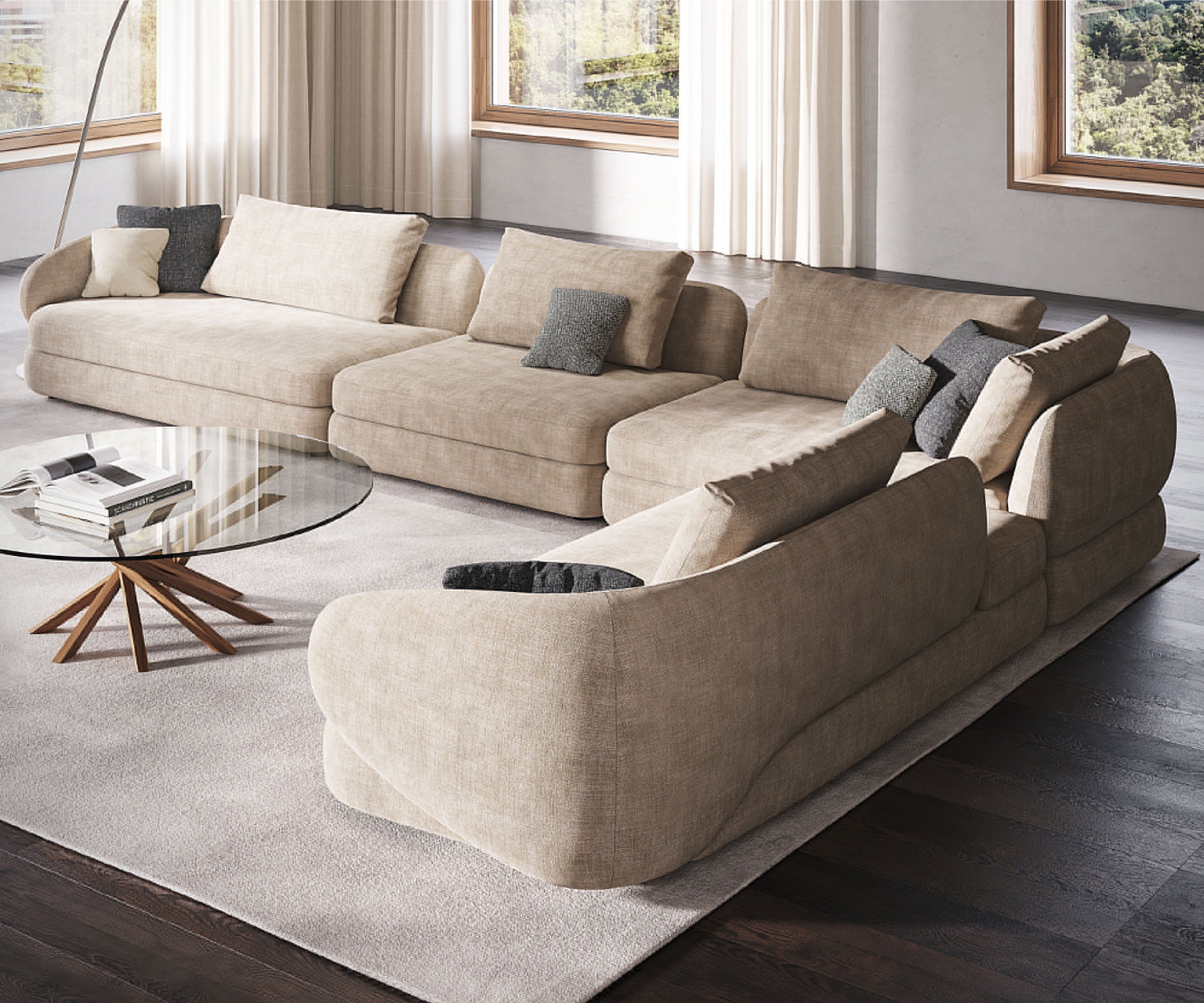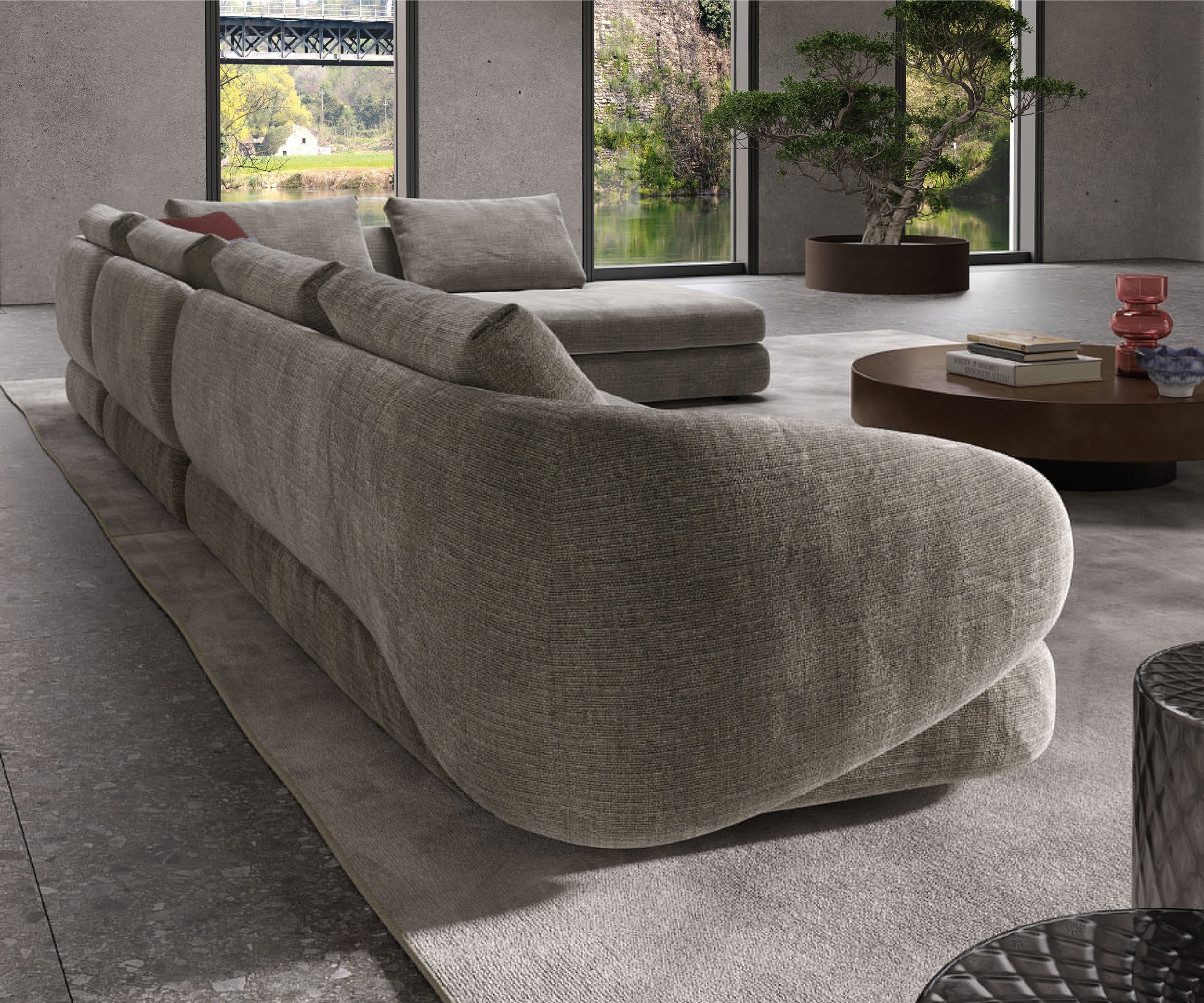 Drawing inspiration from harmonious shapes of nature, the backrest envelops soft, fully removable cushions; the unique all-round appearance allows for the creation of a tranquil and relaxed atmosphere in your open space. The armrest, the absolute protagonist of the composition, gives the impression of surrounding you in a warm embrace, making you feel that you are in an intimate and cosy place. The Craig is also a modular and versatile sofa that will adapt to your space: choose linear configurations for one-to-one conversations, create a cosy corner configuration or add a chaise longue in the round and square versions.
