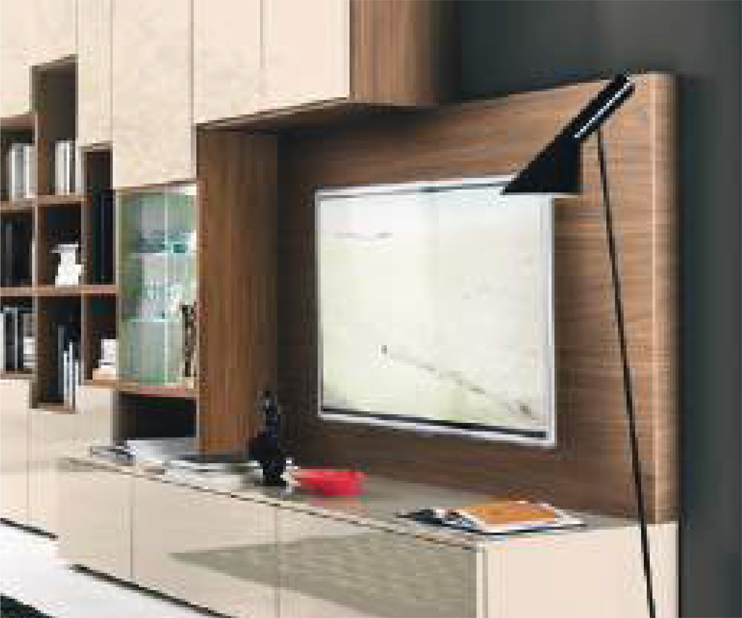 structure with side panels and shelves 30 mm thick, TV panel with folding system and back panels in walnut veneer — modular front panels, end module and LAMPO floor storage units in glossy hemp lacquer finish — GHOST spacer with 610 mm height in transparent glass with vertical LED lights recessed in the thickness of the corresponding side panels
