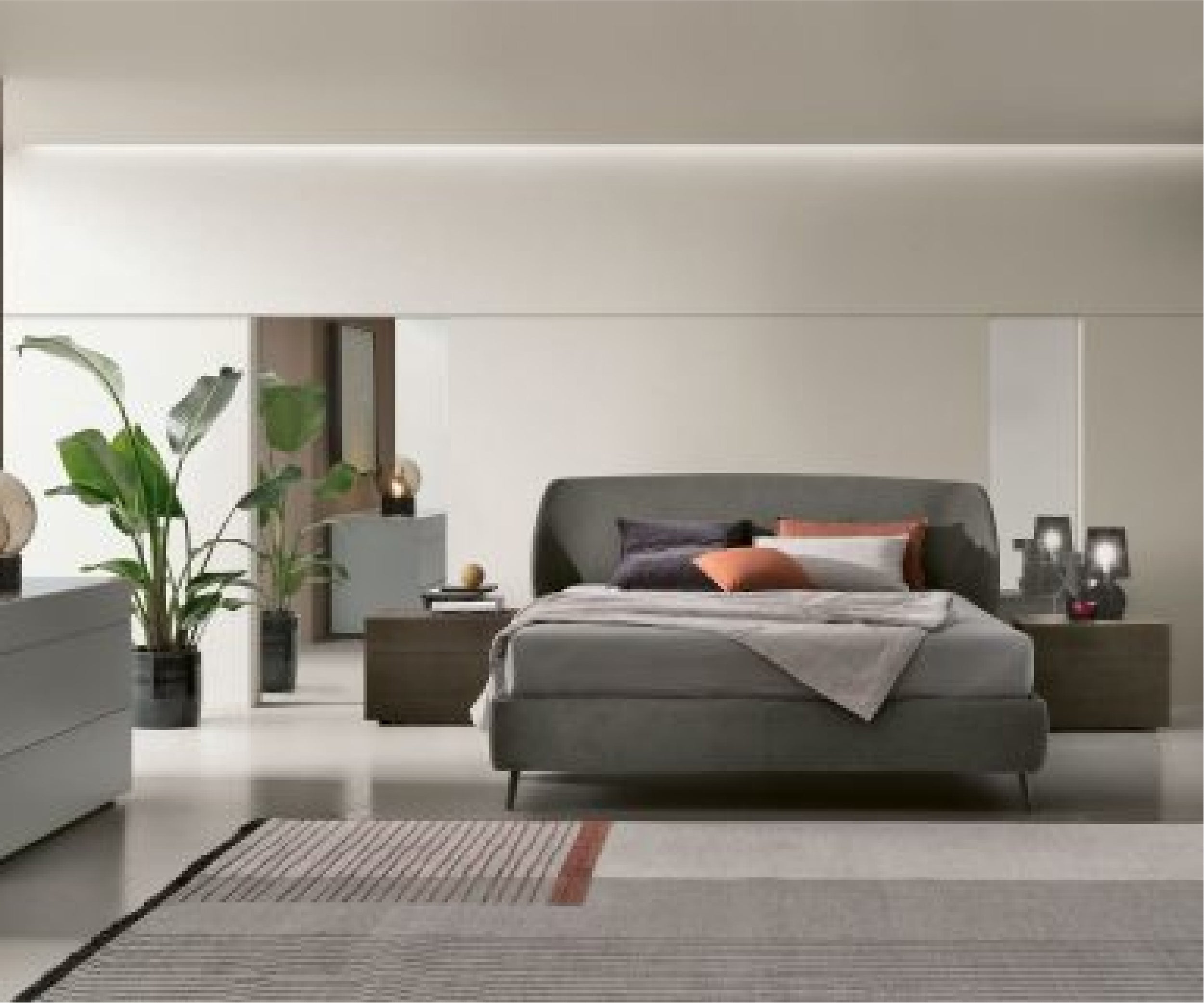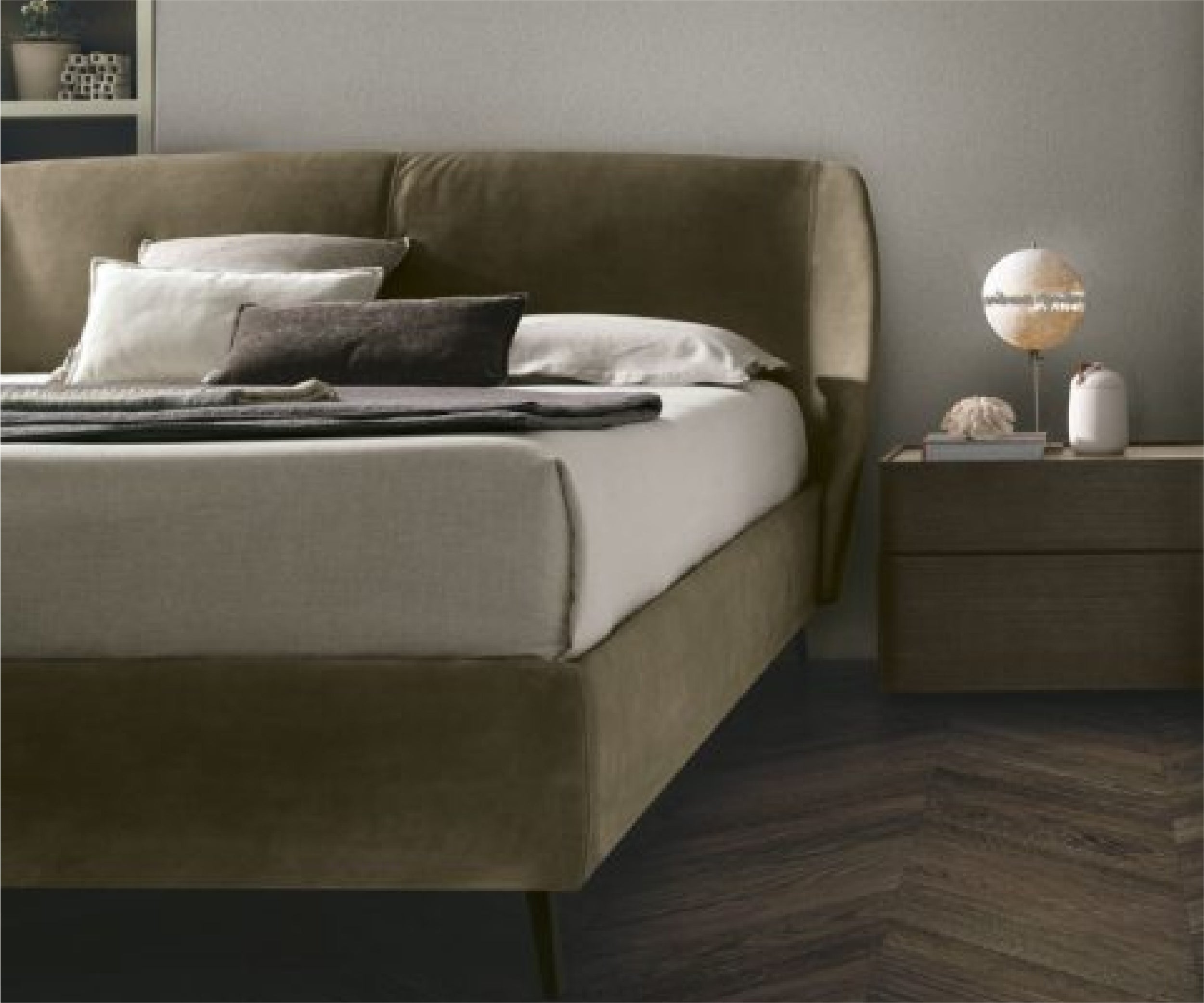 The headboard extends beyond the bed frame and wraps itself around it: structural elements are united by their style and the furniture reveals its beauty from any angle.