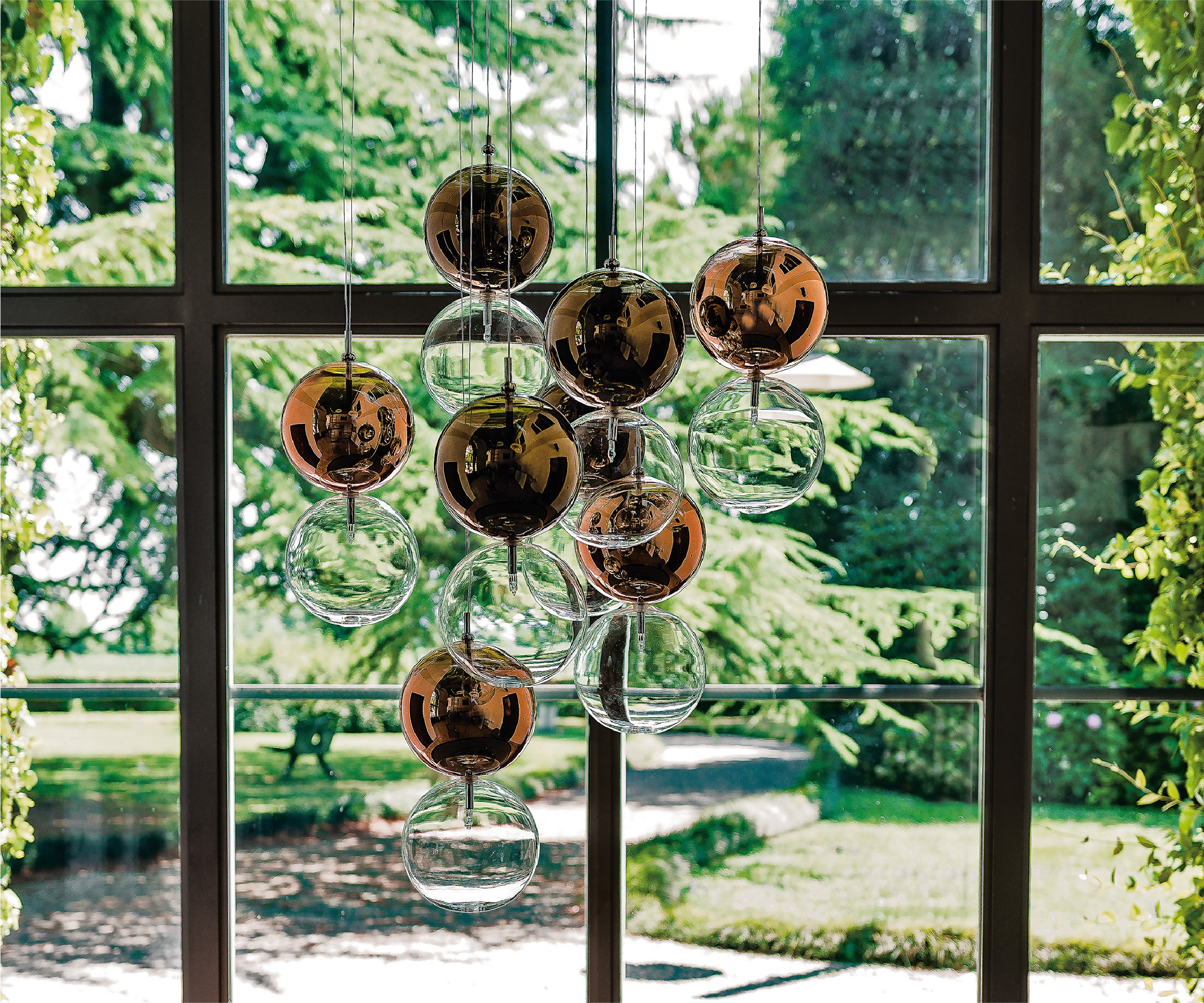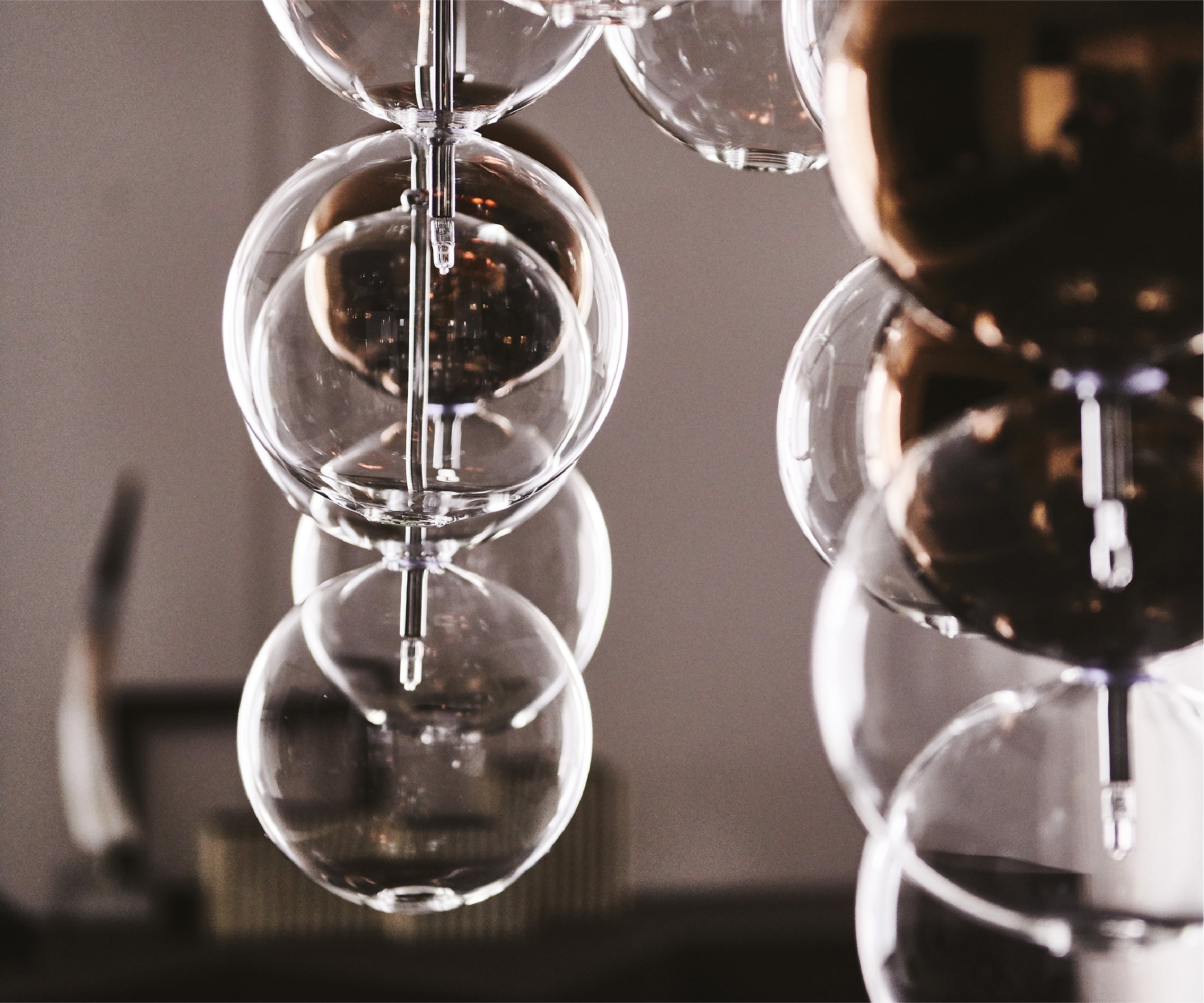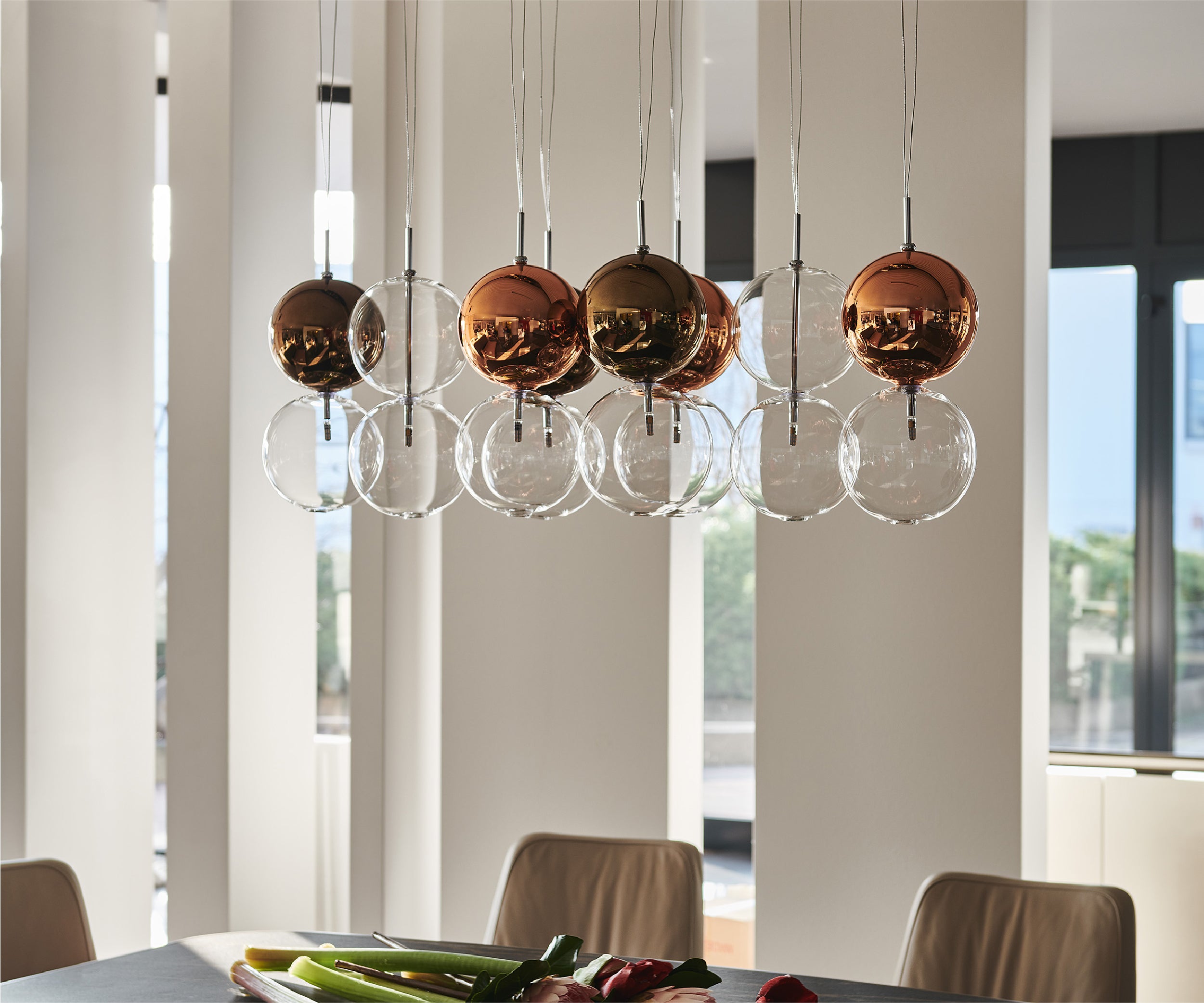 This dynamic composition of delicate globes suspended in mid-air will transform your living room into a unique place full of personality. The Apollo modern chandelier, conceived by the designer Oriano Favaretto, can have different configurations from 2 to 16 spheres, each of which is able to underline the shapes and volumes of the surrounding furnishings. The colour of the glass lampshades can also be customised in order to emphasise the room's tones. As a matter of fact, each pair of lampshades is composed of a transparent lower sphere and an upper one painted with warm and delicate nuances.This modern ceiling lamp illuminates a contemporary living room with uniqueness and inimitable elegance.