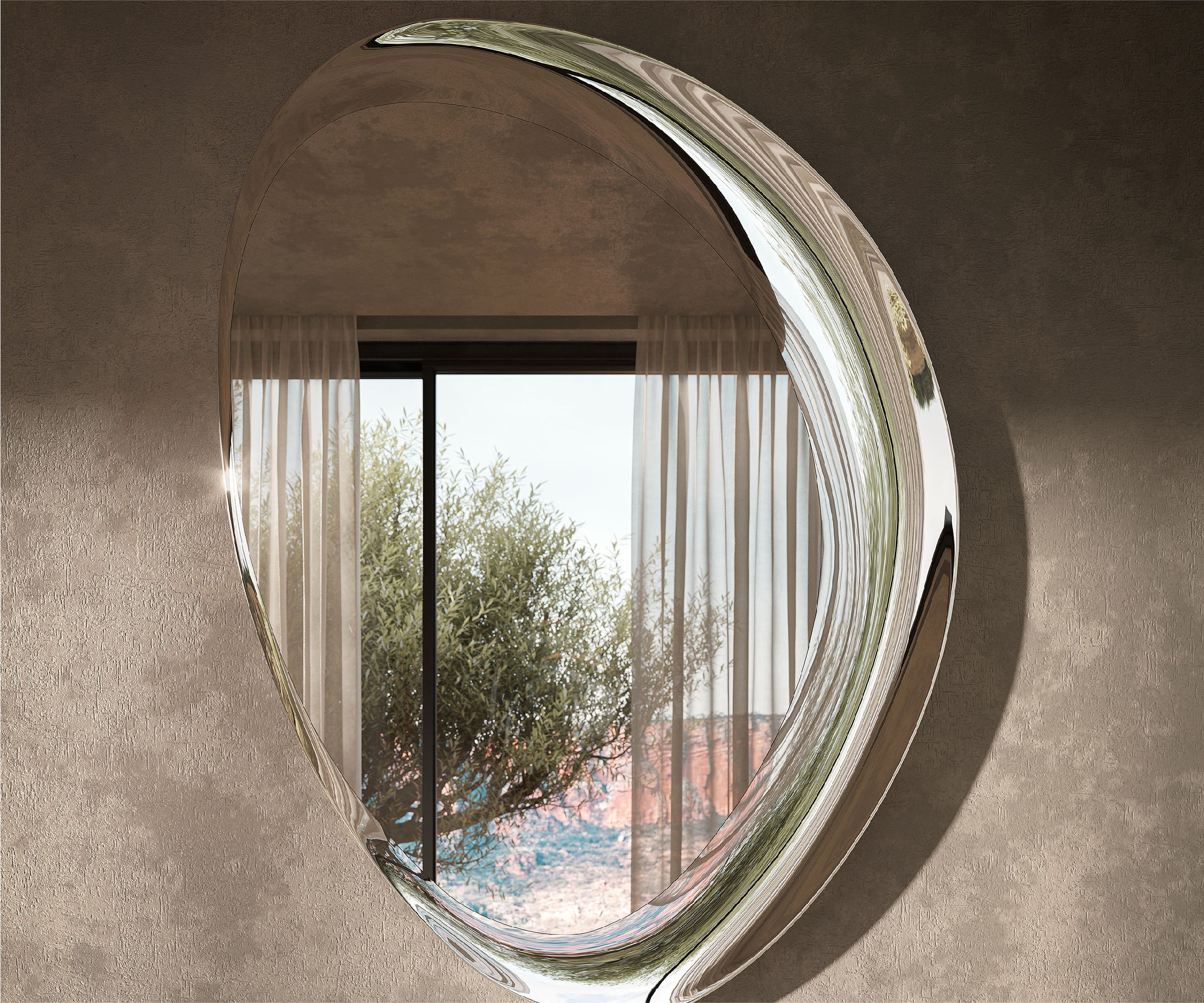The result is a modern mirror with a soft, flowing shape that seems to want to embrace the room with its gaze and engulf it.