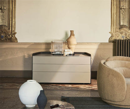 A reassuring design with gentle lines and wrap-around shapes. he C-shaped structure embraces and supports the elements of this casegoods collection: curved and upholstered, with a soft, sinuous silhouette, it can be covered in fabric or leather for a refined effect. The continuity of the surfaces and the absence of handles denote an exclusive design, distinguished by the discreet groove on the wooden side of the drawers so that they can be conveniently gripped at the side. The collection also includes the Chloé Vanity: versatile and refined, it can be used as an elegant desk or an exclusive dressing table with mirror.