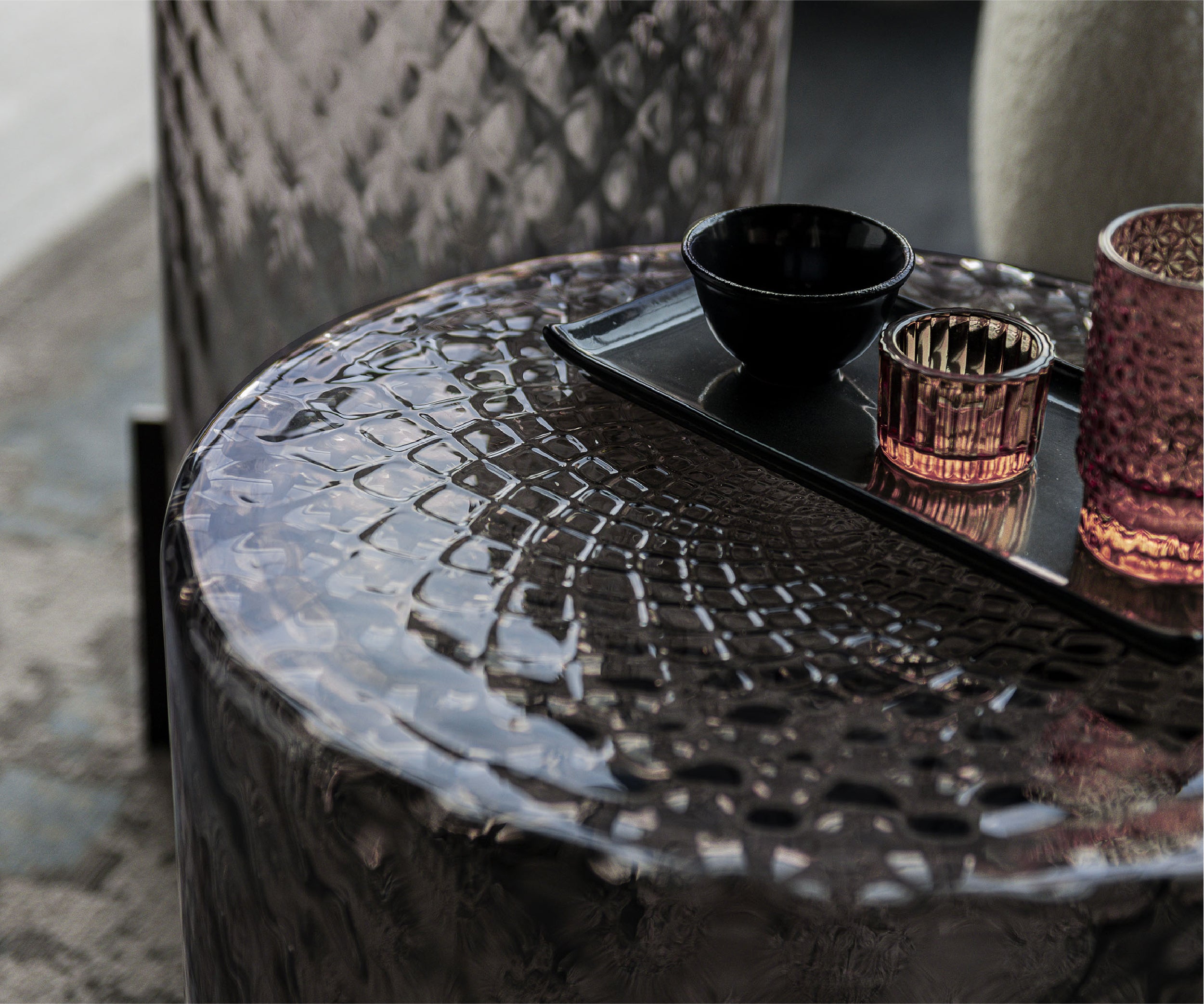The body of the Dodo glass coffee table features a three-dimensional pattern of criss-crossing rhombi, obtained from a metal mould. As a result of blowing, the tips inside the mould shape the molten glass and produce the characteristic facetted effect of the balloton process. In the upper part, a mandala pattern is created, slightly off-centre at the point where the mould's rhombi join, creating a pattern that resembles flower petals or the perfect patterns of Buddhist tradition with which nature expresses its magnificence.