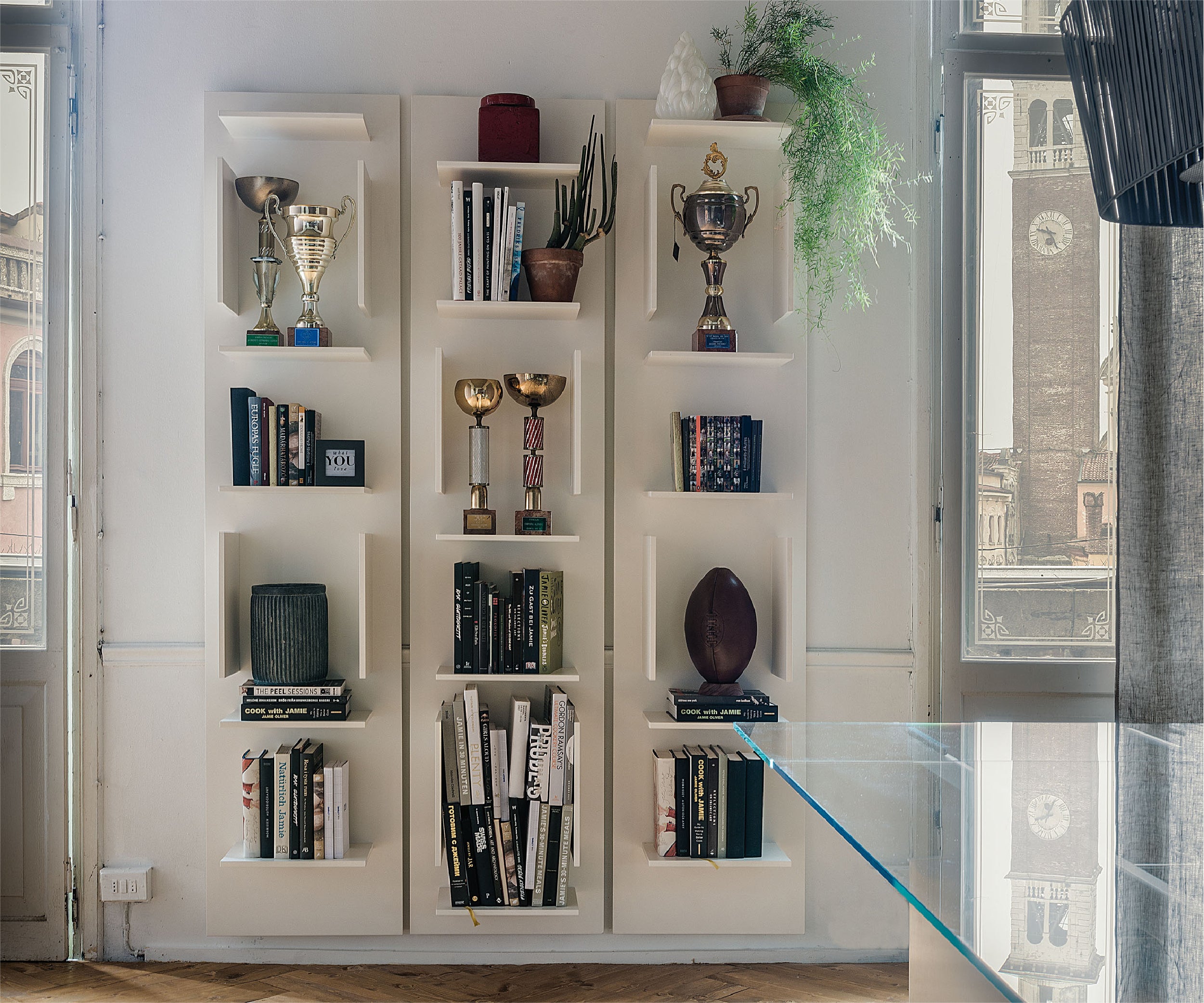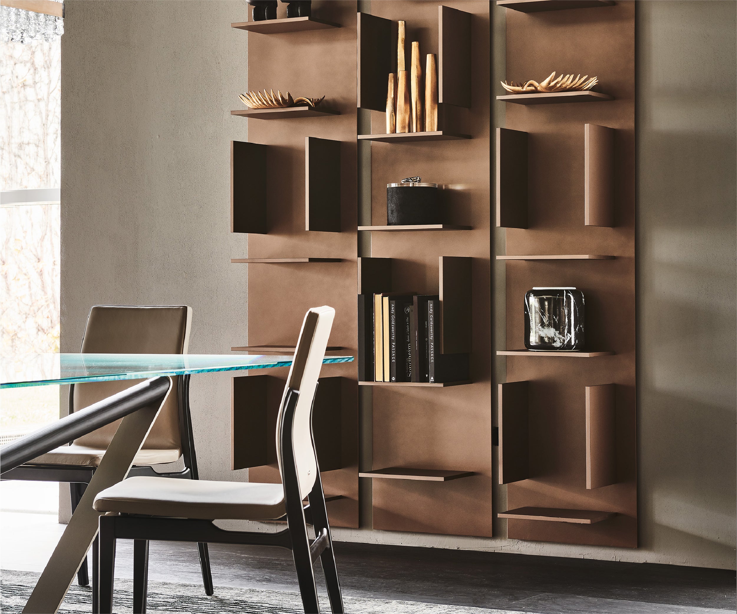 Fifty is composed of a single vertical wall-hanging element, which looks at its best when two or more modules are placed side by side and rotated by 180°. The regular rhythm of this composition is marked by its rectangular compartments, which highlight the books and objects showcased on the shelves of this design bookcase, representing one's passions and interests.