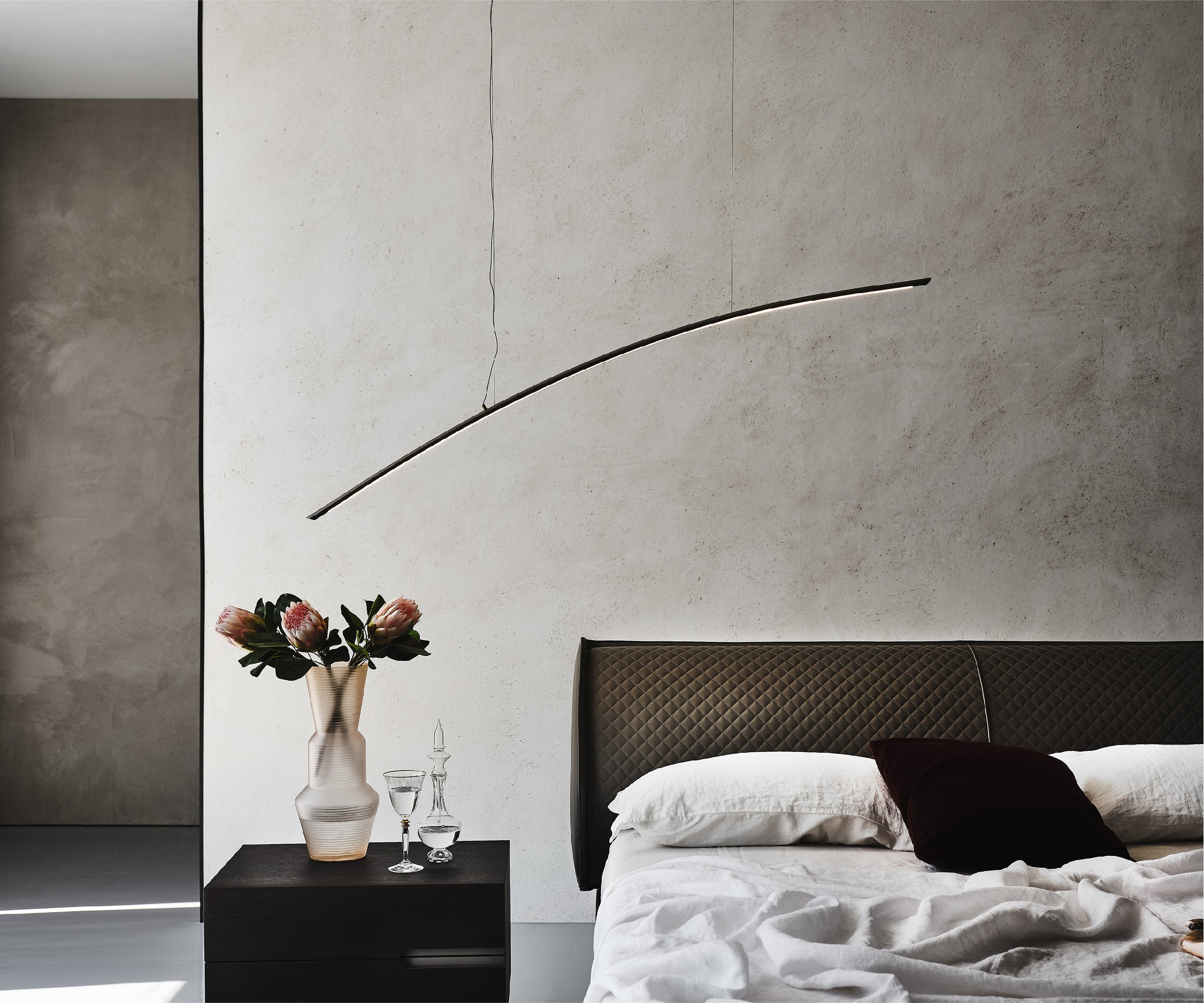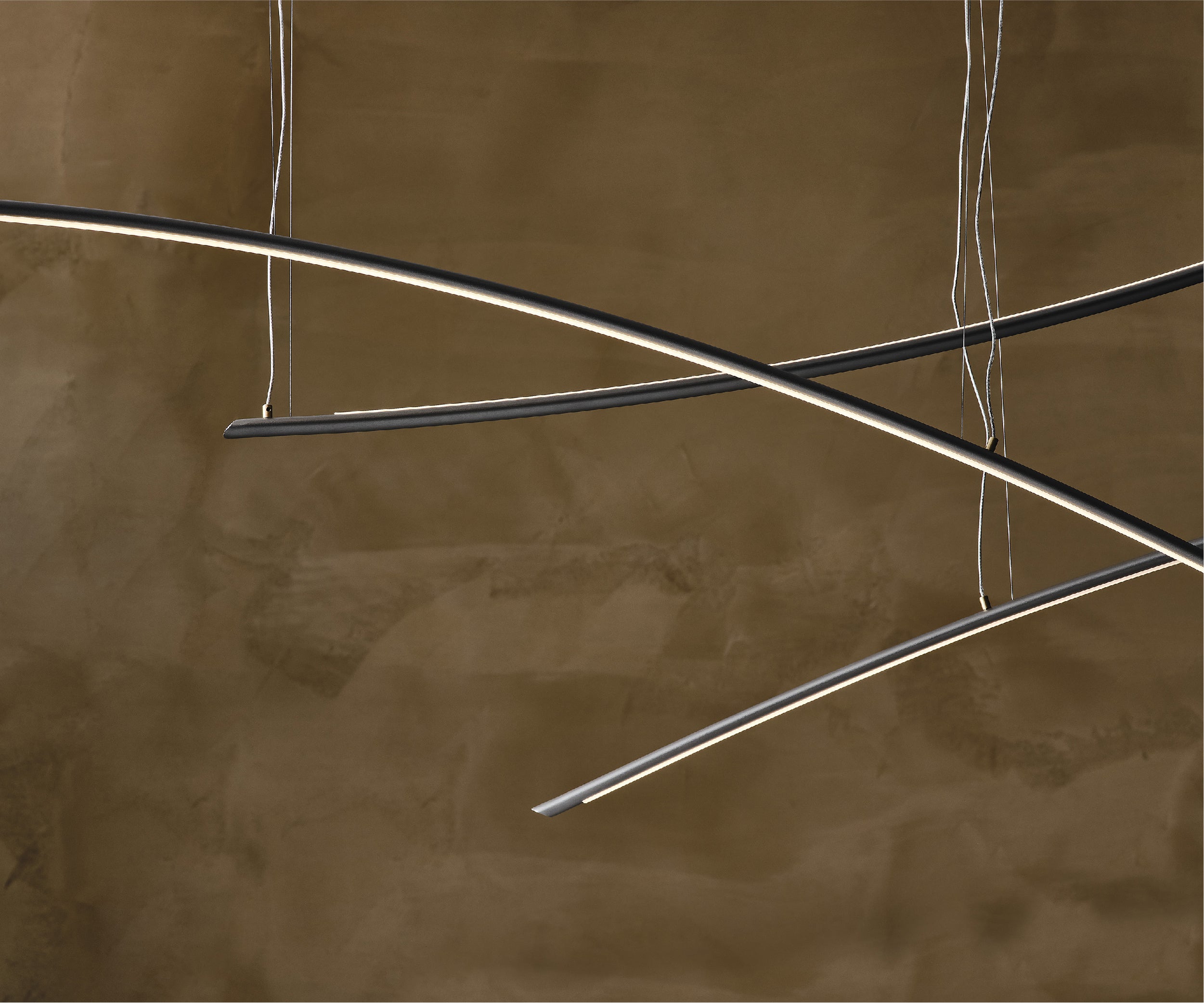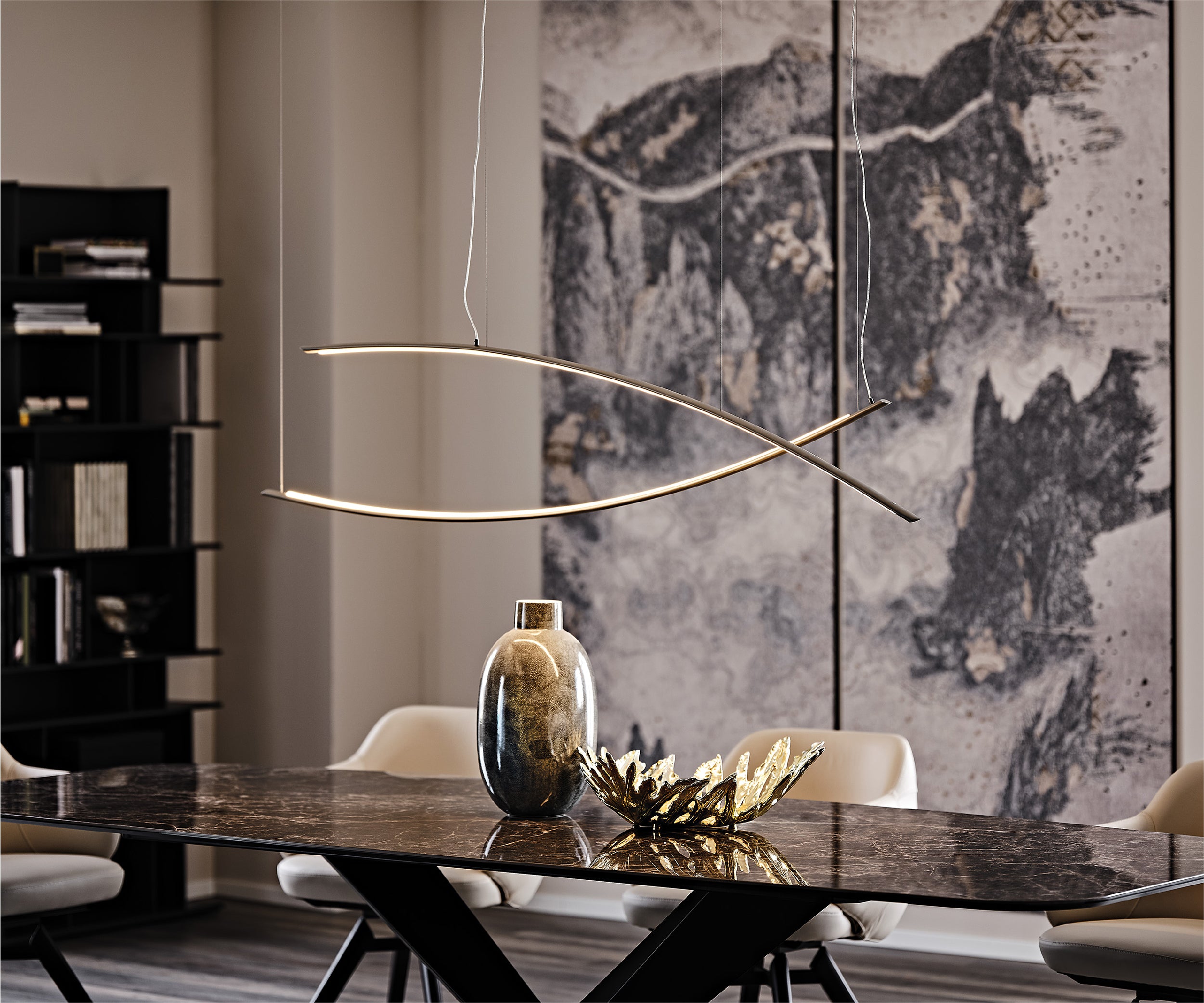 It is produced in 2 versions: Katana and Katana Magnum.The second is equally long but larger, as the name suggests. Both variants are divided into UP and DOWN versions, depending on the direction in which the arc is facing. What makes this modern lamp highly customisable is the opportunity to create arrangements by combining all available versions into one striking and ultra-contemporary chandelier.