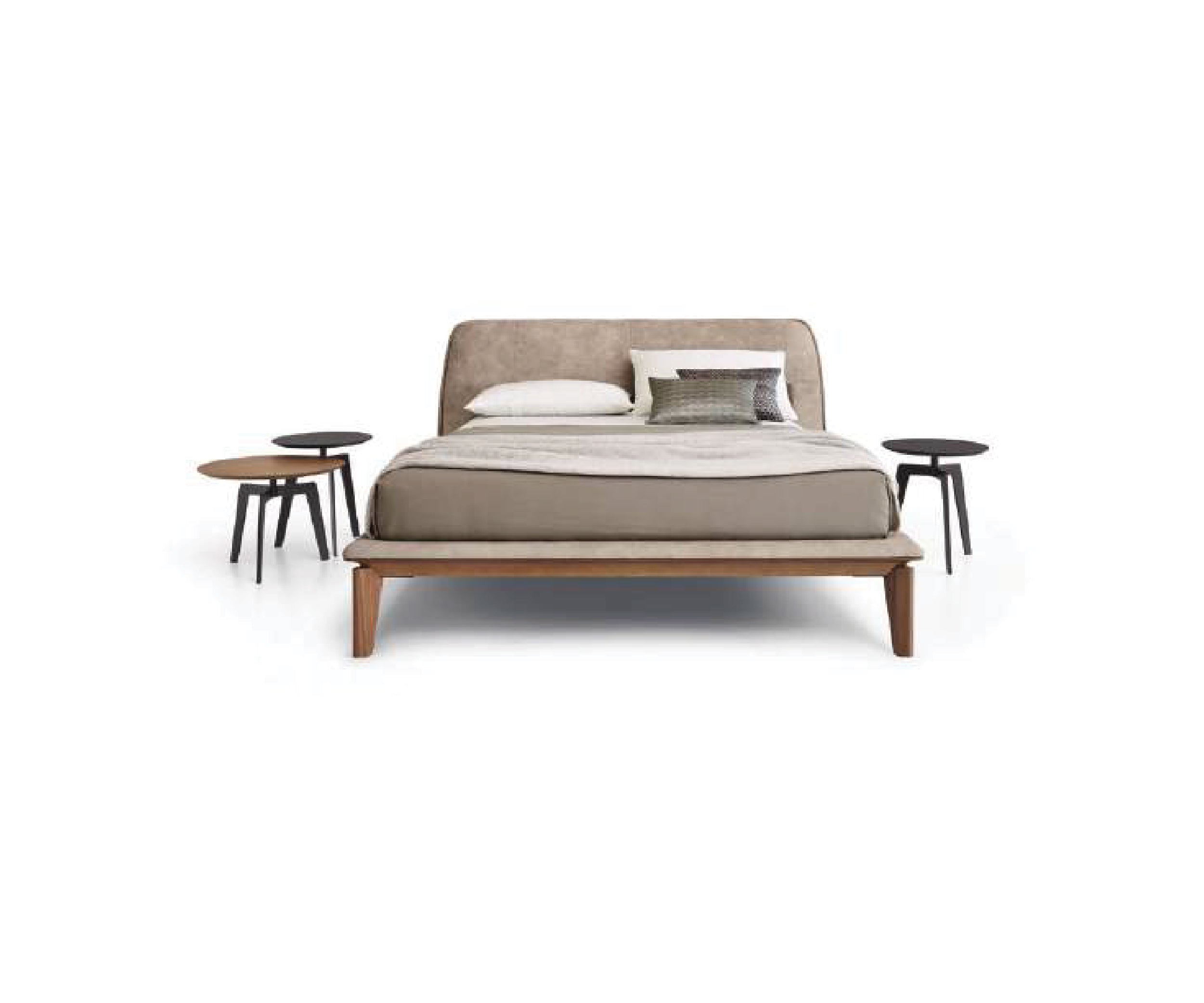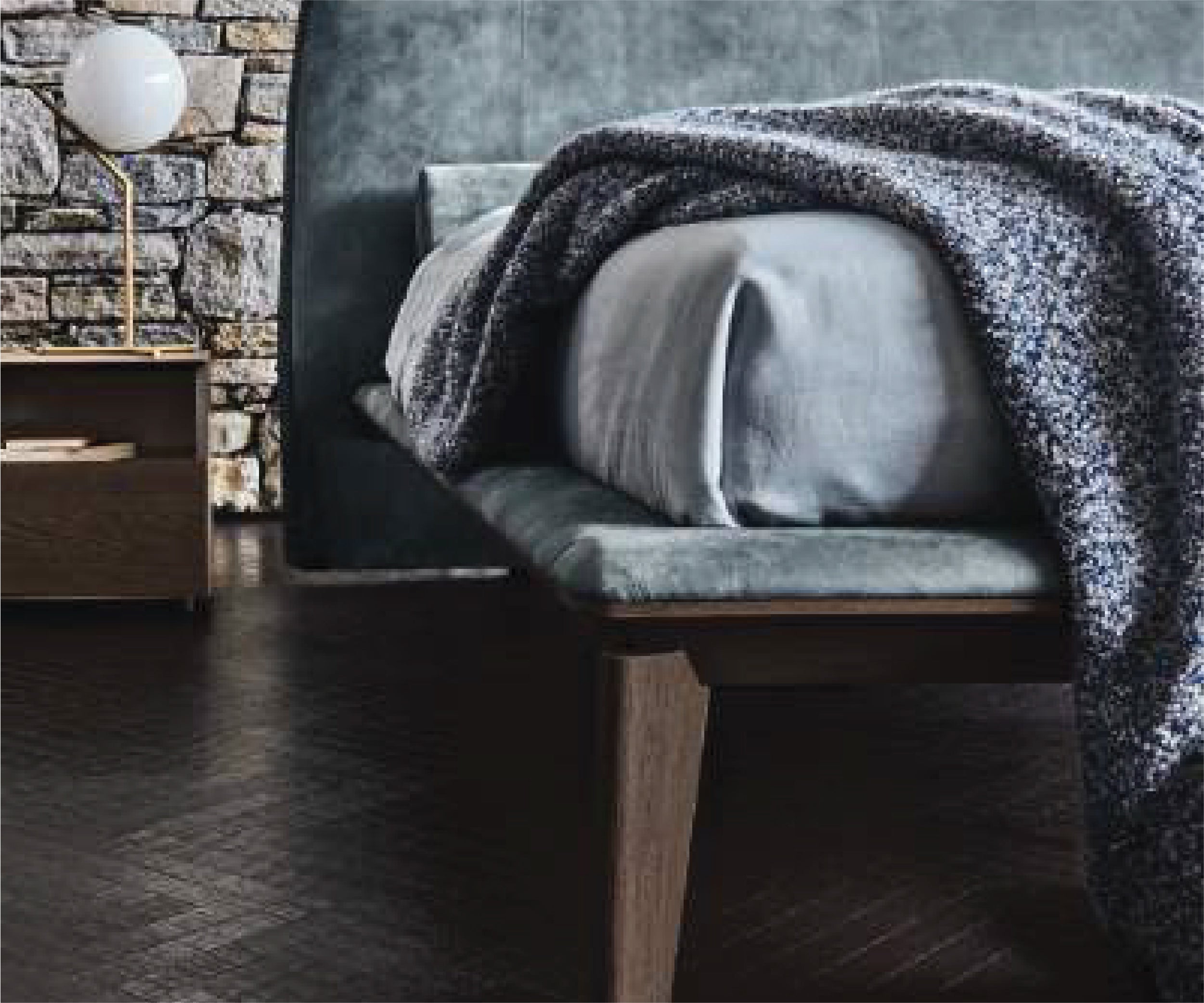 A well-balanced combination of different finishes distinguishes this solid, beautifully crafted wood bed that appears light and airy, with pleasantly cosy upper part in shaped polyurethane foam. Removable fabric, eco leather or leather upholstery for the headboard, not removable bed frame. The shaped legs are in solid wood or metal foils that come together to create an attractive void. The elegant headboard, with its sartorial edging, is designed to give its best in the centre of a room.