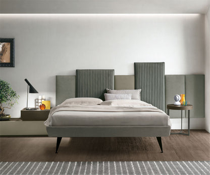 A system inspired by the skylines and views of metropolitan cities. Panels in different heights and finishes make up the headboard and create a high-impact, up-and-down decorative motif on the wall that enhances the whole room.