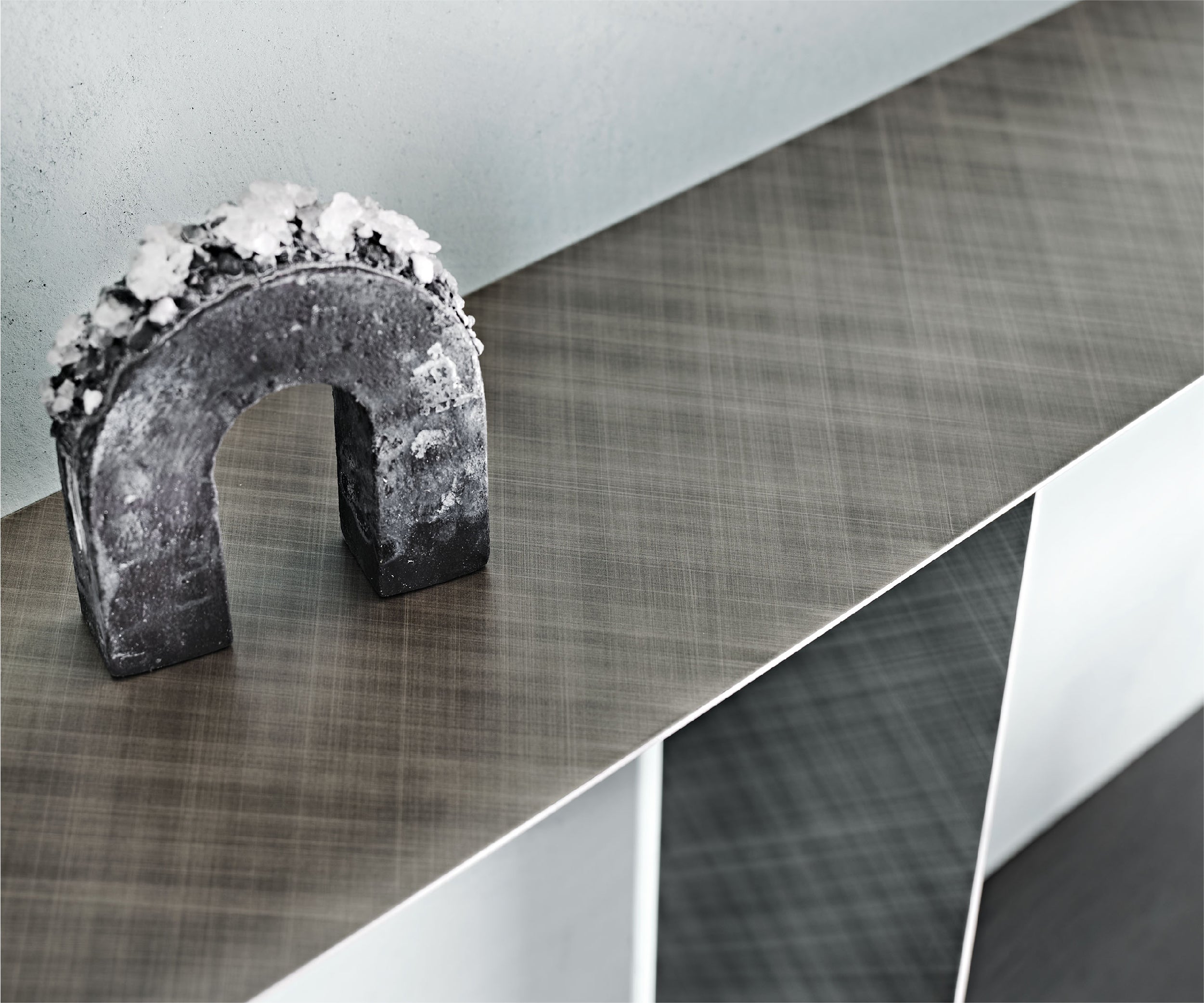 Both the base and top are finished with the sophisticated Brushed finish, consisting of a special freehand brushing technique. Light scratches, imperceptible to the touch, create a warp and weft metallic decoration.