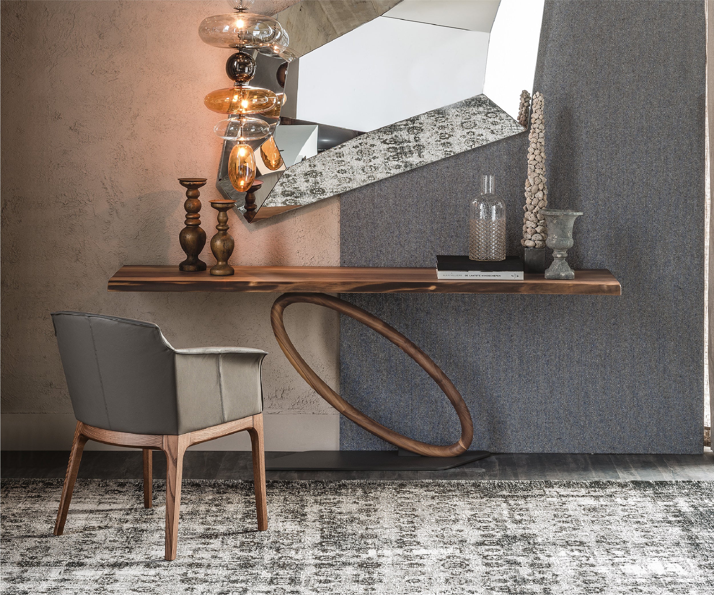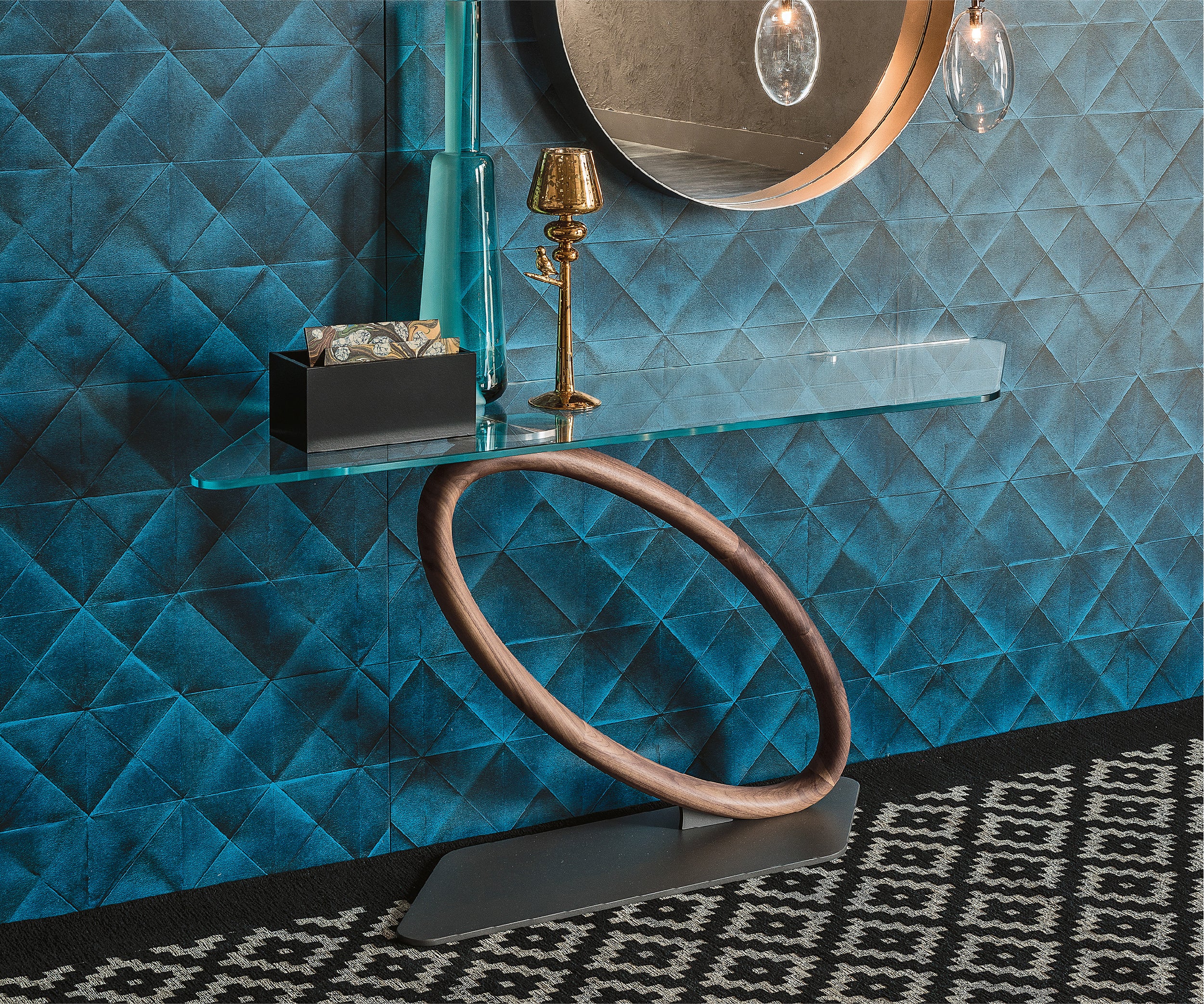 The design console Tour is a sophisticated and original piece of furniture. It is a glass or wood console table with a sculptured base that will give your home a refined touch. Tour is available with a refined glass top with an oblique cut, or a top in fine wood with an irregular edge for an agreeable natural effect. This modern console is enhanced not only by the spectacular design of the base, consisting of a solid wood ring, but above all by the quality of workmanship, materials and attention to detail that is the hallmark of Italian manufacturing.
