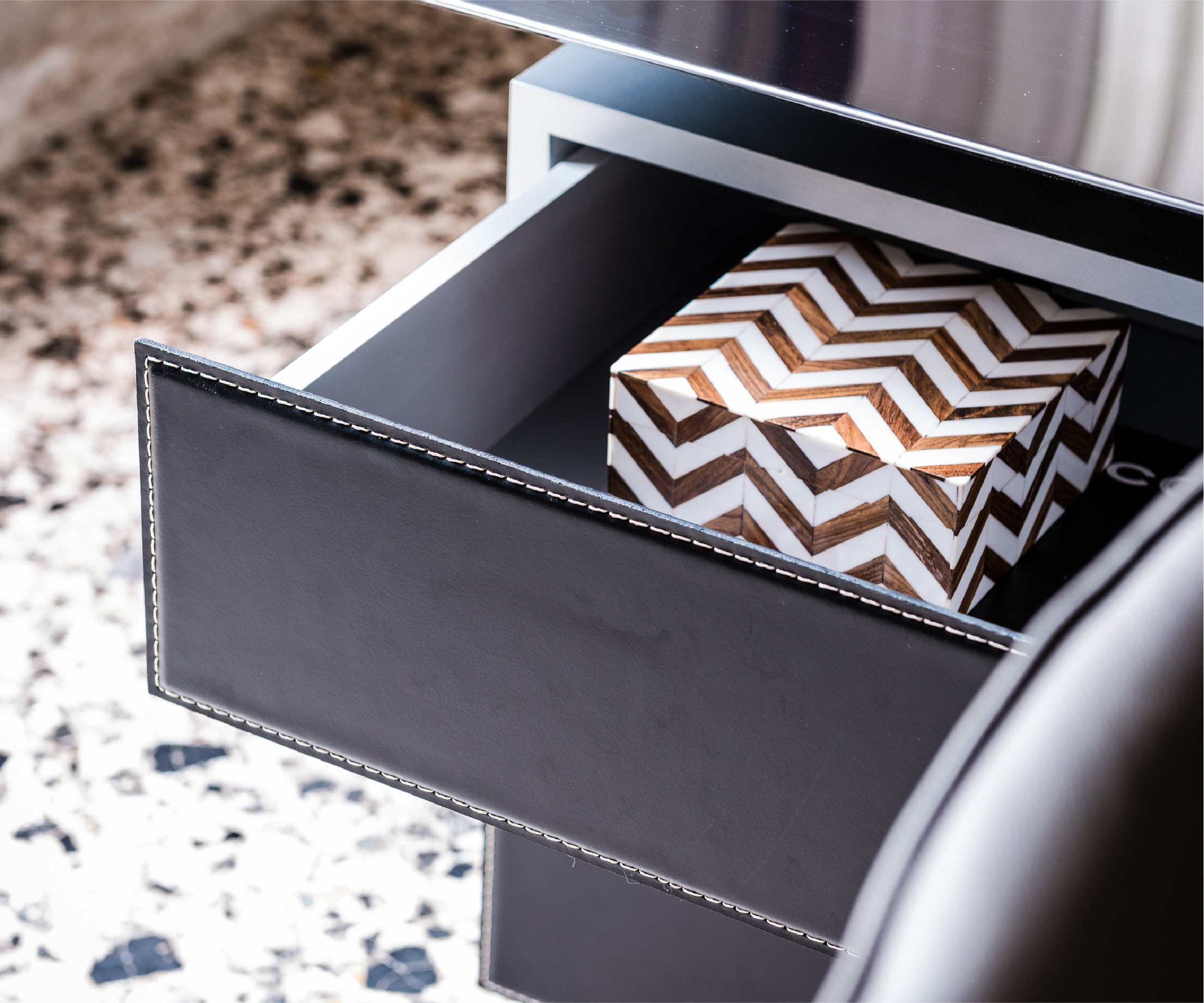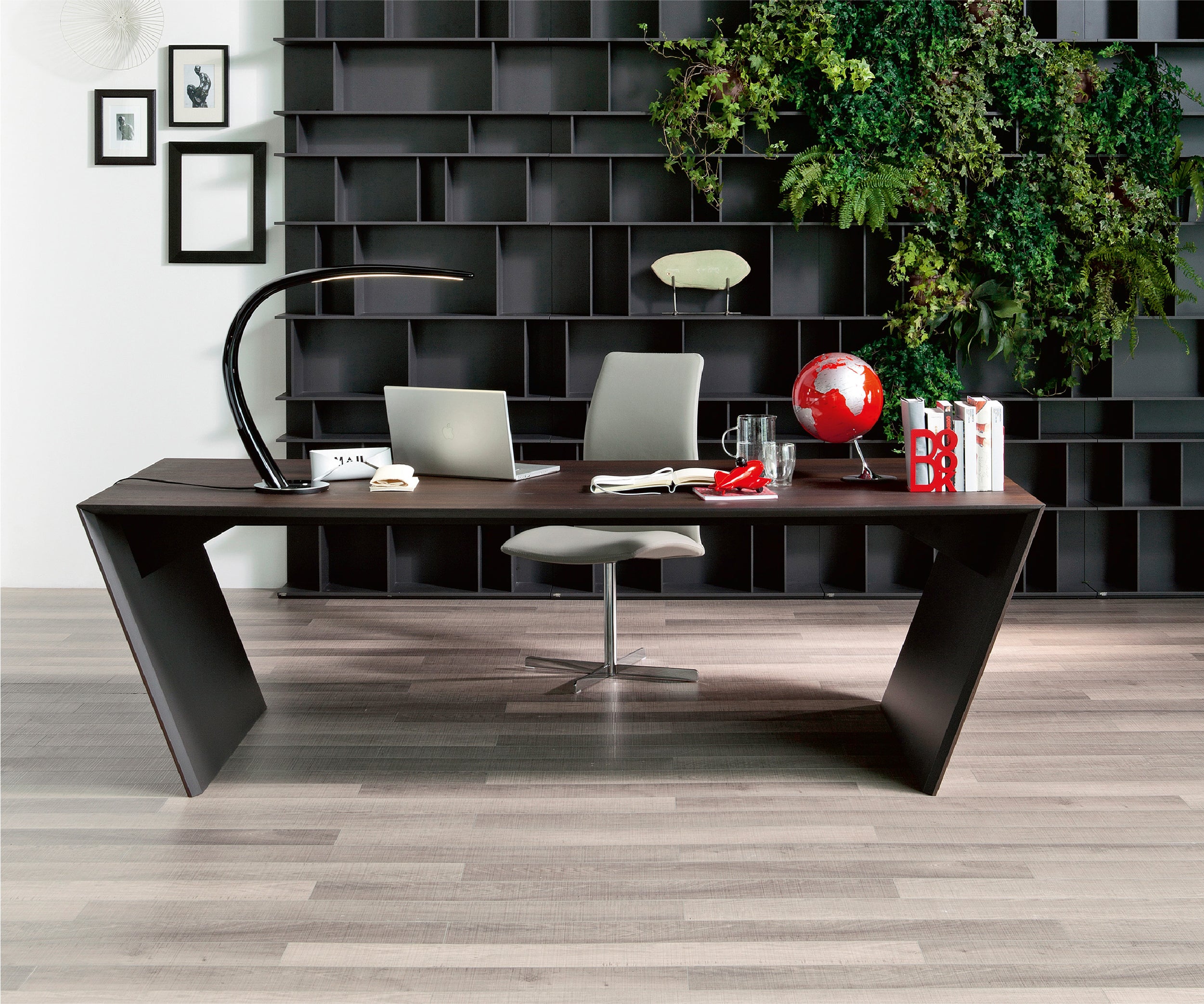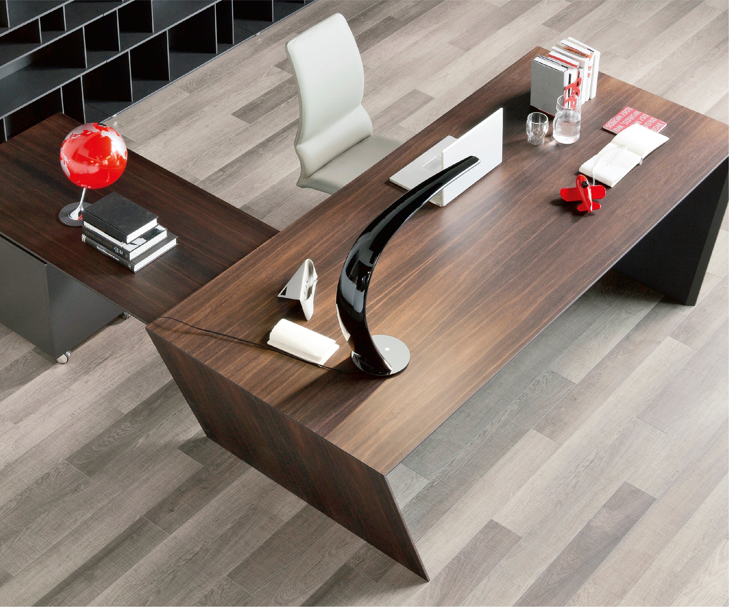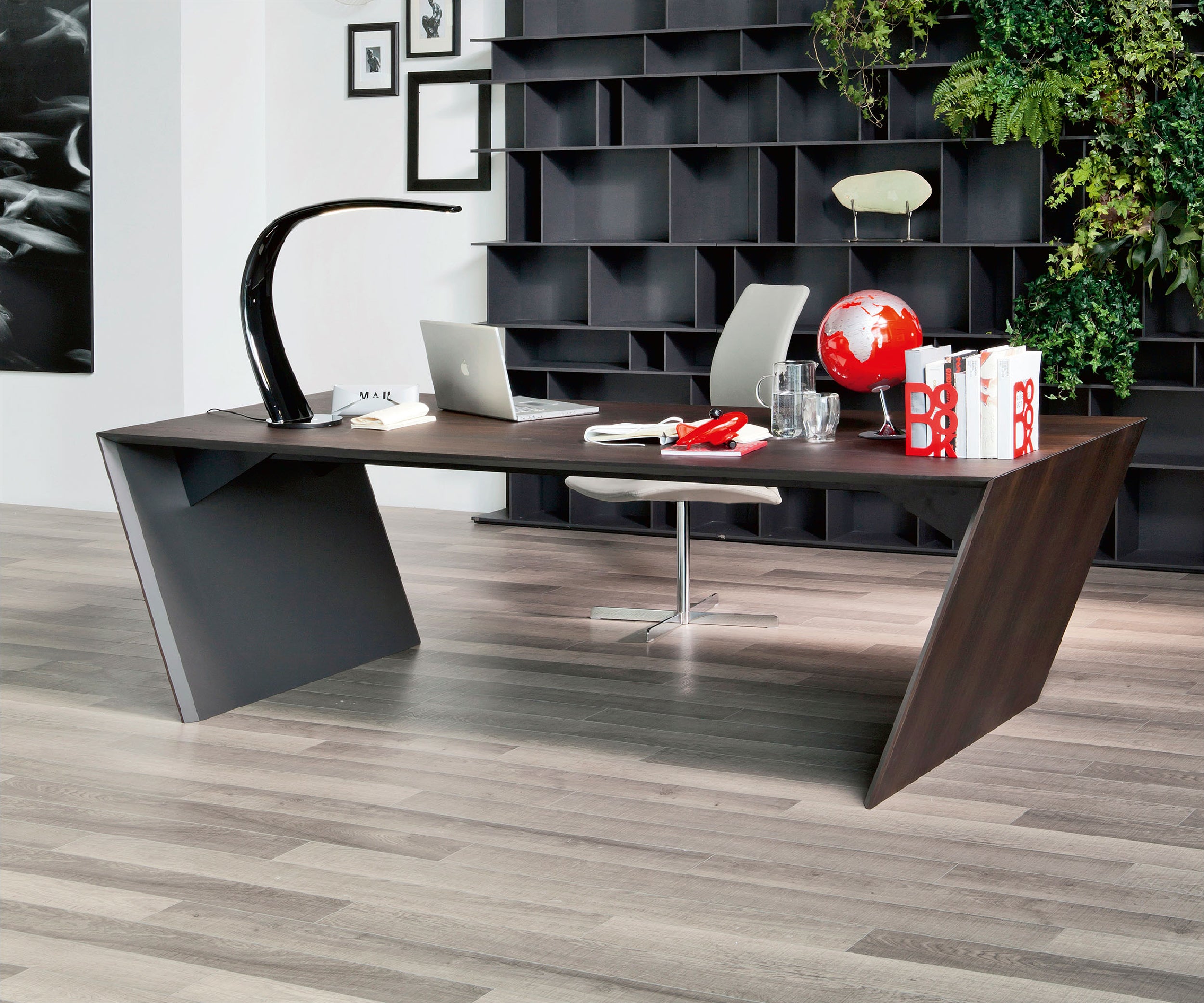 Vega is a splendid office desk designed by Giorgio Cattelan. It can be enhanced with some practical accessories that make it a functional office system, as well as an elegant modern executive desk. The structure can be in stainless steel, or covered in fine wood, while the interior is painted in matt graphite. A leather pad available in different refined colours completes the top making it comfortable and elegant. Vega can be equipped with a second surface, thus becoming an L-shaped desk on two levels. This extension is supported by a practical chest of drawers on wheels, which means you can bring the second surface closer when necessary. The chest of drawers is also a practical option also for the standard version of the Vega modern desk, without the extension. The two practical drawers are enhanced by a front in fine leather.