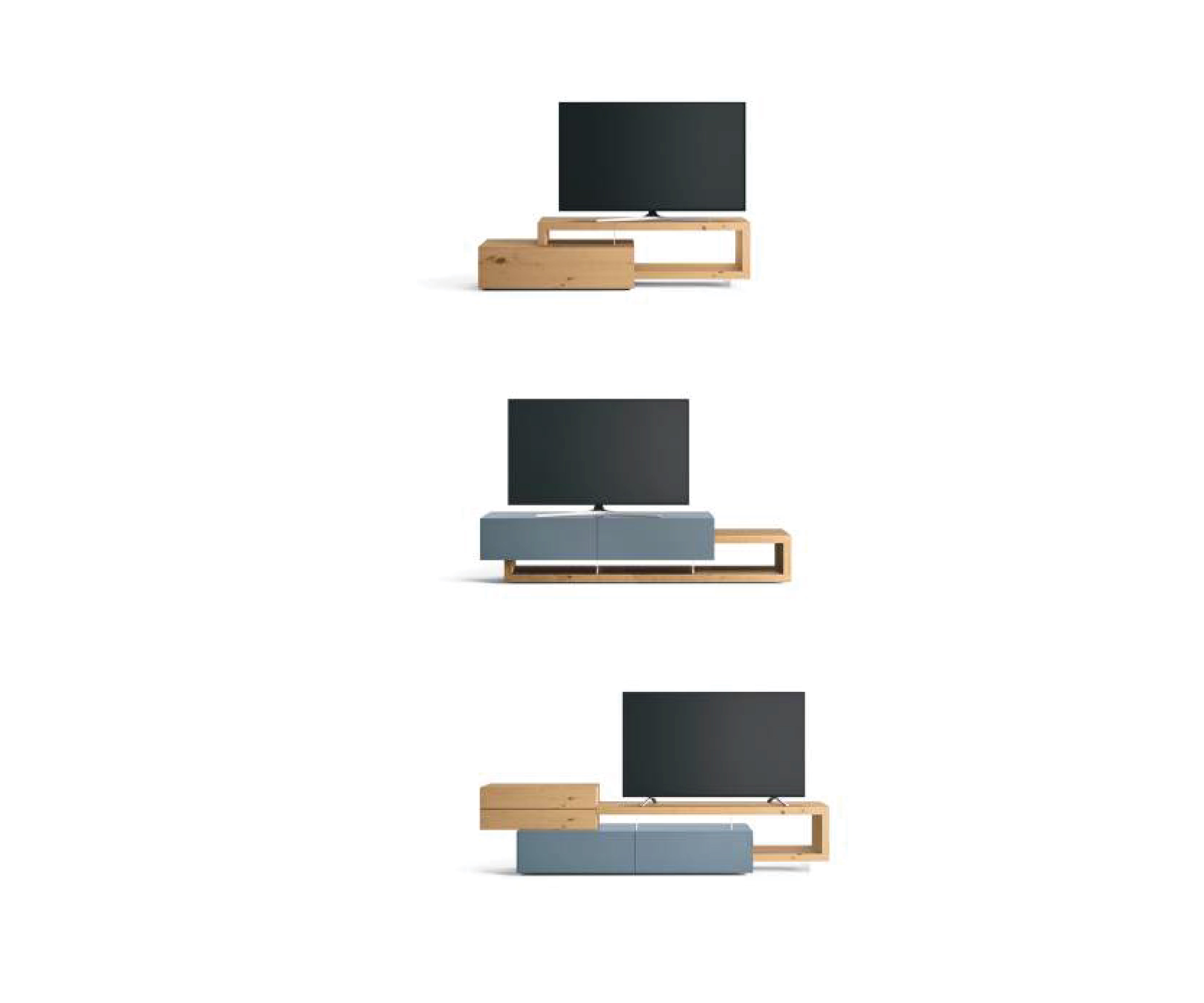 Natural tones, robust thicknesses and dynamic balances feature in this composition for the TV space, all in tones of Rovere Nodato Caramello and Brown.