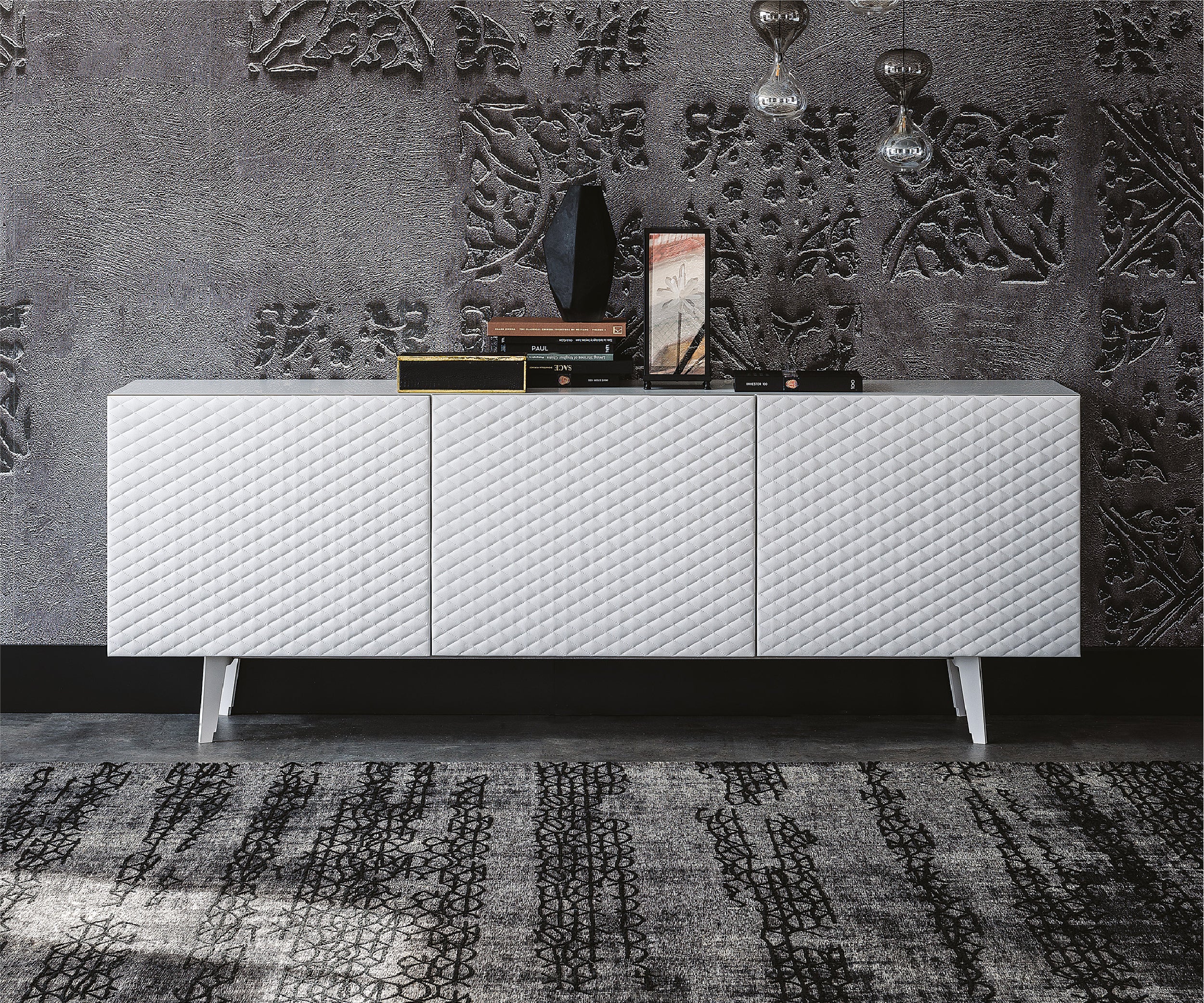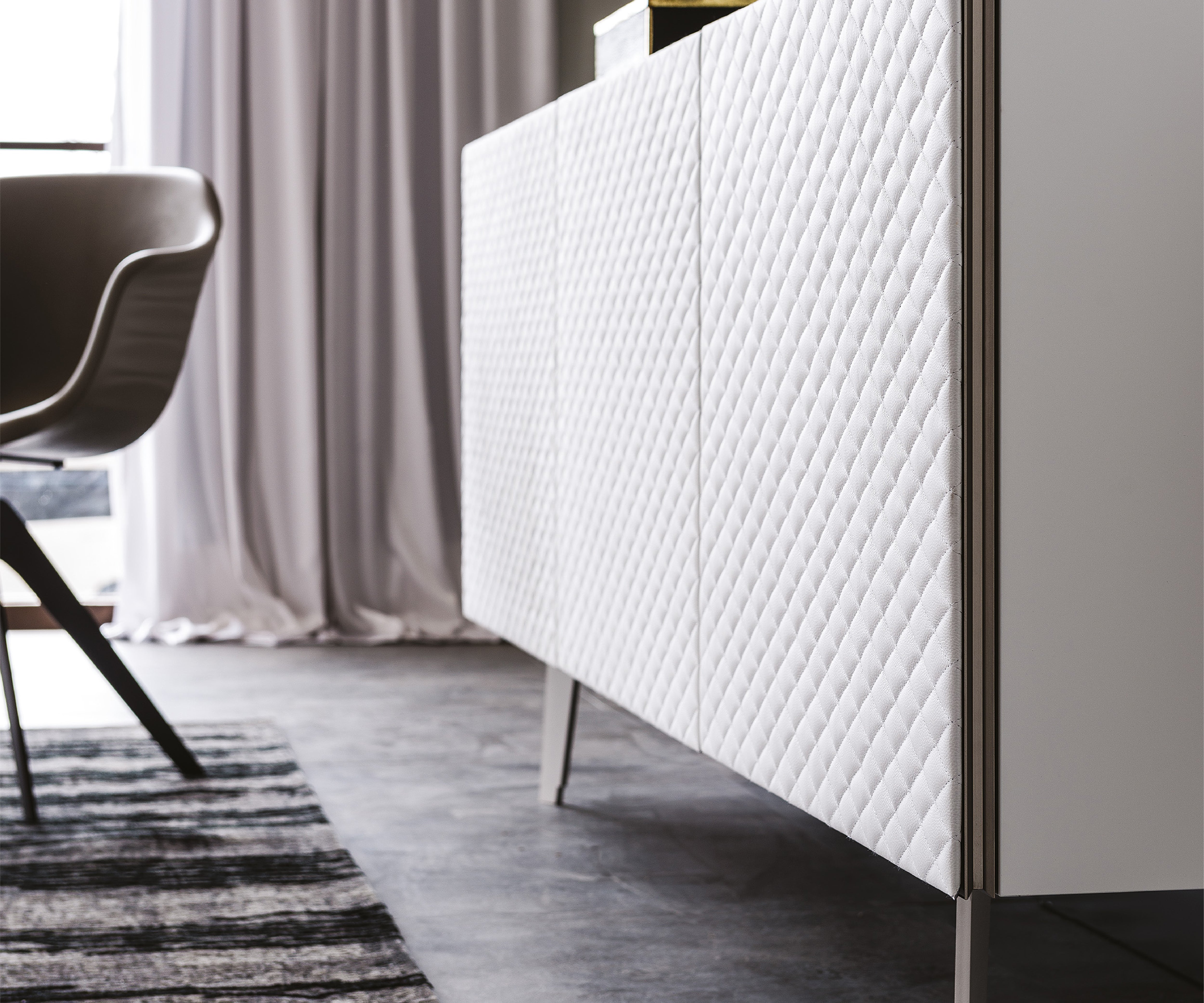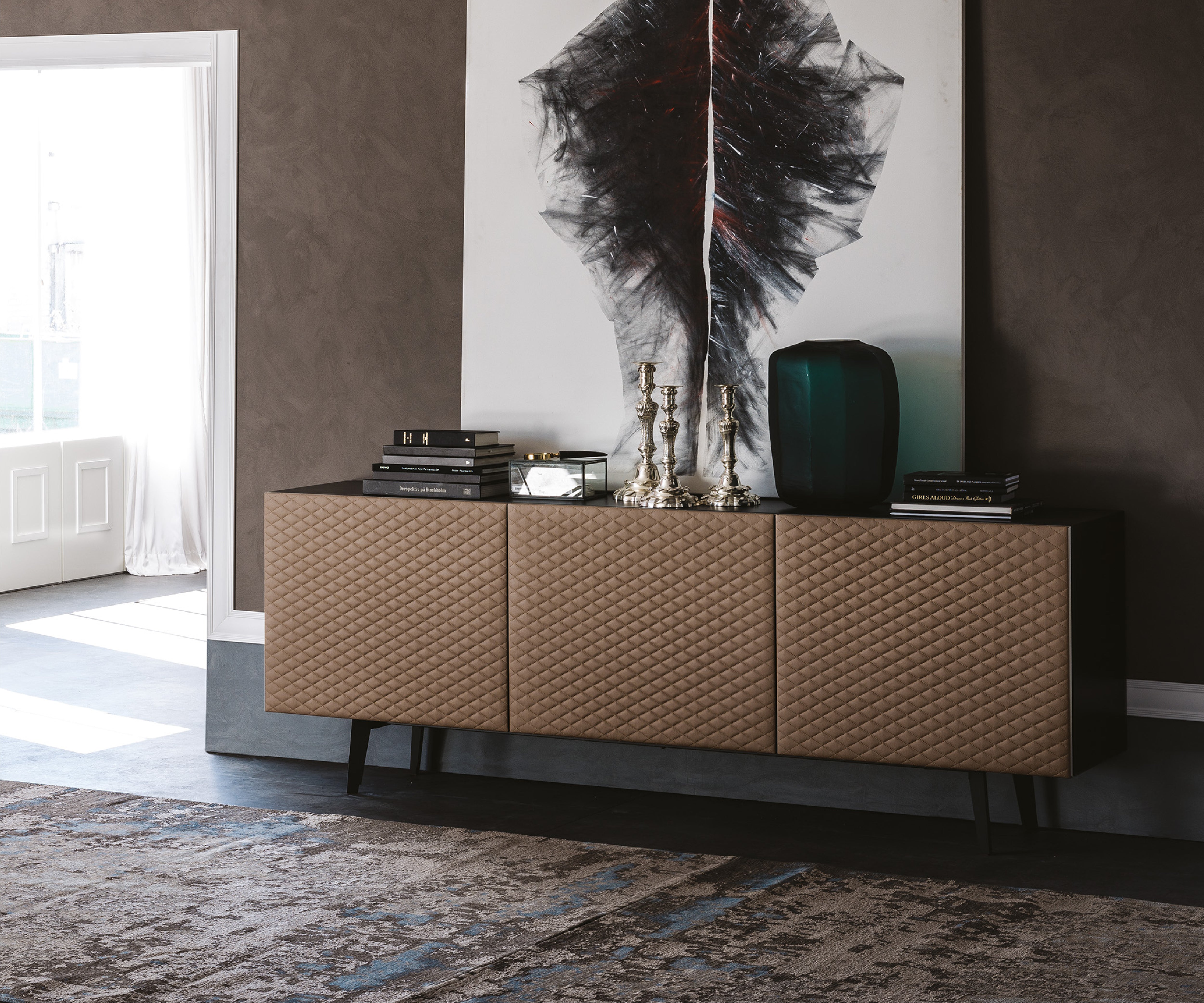 Thanks to a quilted upholstery in soft leather or synthetic leather, the sideboard Absolut makes the modern living room warm and welcoming. This design cabinet, equipped with 2 or 3 doors, is manufactured with the finest quality materials, such as the soft frontal upholstery. Choosing among different coverings and precious finishes, it is possible to customize this modern sideboard in order to adapt it to your own design living area, granting a unique style.