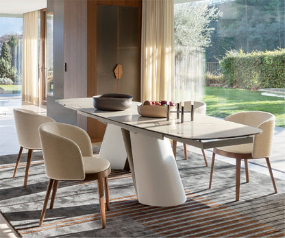 With its thoughtful proportions, the Apian table epitomises a design approach that sets great store by architectural stylishness and is underpinned by meticulously processed materials. Its airy aesthetic draws inspiration from the sheet metal bent into a semi-cylindrical shape and gently slanted upwards, creating a sharply defined base upon which the manually-extendable top rests (two side leaves mean that Apian can be pulled out to a length of 3 metres in total). One delightful detail on the pedestal base is the coating on the double sheet metal which catches the light and throws it back on an area that would otherwise be in dark shadow. Apian is one of those distinctive pieces that will instantly turn around an interior-design project.