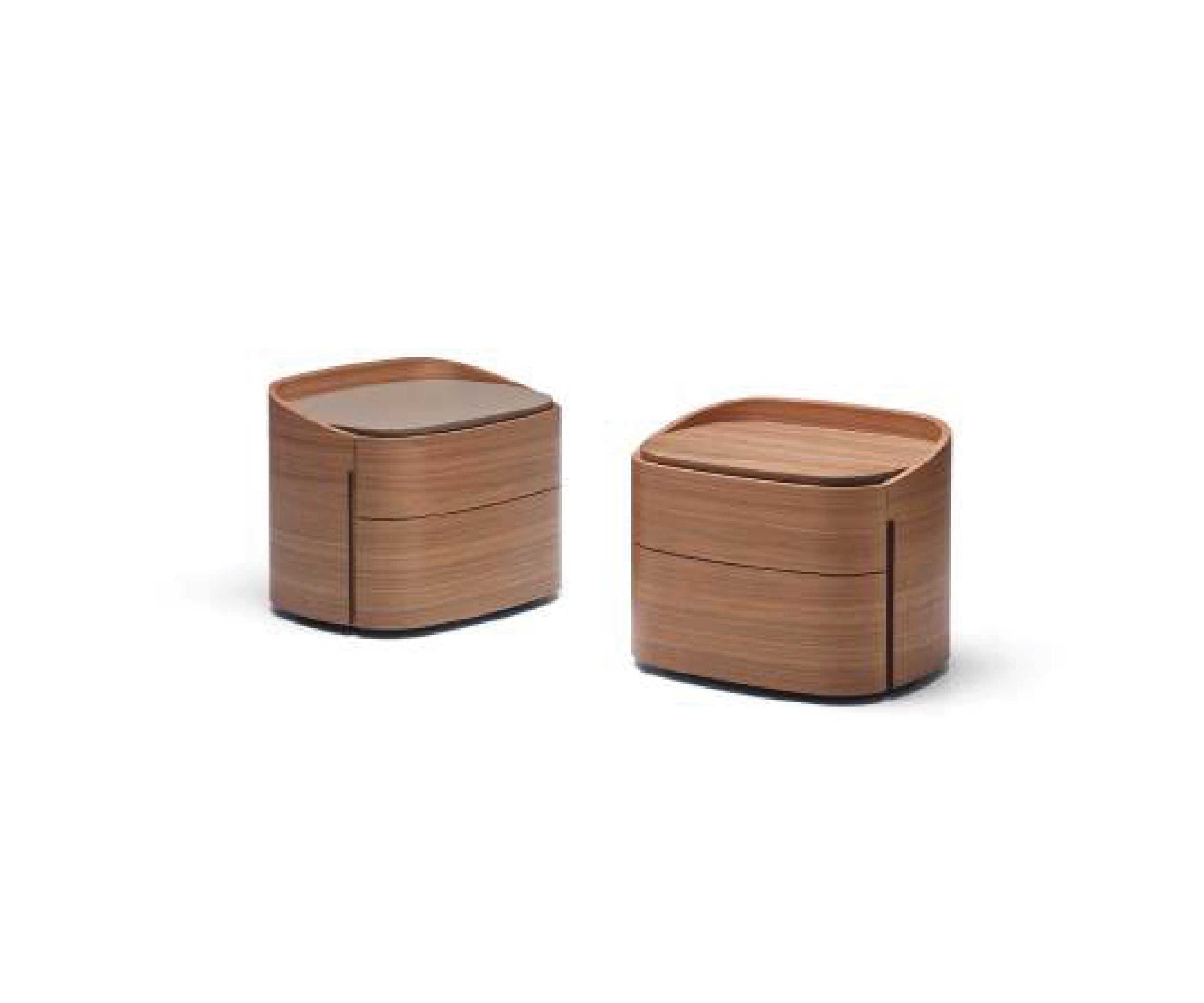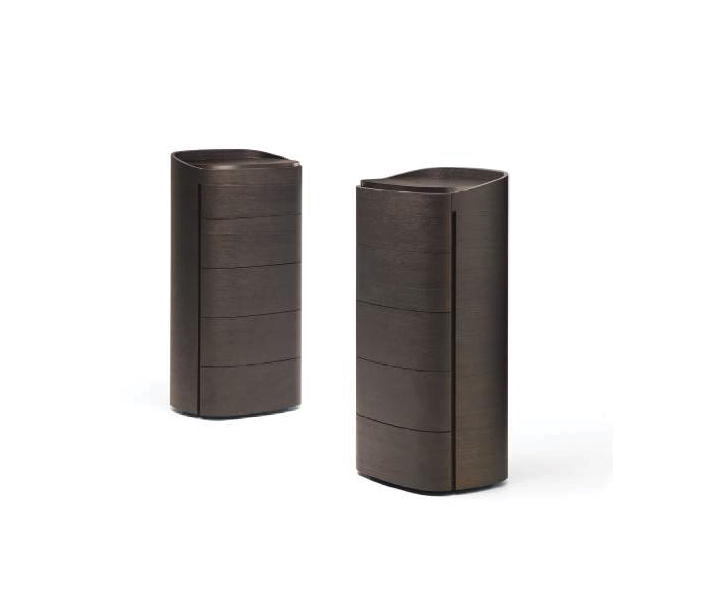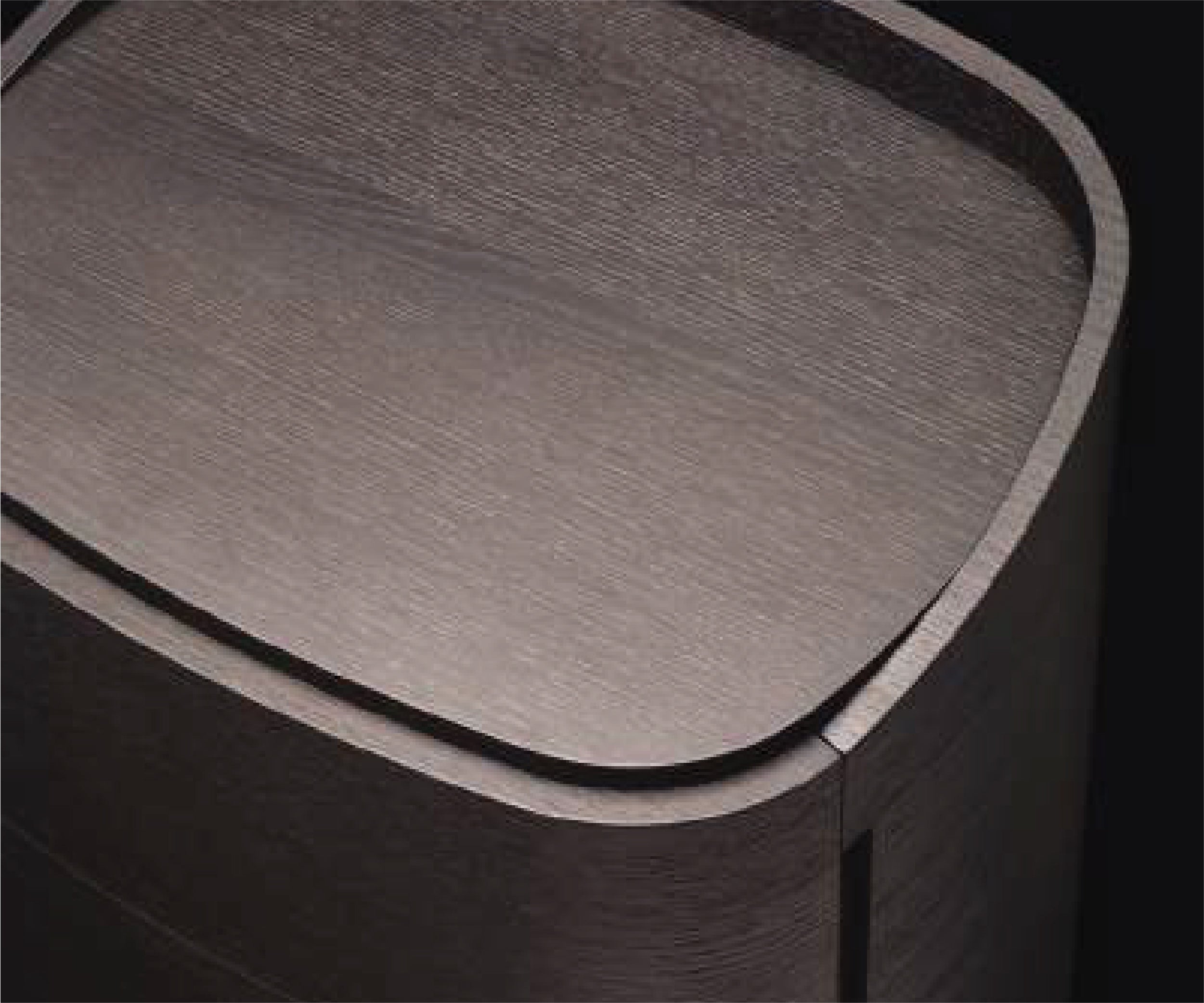 Babila storage units are distinguished by their roundness and the upper profile raised above the top, whose thickness is evidenced as it protrudes from the edge of the top drawer. The vertical grip profile for opening the drawers is another special feature of this project, in which the wood veneer wraps the unit in an uninterrupted embrace.