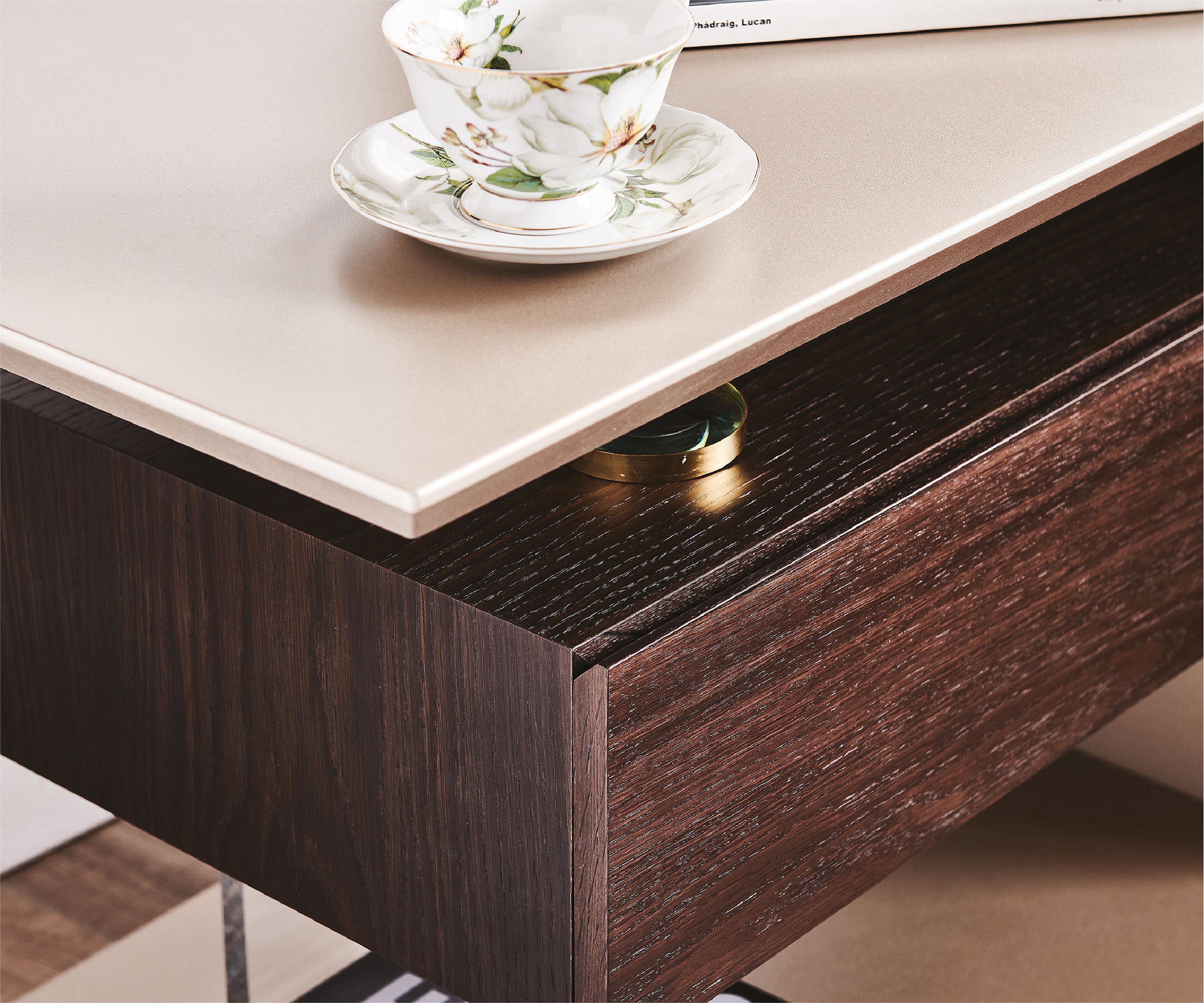The Biagio designer nightstand combines geometric shapes and different materials, forming a unique and functional modern nightstand. The external structure is made of lacquered wood, while the drawer showcases the exquisite natural wood. The transparent methacrylate below acts as a refined base, dividing the lower shelf into two compartments.The bedroom collection by Cattelan Italia consists of modern nightstands and designer double beds. It has been created to complete a modern bedroom with charming design pieces.