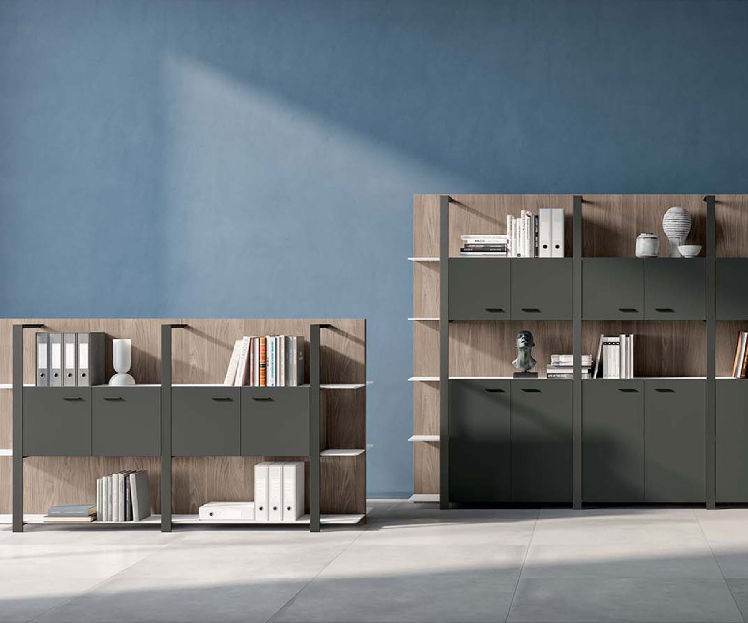 The wood panels are functional for storing personal objects and documents, such as binders, books, catalogues and samples. They can be a useful piece of furniture in different contexts, for example in an open space, in an executive office to complete the desk or behind a reception.