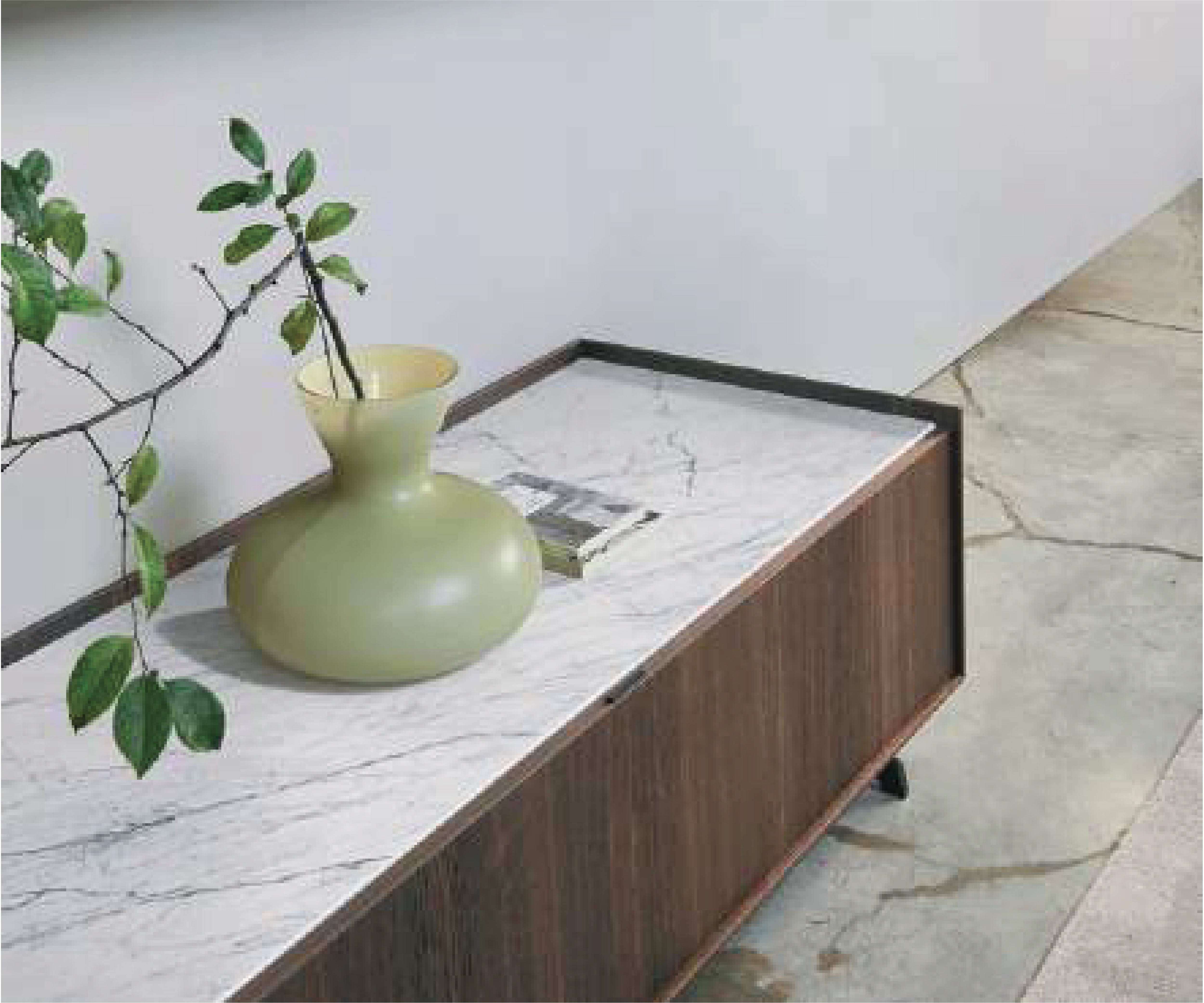 Cabaret features a top with a distinctive aesthetic, in which the 10-mm-thick edges are raised on three sides. With interplaying volumes and glass-topped open compartments, the possibility to create units of different heights (H 160/240/320/400 mm) and the option to attach raised feet, floor-level feet or to mount it on the wall, this is a highly versatile design suitable for any setting.