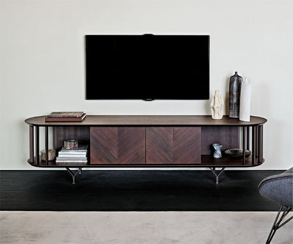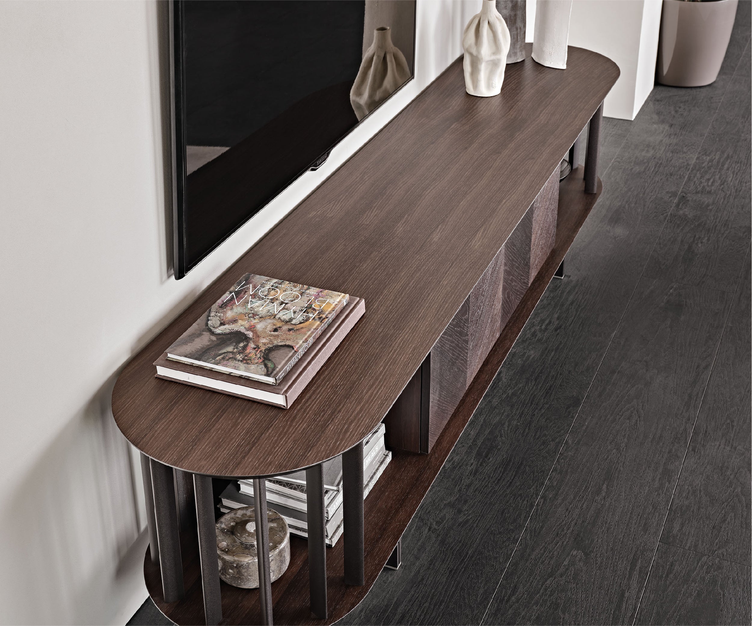 This modern wooden TV stand created by Tosca Design is rich in details yet at the same time reproduces a plain and minimalist aesthetic. The curved open sides are interspersed with vertical metal inserts, which give rhythm to the composition and allow a glimpse of the internal glass shelves. But the real detail that differentiates this modern TV stand is the refined foot, composed of two metal elements forming a Y that rests gracefully on the ground. The wooden doors are made with diagonal slats that highlight the attractive natural grain of the wood. Costes also comes in the 2 or 4-door sideboard version, to adapt naturally to any space in the home. The style is refined but balanced: the result of the meticulous attention to detail that distinguishes Italian manufacturing. The internal shelves in smoked glass are designed to preserve and enhance the most precious objects stored within this seductive design sideboard.