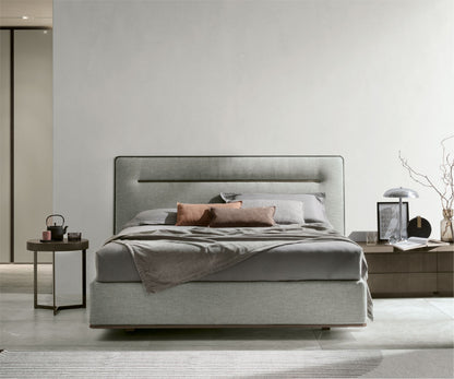 The wood mocha oak structure of the Dorian bed is coordinated with the finish of the Morfeo bedside unit while the upholstery fabric is in a light shade:different colours and textures create a charming visual and tactile effect.