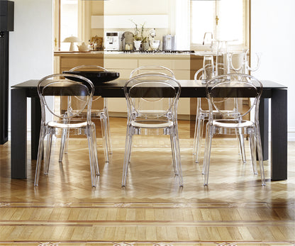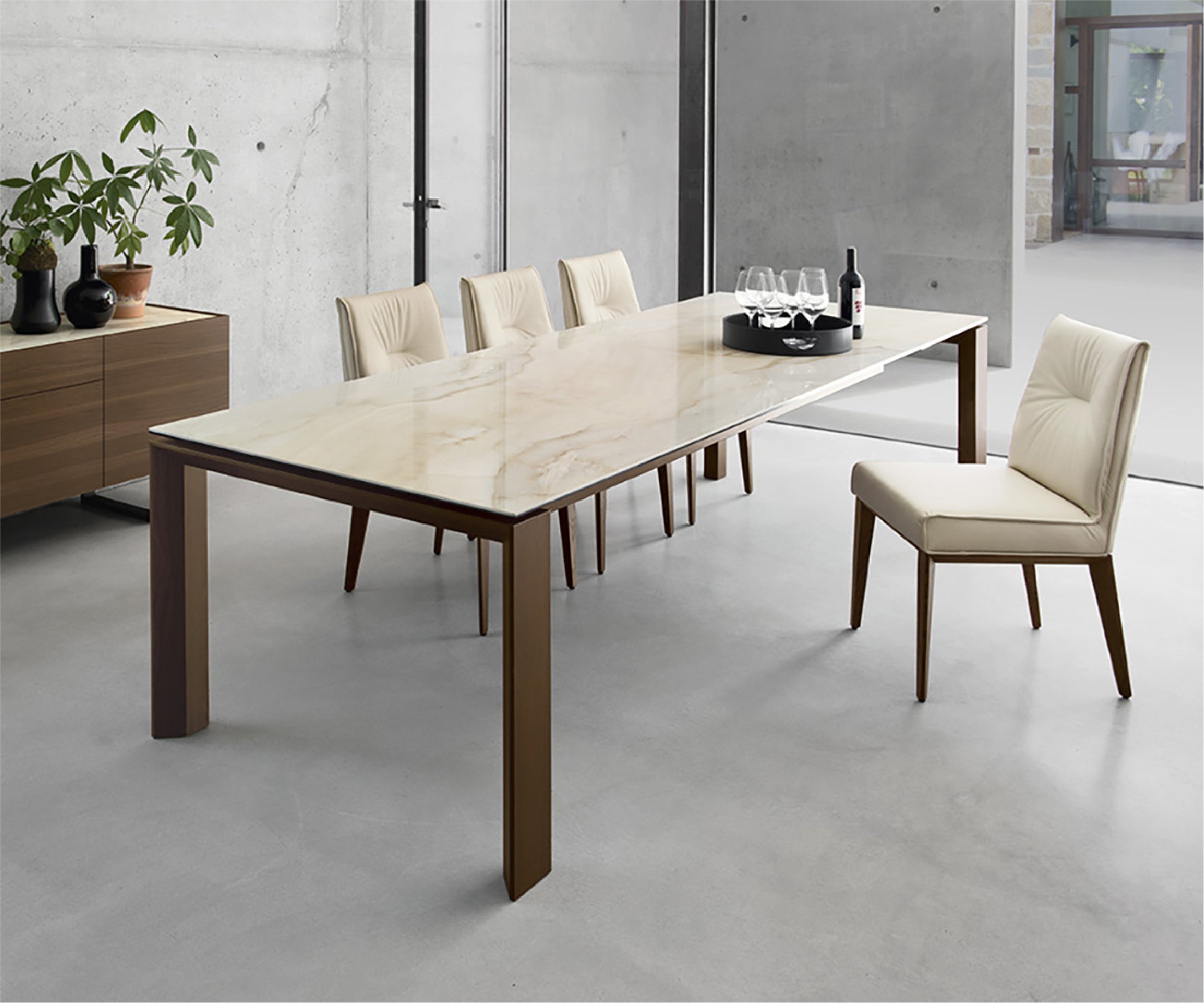 The OMNIA table contains an ingenious mechanism able to expand the top surface. Pull the frame towards you so that the two legs with hidden castors slide on one side allowing the leaf to be pulled out. With a simple rotation the leaf fitted on metal tracks comes out of its housing and lines up with the top. The perimeter legs have a slanting cut in the inside part, a distinctive detail in the aesthetics.