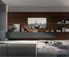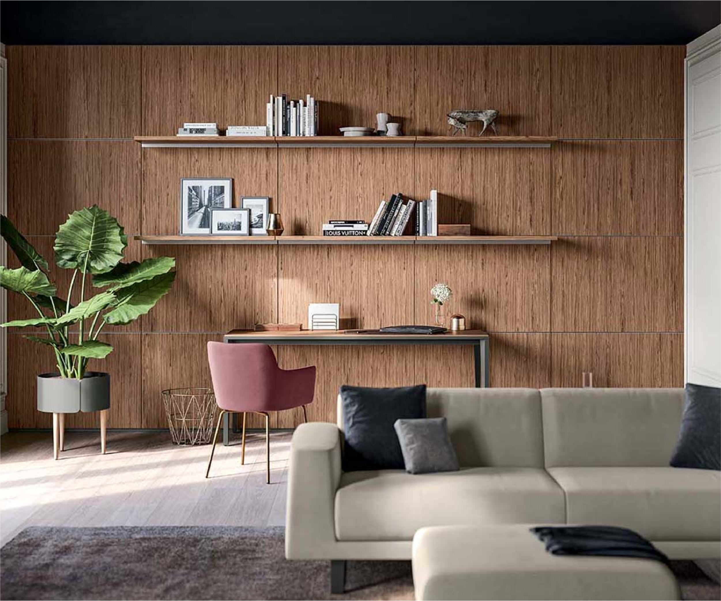 Boiserie P1 is an advanced and customisable furnishing solution: the panels are available in different melamine finishes or in lacquered wood and can be alternated with other furnishings to decor for example, a TV area of a living room, the wall of a home office or a bedroom.